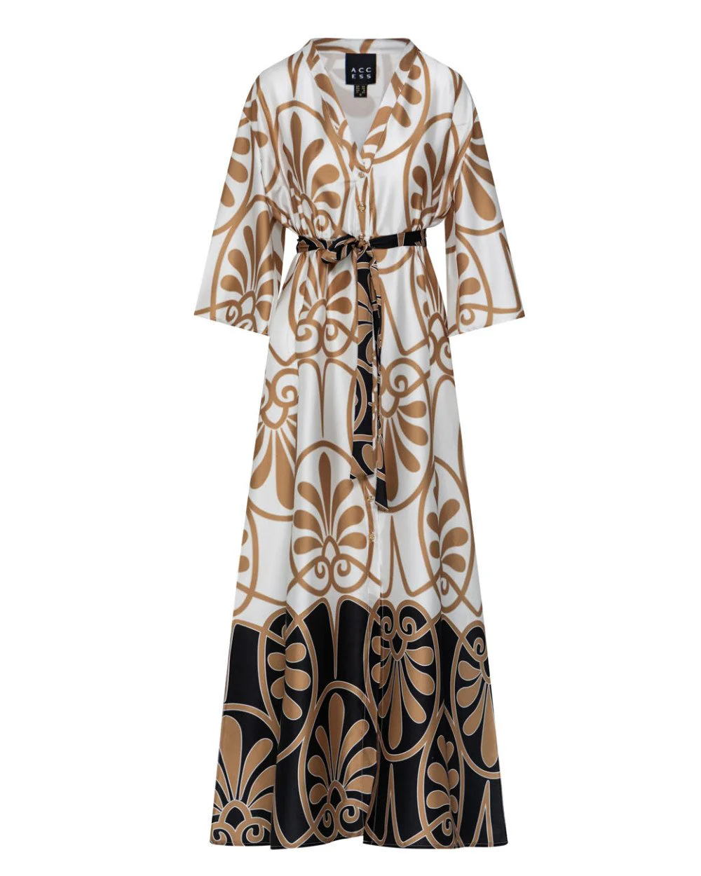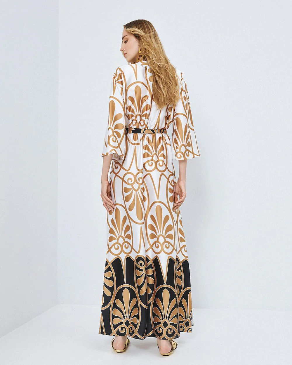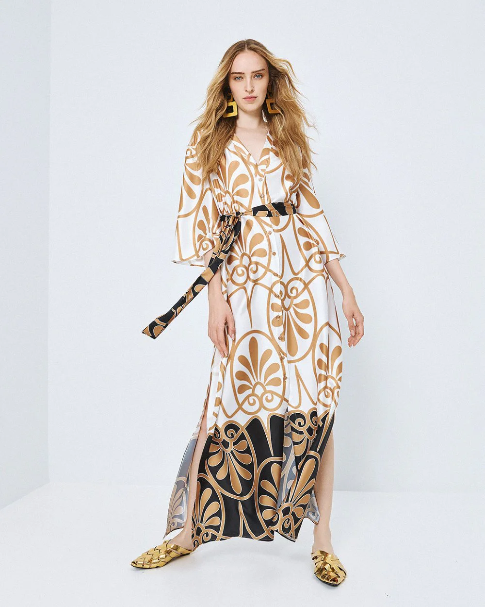 Printed satin maxi dress with a v-neckline and 3/4 bell sleeves. Features an elastic waistband, side slits and front button closure.