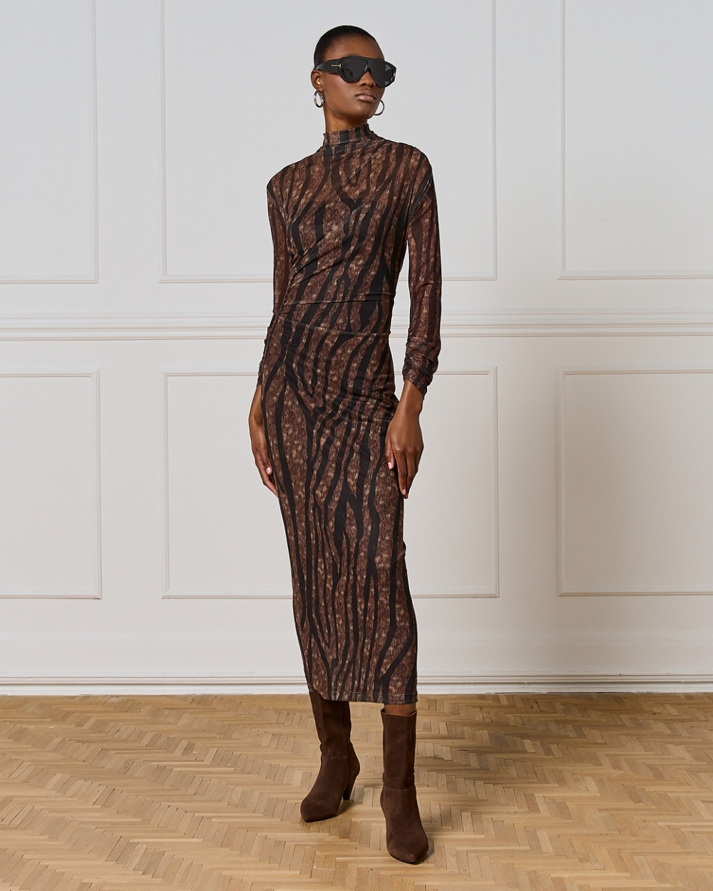 Midi printed tulle dress with an inner lining and ruching. It features long sleeves and a high neck. It is an ideal choice for modern and stylish looks.