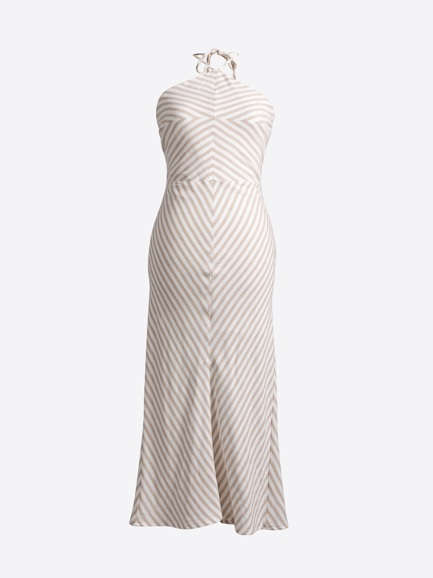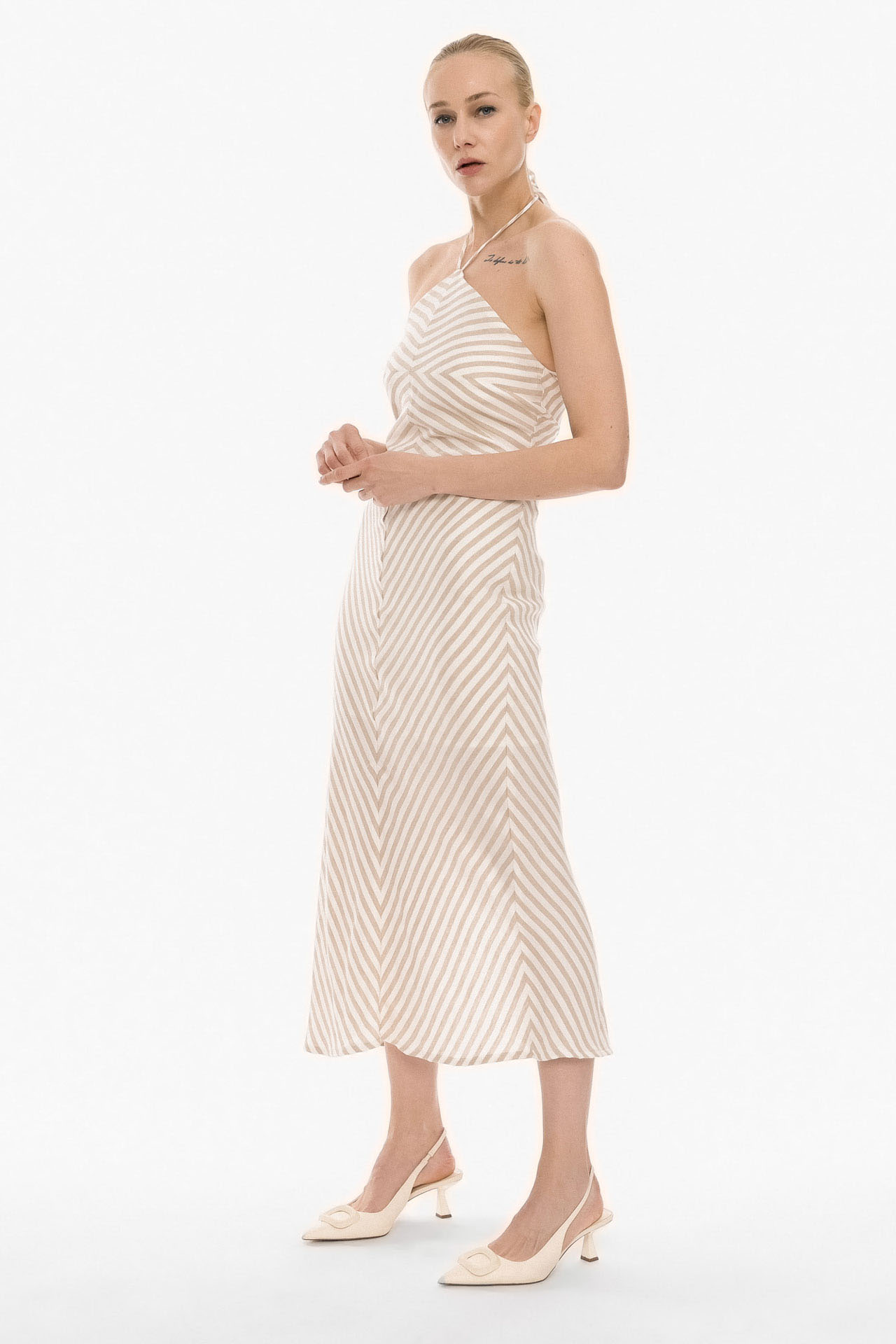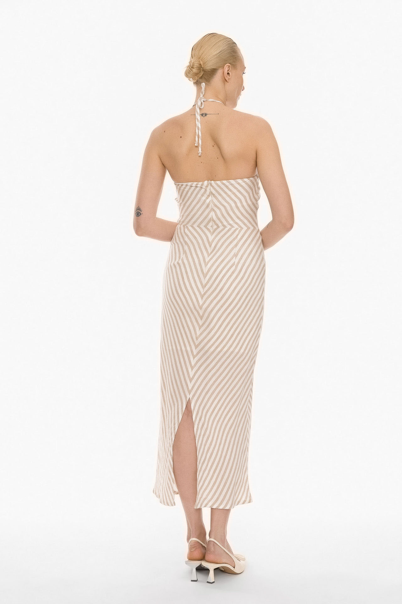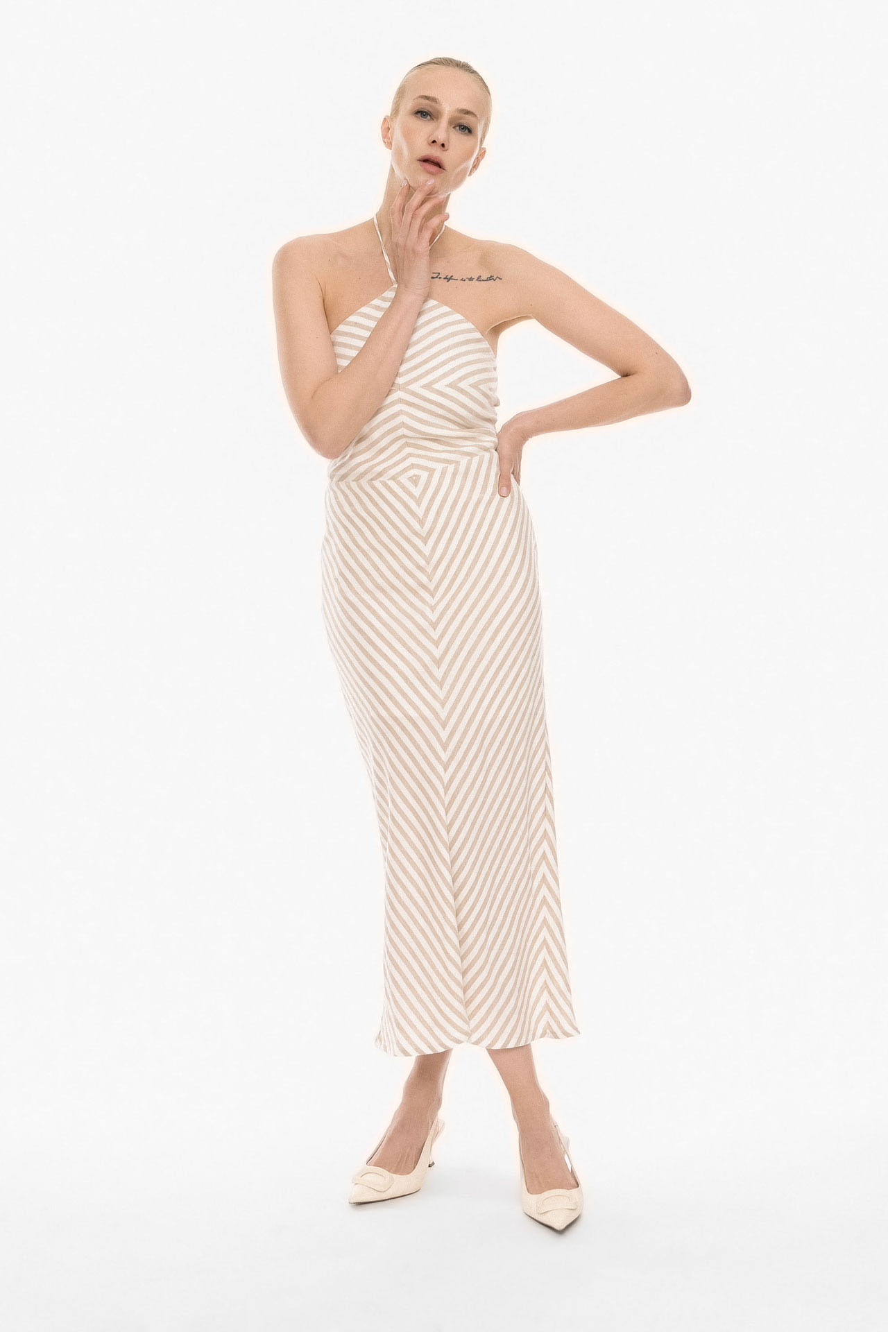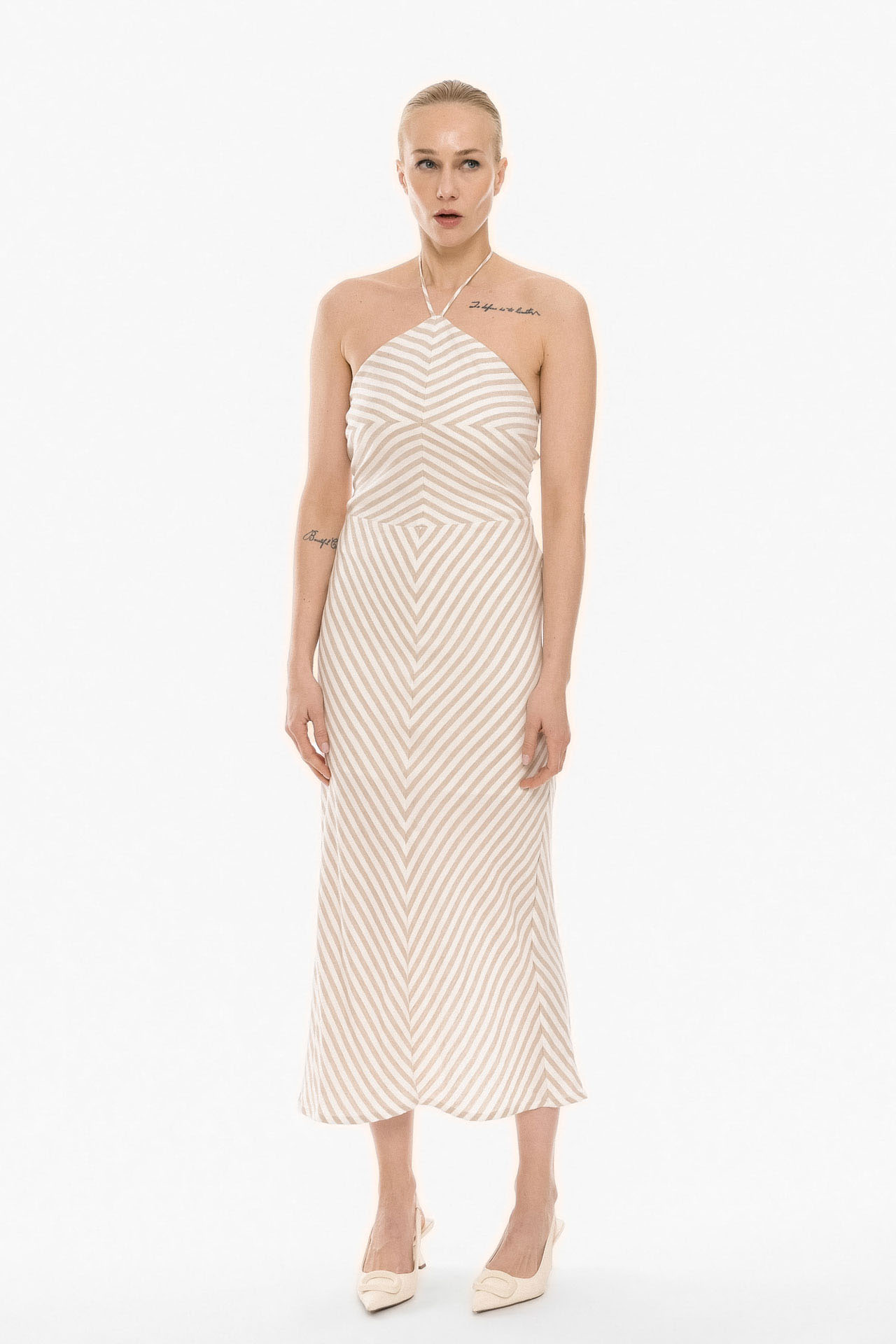 A sleek and contemporary piece that flatters the body with its clean lines and refined shape from 4Tailors. The diagonal stripes and halter neckline create a sophisticated look, while the flared hem and back slit add movement and effortless elegance.