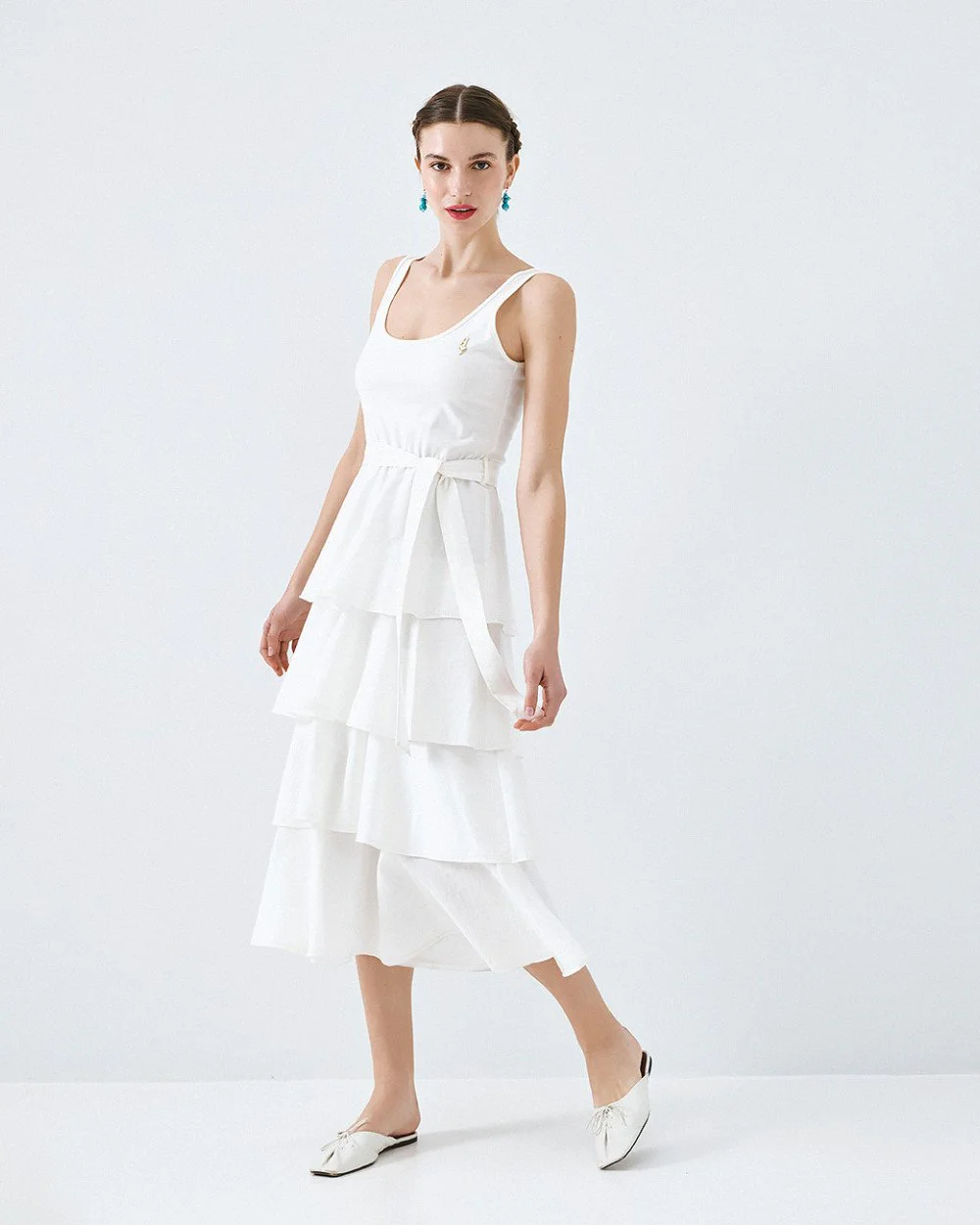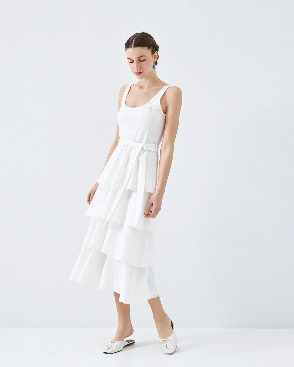 Midi sleeveless dress with a round neckline, an elastic waistband and ruffle details. Features a metallic monogram on the chest, belt loops and a detachable tie belt.