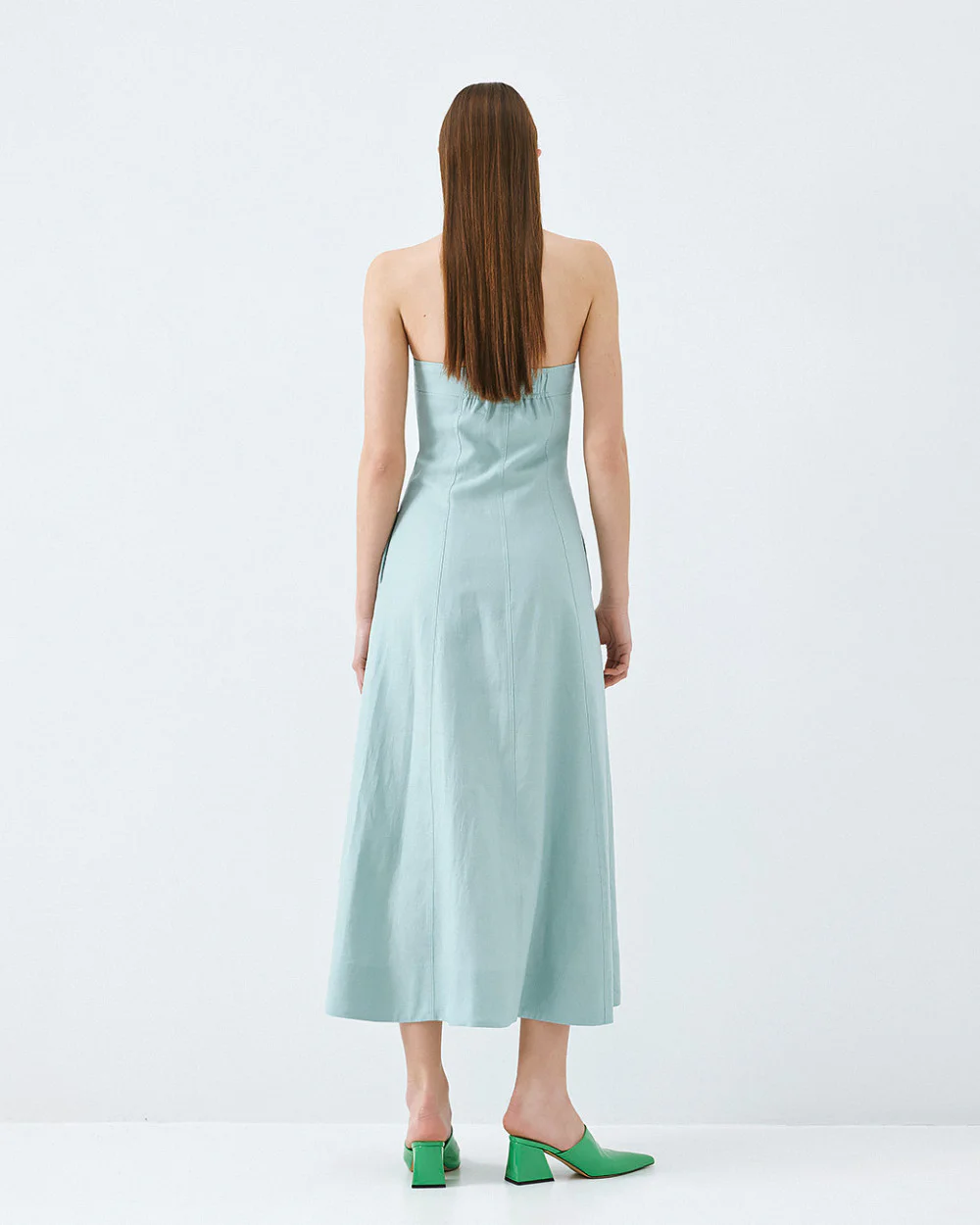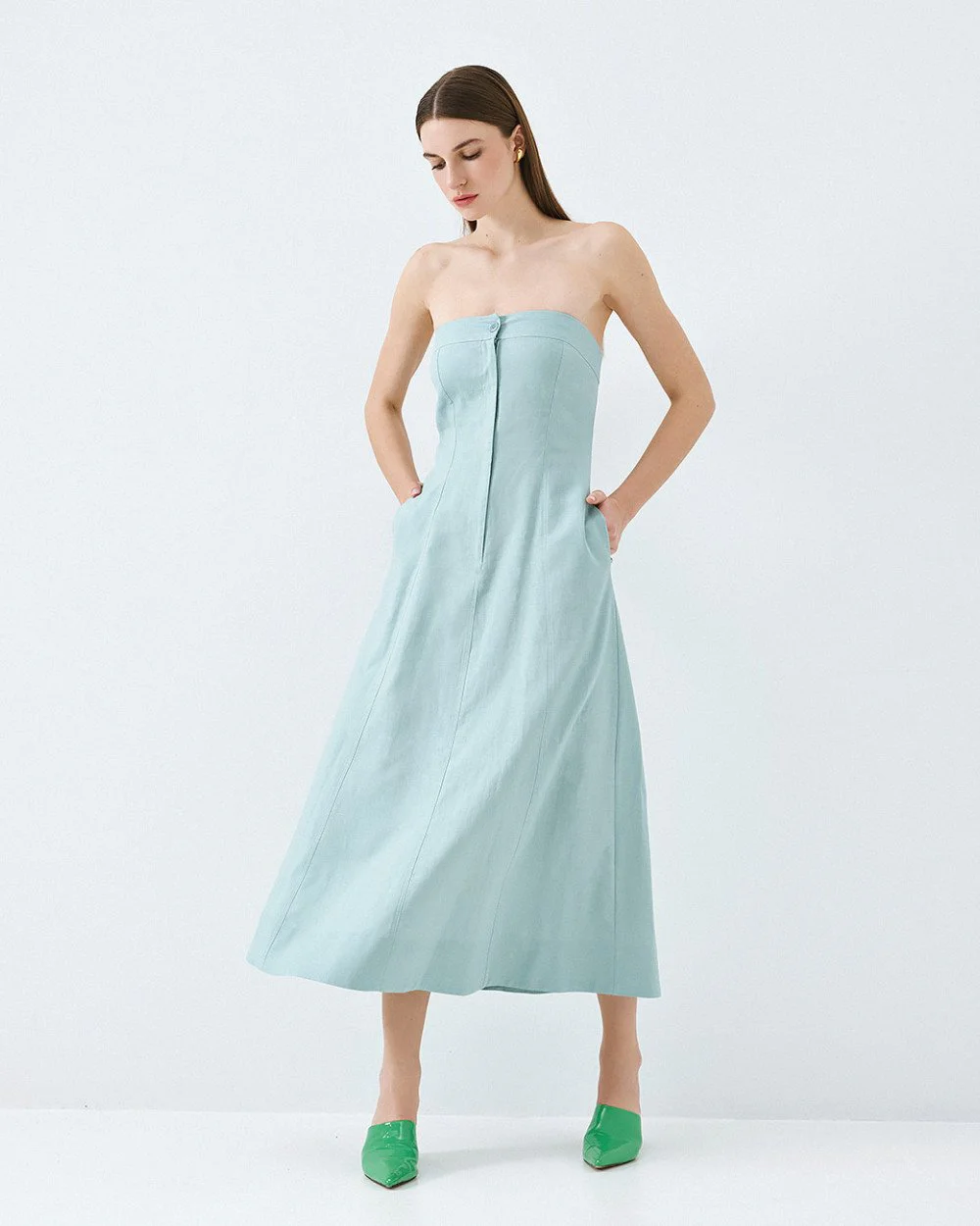 Midi strapless dress with side pockets and decorative seam details. Features an elasticated back and a front zip and button closure.