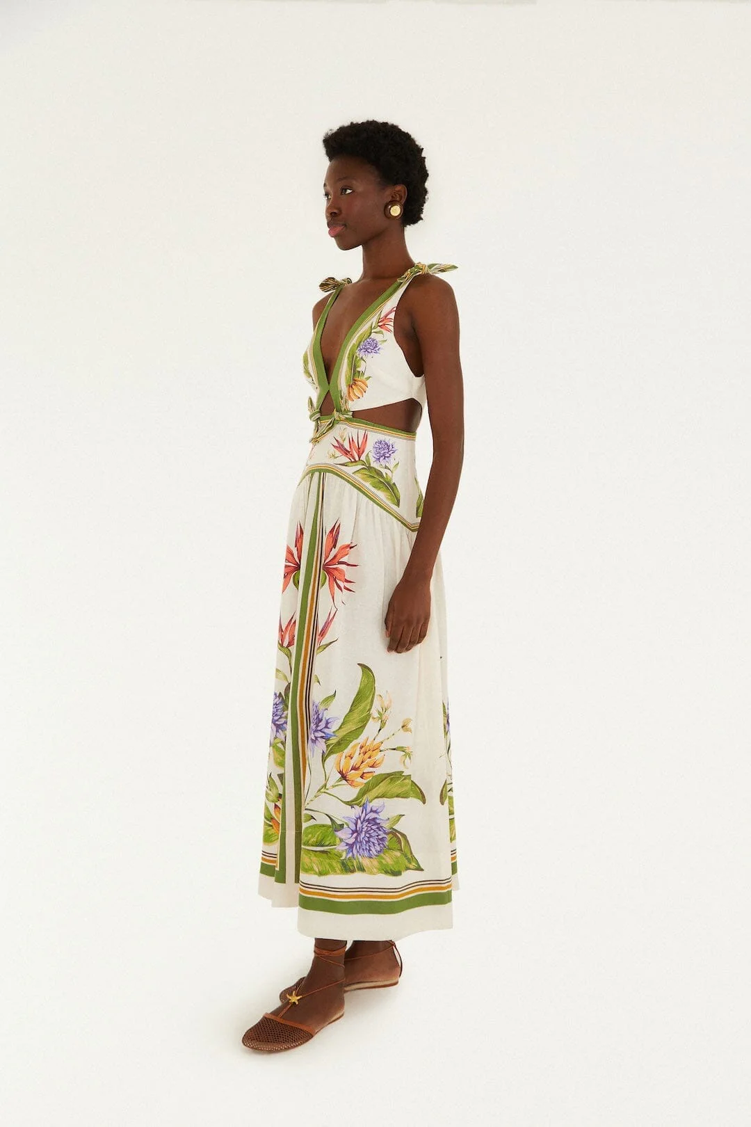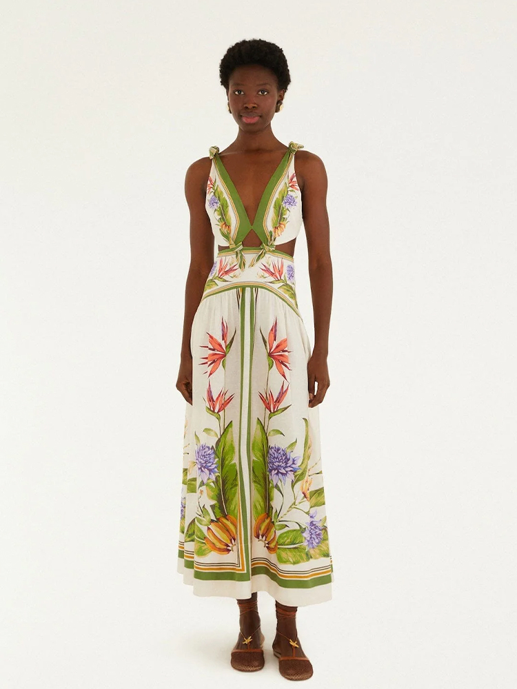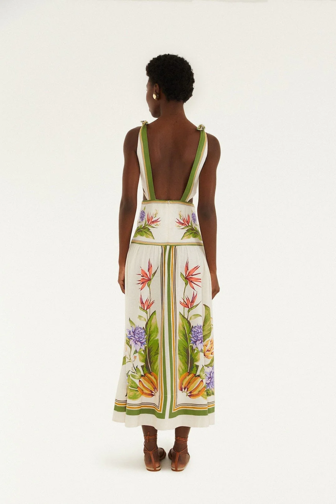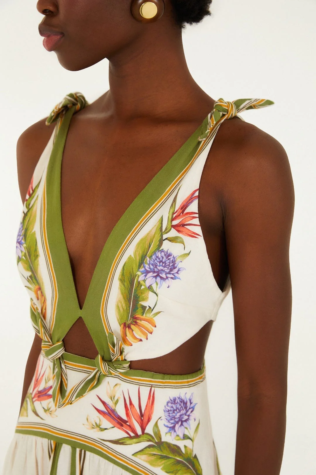 Embrace vibrant warmth with the Sand Tropical Scarf Maxi Dress by FARM Rio. Its fluid silhouette gently skims the body, enhanced by a playful V neckline that invites effortless elegance. Crafted from responsible Euroflax and Lenzing Ecovero fabrics, the dress showcases tropical-inspired patterns in sunlit hues, bringing a sense of joyful rhythm to every step. Light and breathable, it’s a celebration of softness and sustainable style.