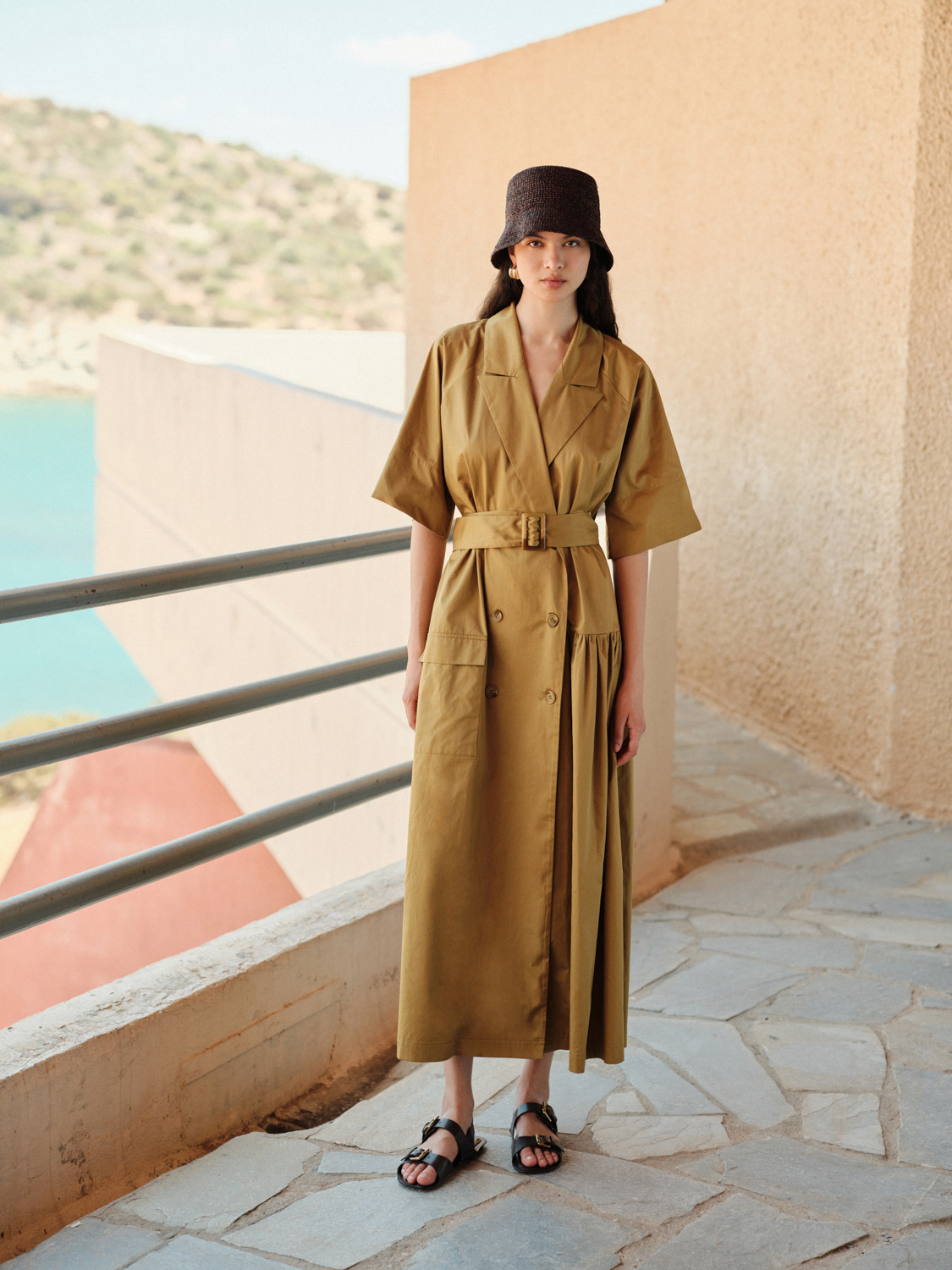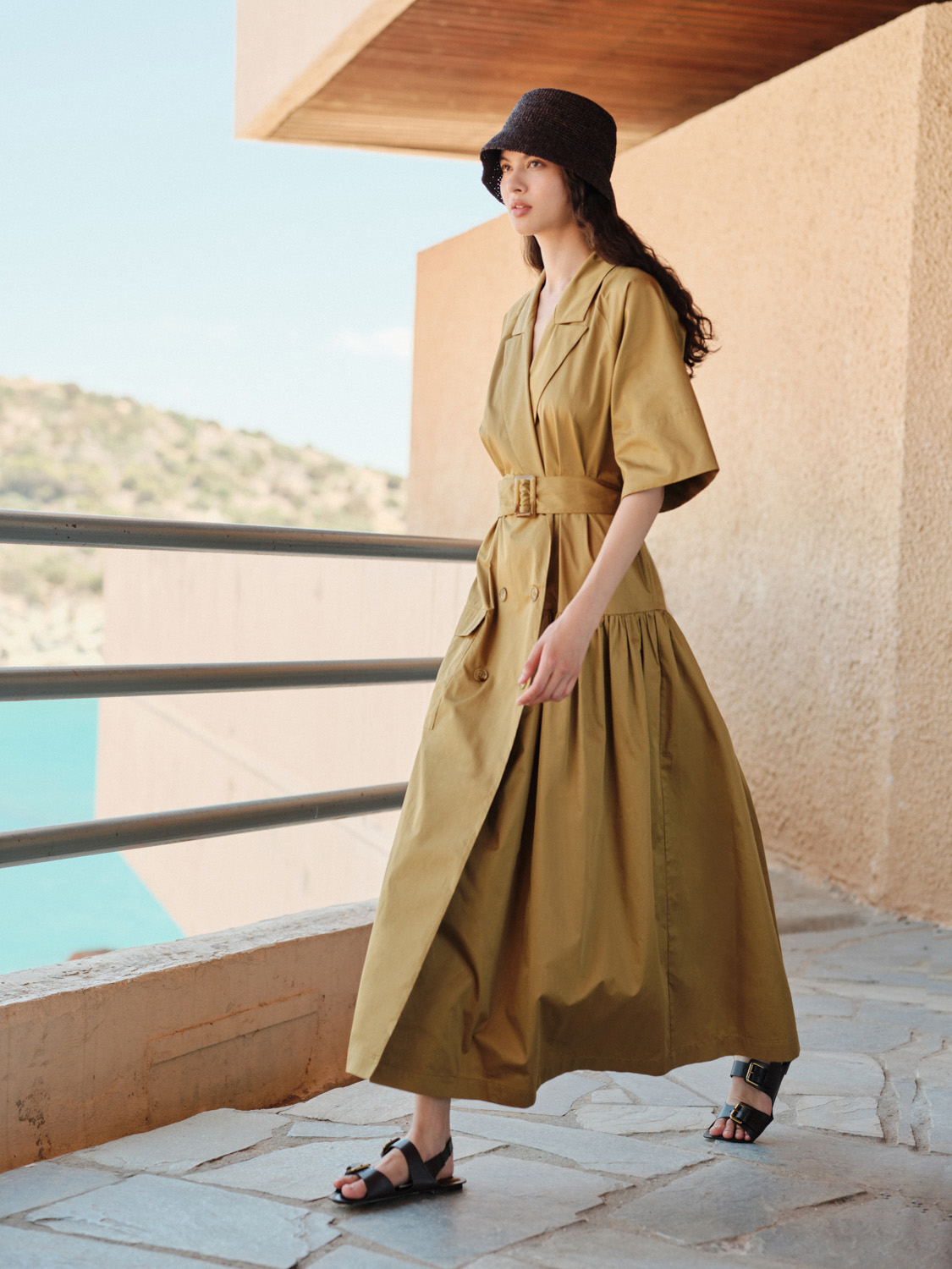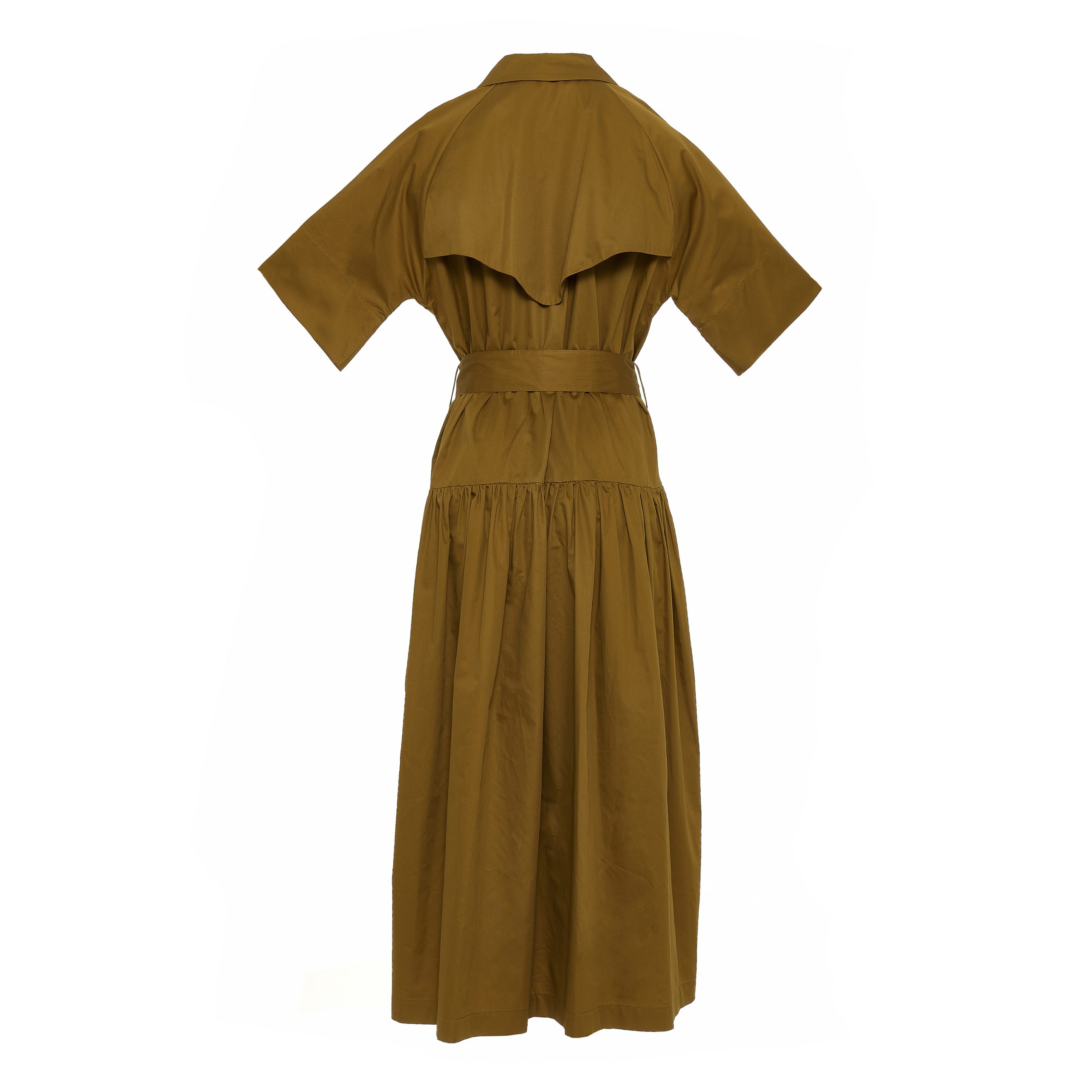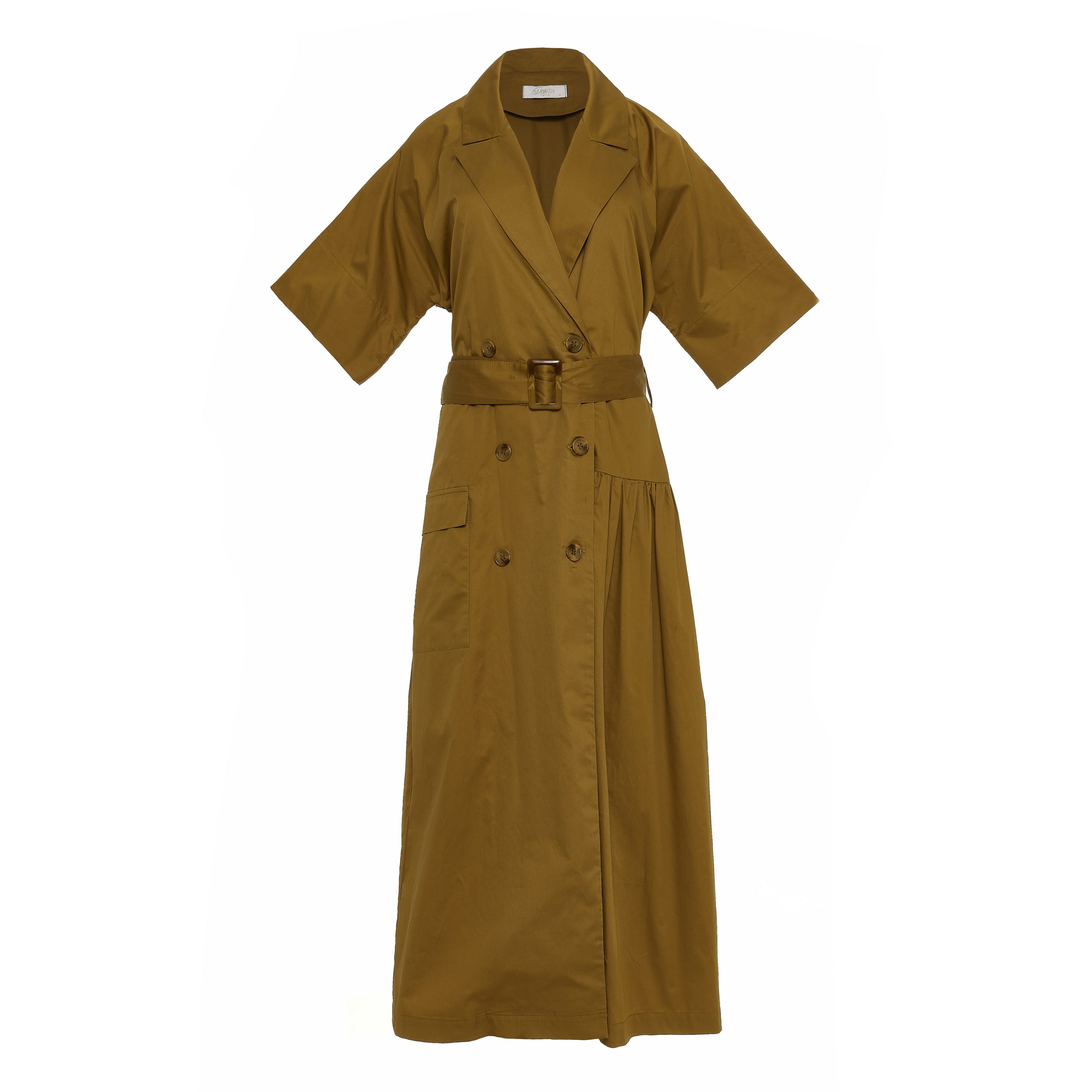 This dress midi-to-maxi piece in a warm khaki tone, designed with a double-breasted front and a sharp lapel collar. The adjustable belt cinches the waist while the softly gathered skirt adds movement, Short wide sleeves and practical details like a patch pocket enhance its modern, functional appeal.