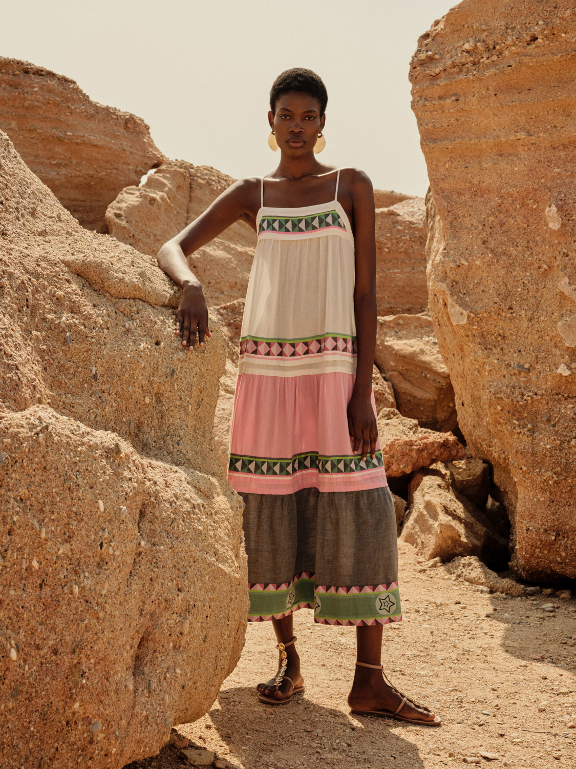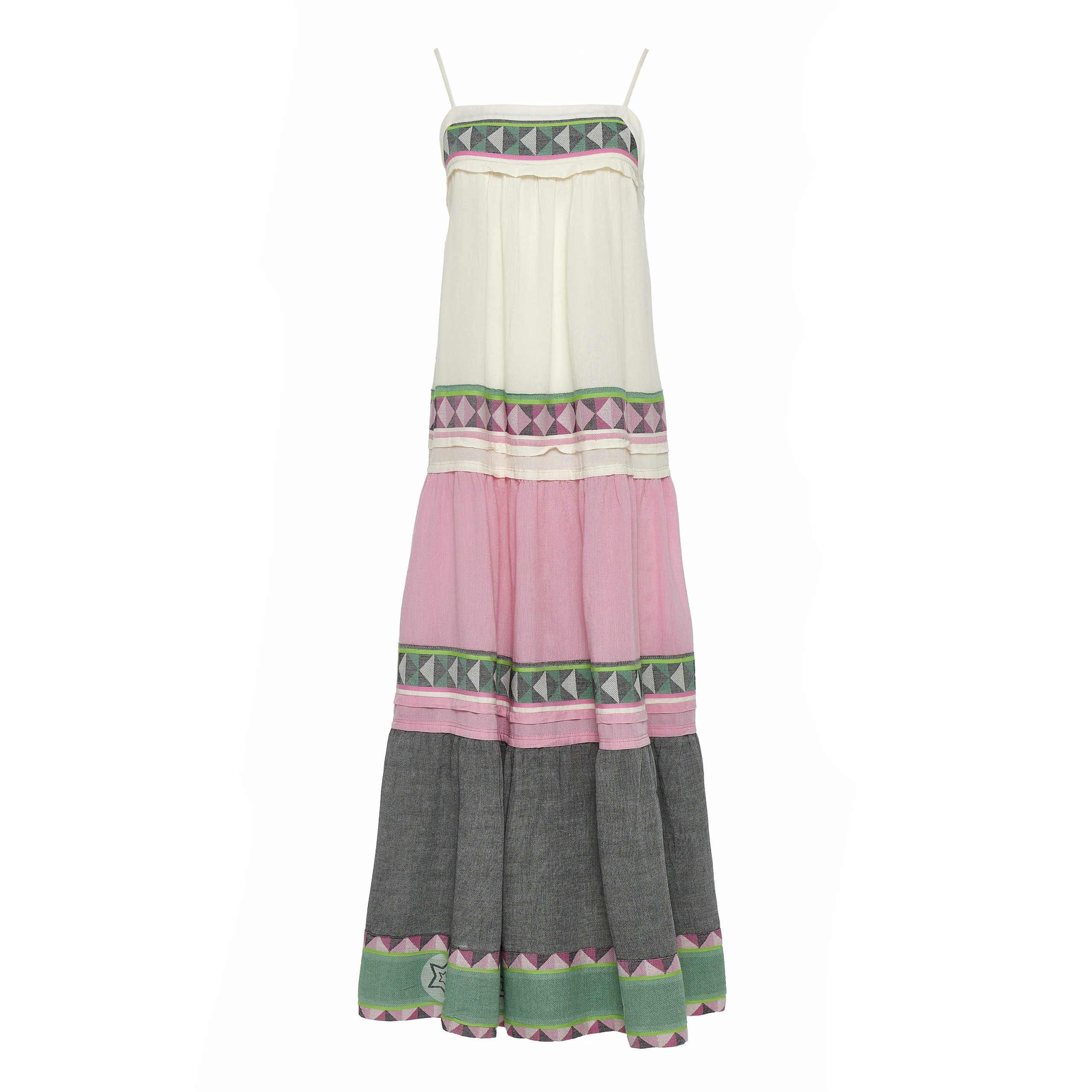 This maxi dress featuring a playful mix of soft cream, pink, green, and grey tones. Designed with delicate spaghetti straps and a relaxed, flowing silhouette. The lightweight fabric drapes effortlessly, creating movement and an airy feel.