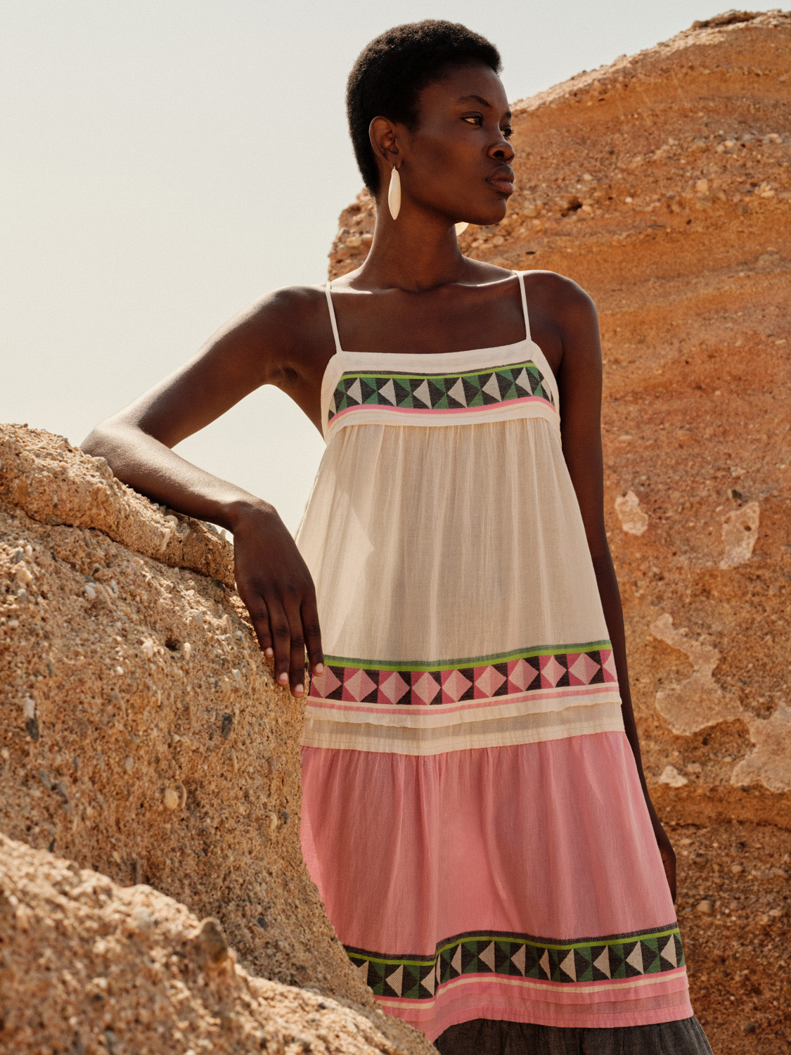 – Tiered silhouette with geometric trim details