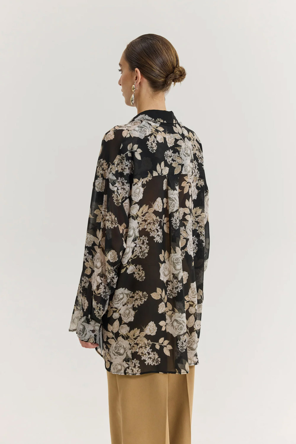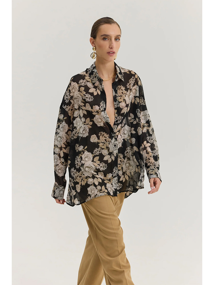 A flowy oversized shirt from Hemithea adorned with an elegant rose print, designed for comfort and versatility. Its longline silhouette and relaxed fit make it flattering on all body types.