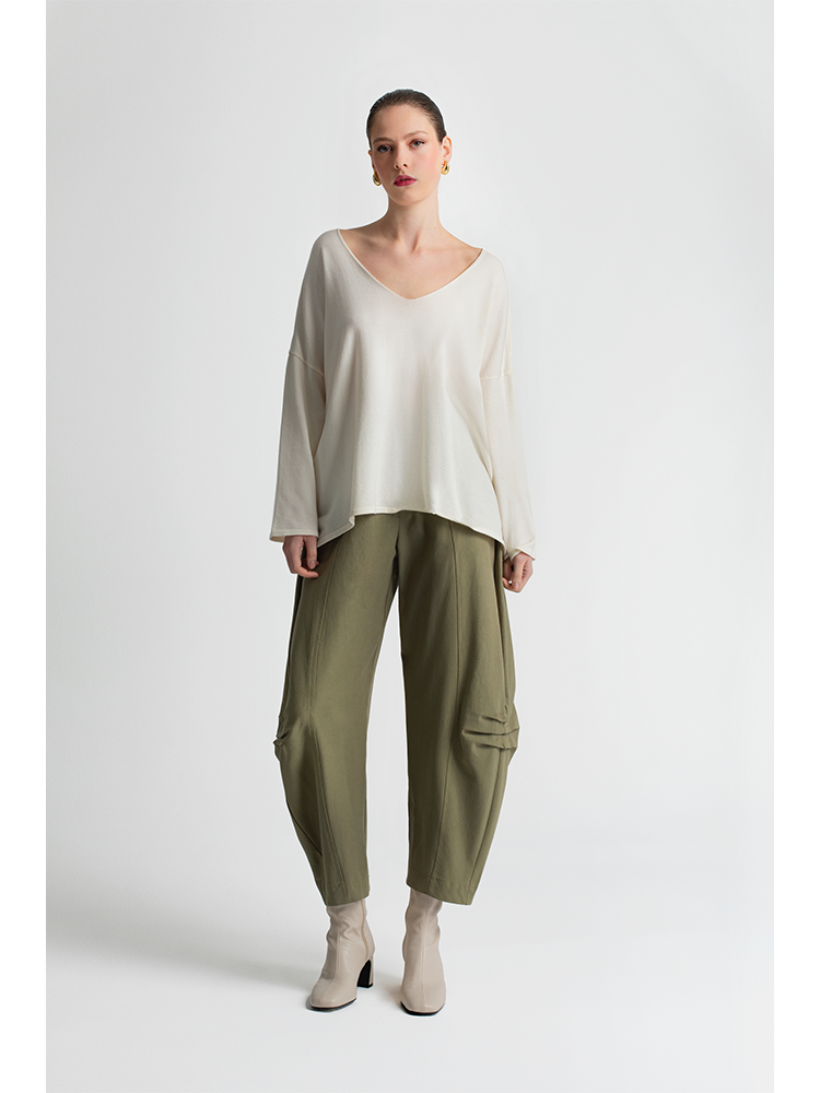 Knit blouse designed with a relaxed silhouette, dropped shoulders, and a deep v-neckline. The lightweight knit fabric drapes beautifully, making it perfect for layering. Its understated design makes it easy to pair with tailored trousers, skirts, or denim.