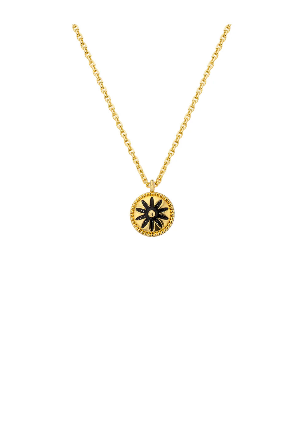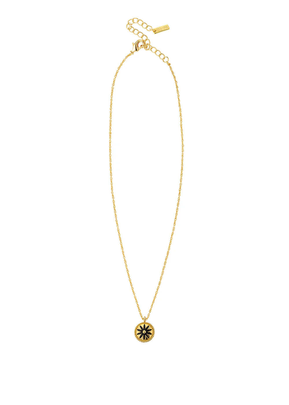 MYA—BAY’s BLACK FLOWER necklace, plated with 24-karat recycled fine gold, is a delicate piece of jewelry with a discreetly magnetic aura.