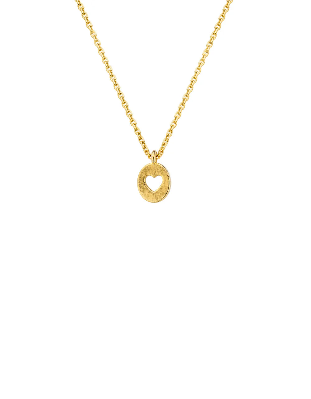 Its mini brushed gold medallion, carved with a small heart, rests on a fine chain that beautifully captures the light. A delicate nod to love, in a minimalist and luminous version.