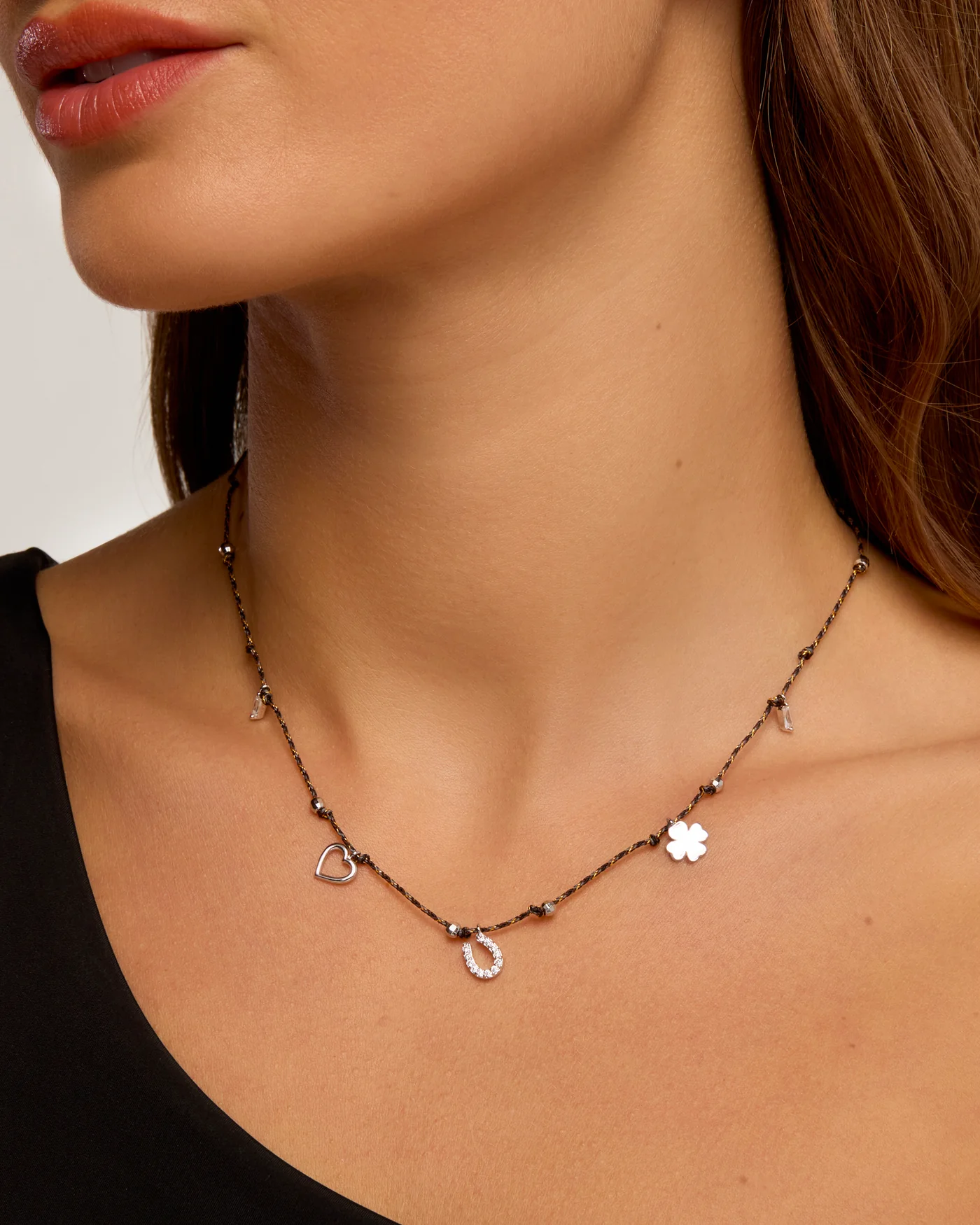 Worn in This choker-style necklace on its black cord blends luck, love, and good vibes in an ultra-stylish design. A touch of positive energy to slip around your neck and express your mood.