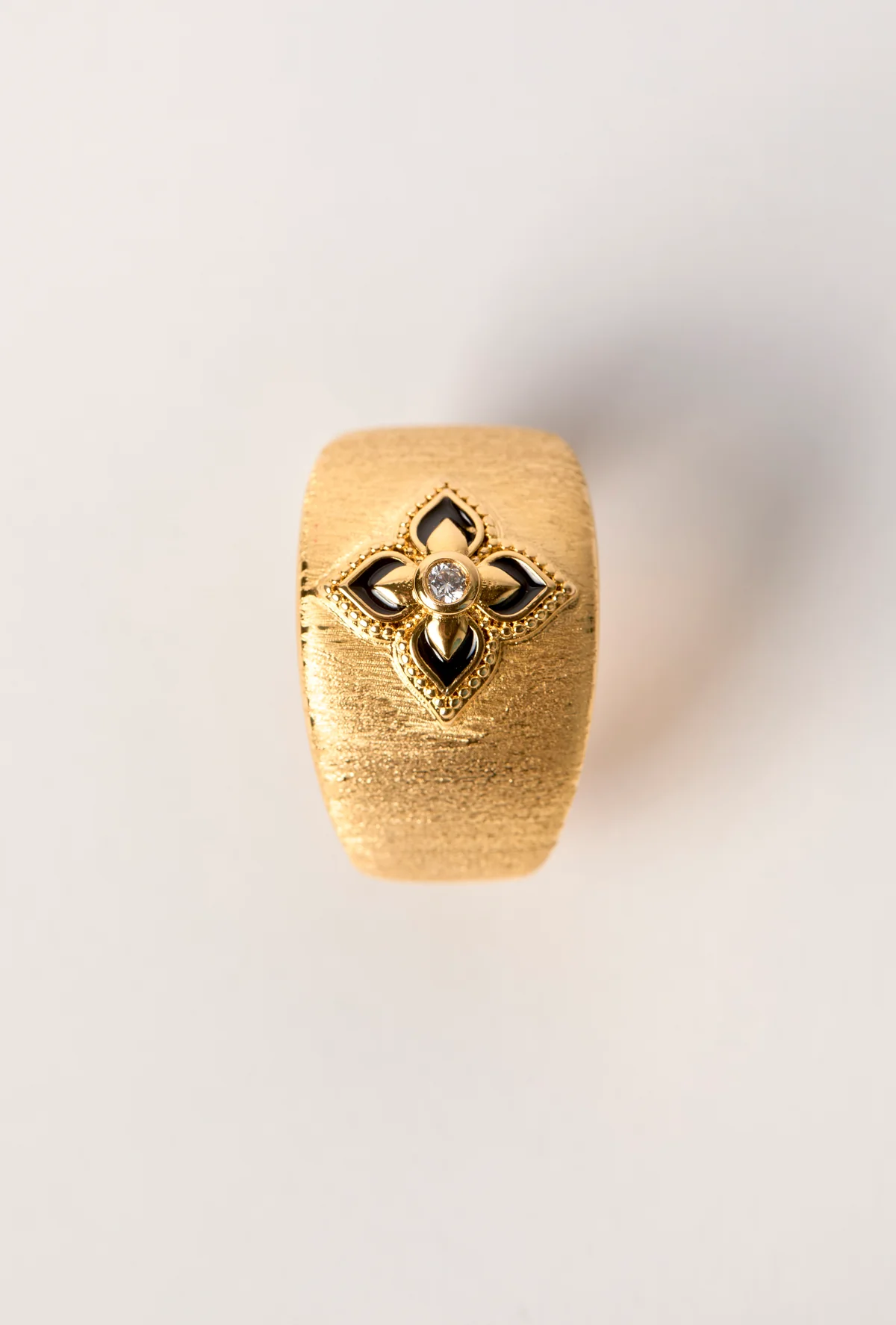 The BLACK LOTUS CUFF ring from MYA—BAY celebrates the lotus symbol in a powerful and contemporary interpretation. Crafted in brushed gold and adjustable, this boldly designed cuff ring features a lotus motif highlighted with black enamel. A strong and spiritual symbol deeply rooted in Indian culture, the lotus here lends an elegant and deceptively demure touch to a piece with a strong character.