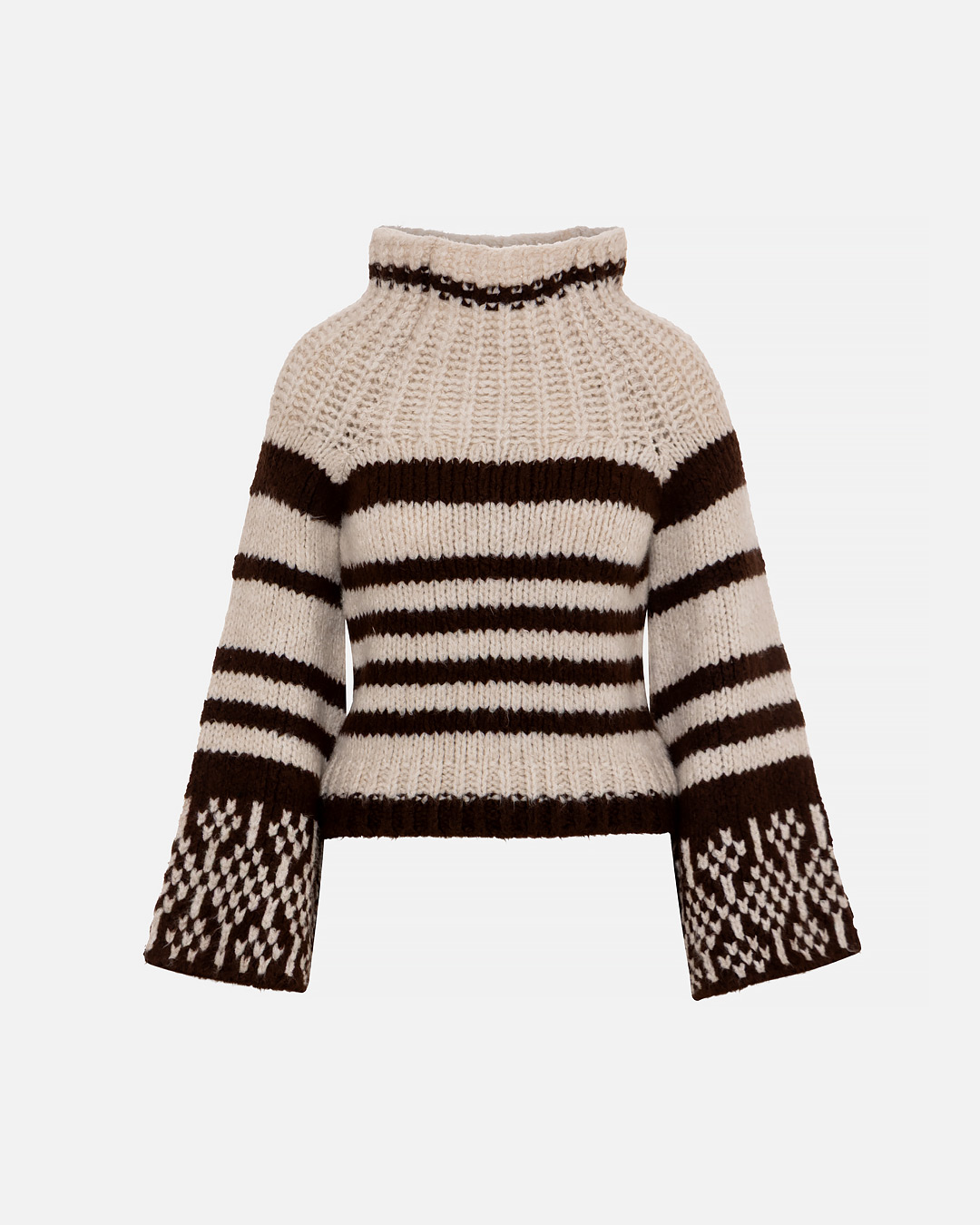 Cropped striped knit sweater crafted in warm cream and coffee brown tones, it features bold horizontal stripes and jacquard-style patterns at the flared sleeves. Designed with a relaxed high neckline and a slightly cropped length, this sweater is perfect for pairing with high-waisted trousers or skirts.