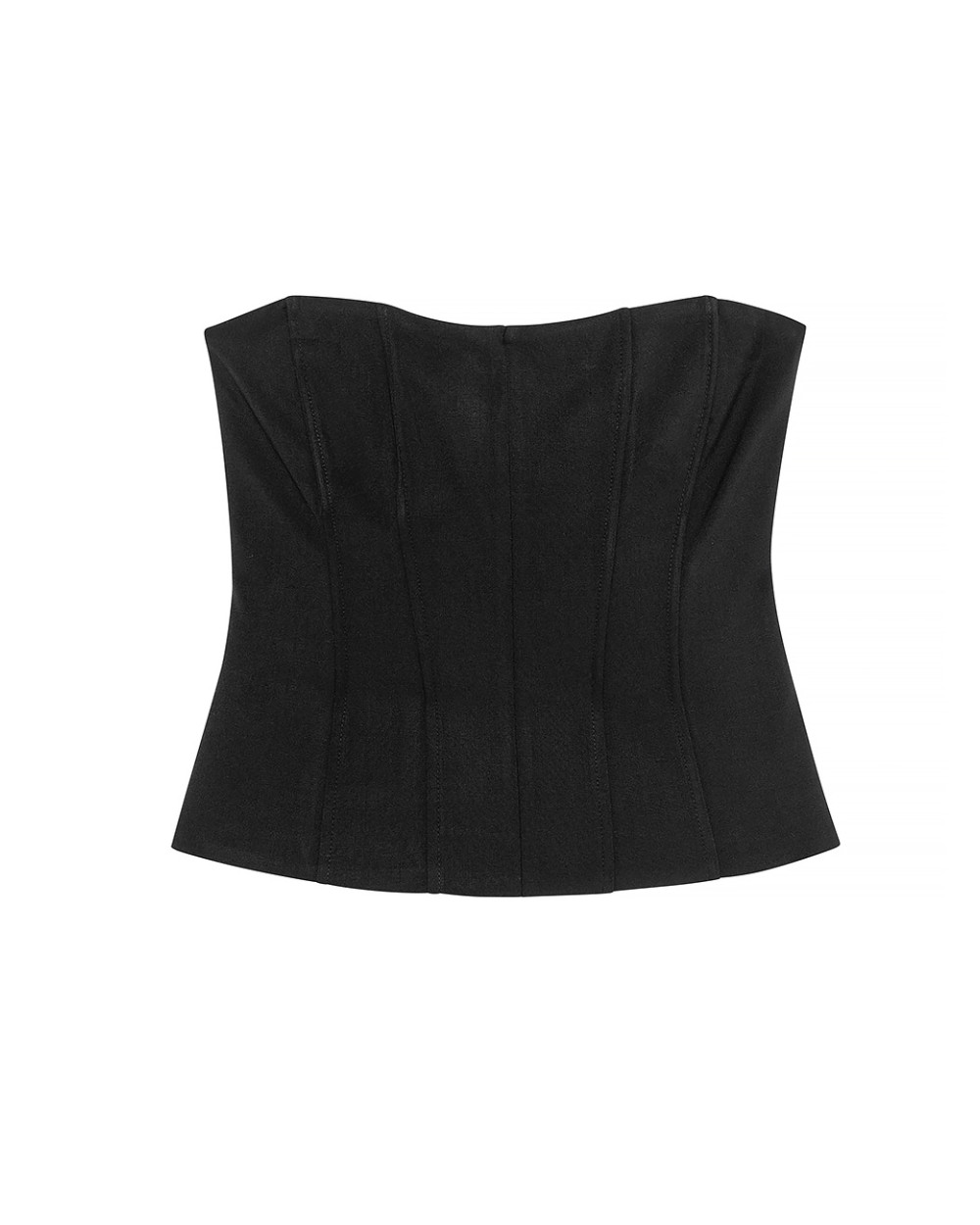Year 2004: Strapless top with a corset-effect design and decorative stitching. It features a back zip fastening and an inner silicone grip around the bust for added stability. A timeless choice for elegant evening looks.