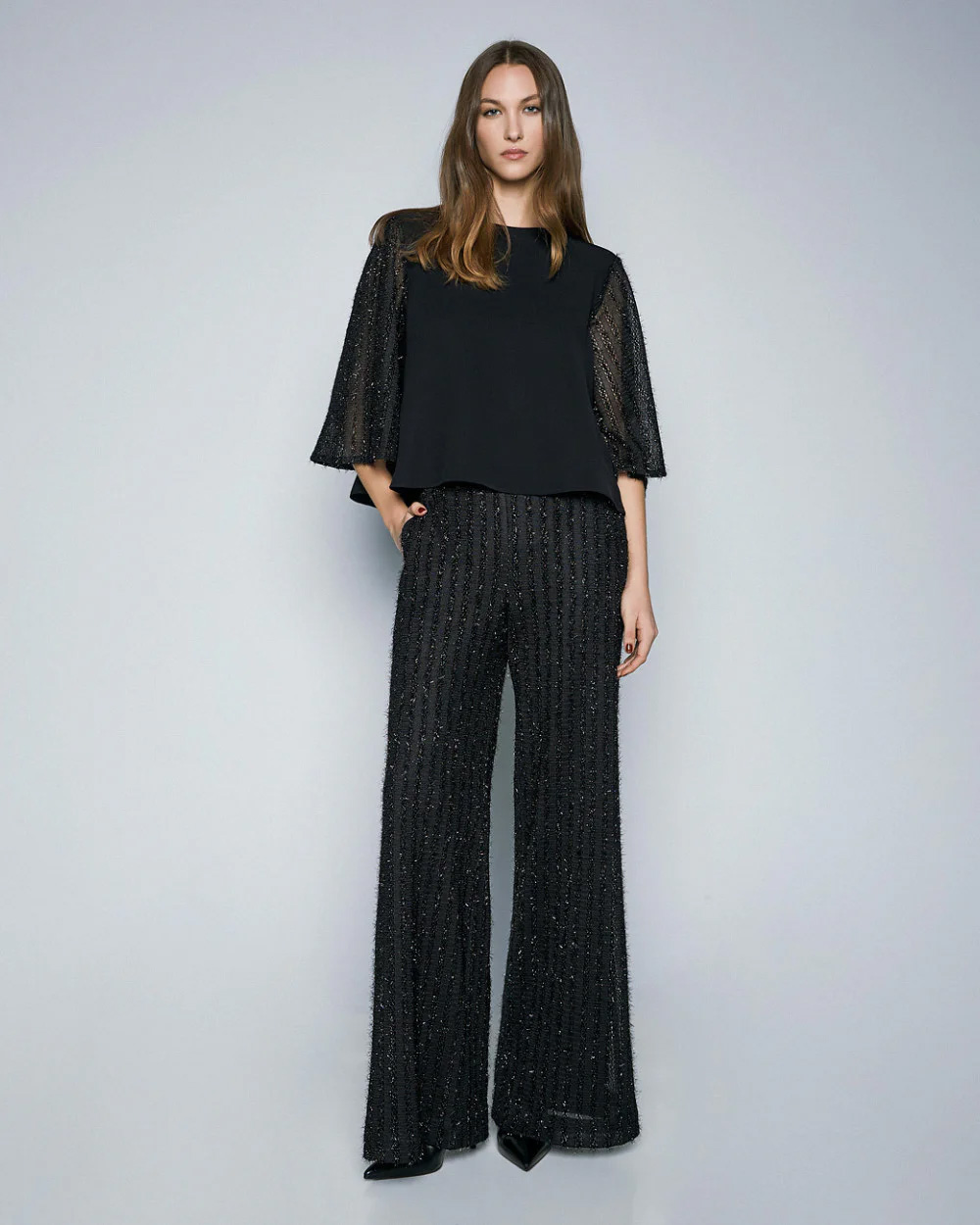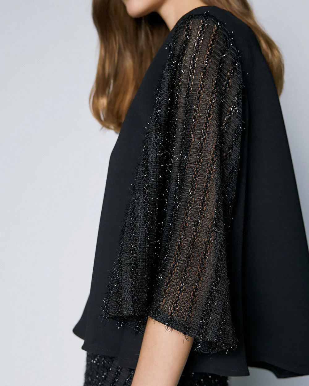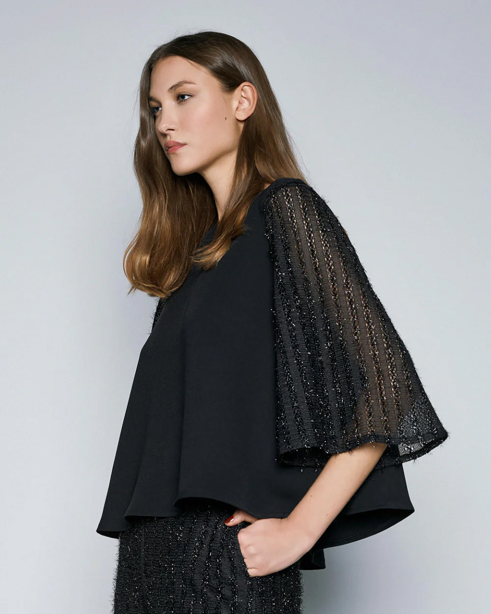 Blouse with perforated bell sleeves and lurex details. Features a round neckline and back button fastening. It is a distinctive choice for elegant looks that stand out.