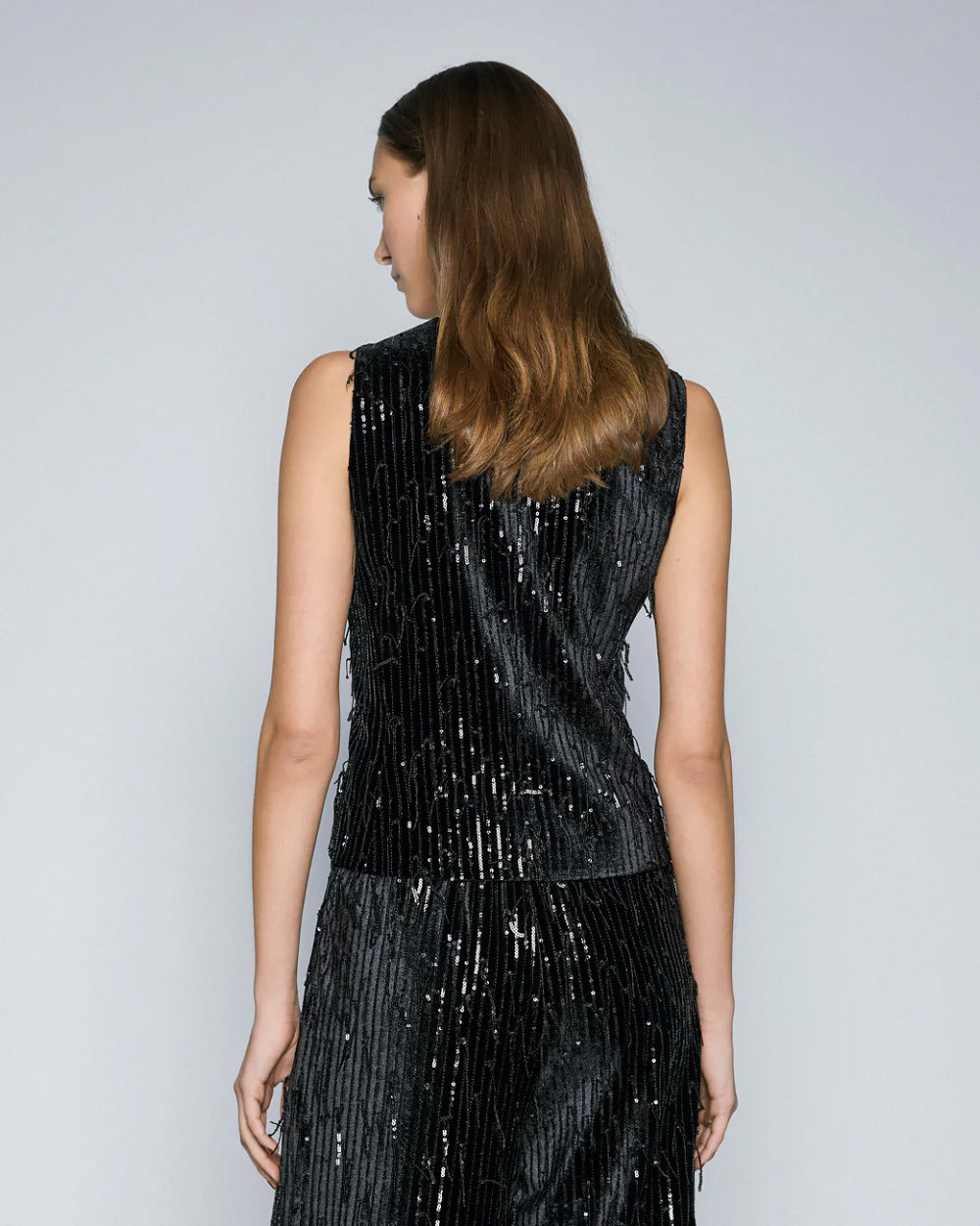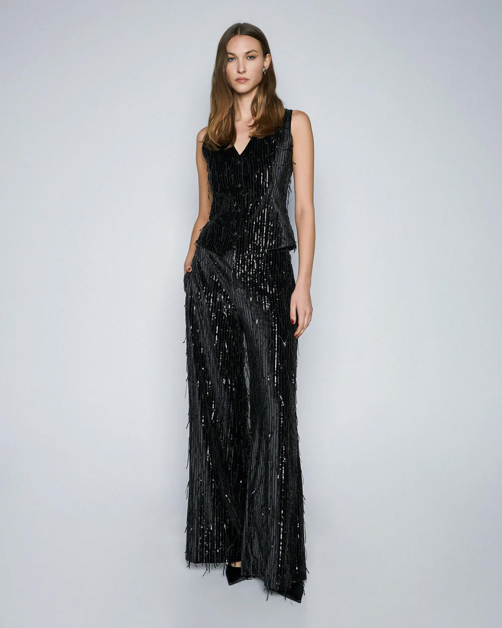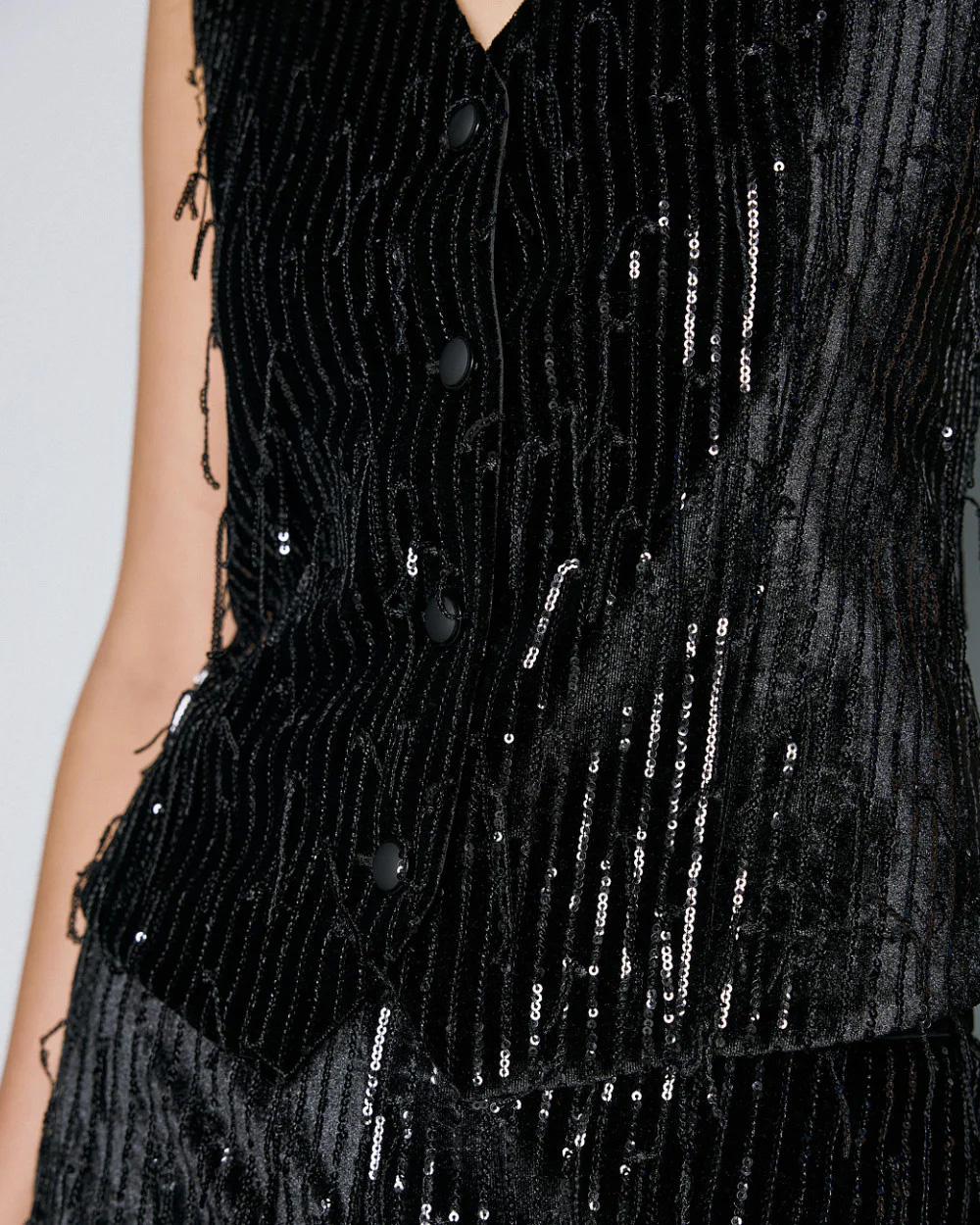 Velvet vest with sequins and a V-neckline. It features sequin fringes and a front button closure. Pair it with the matching pants from our collection for glamorous evening looks.