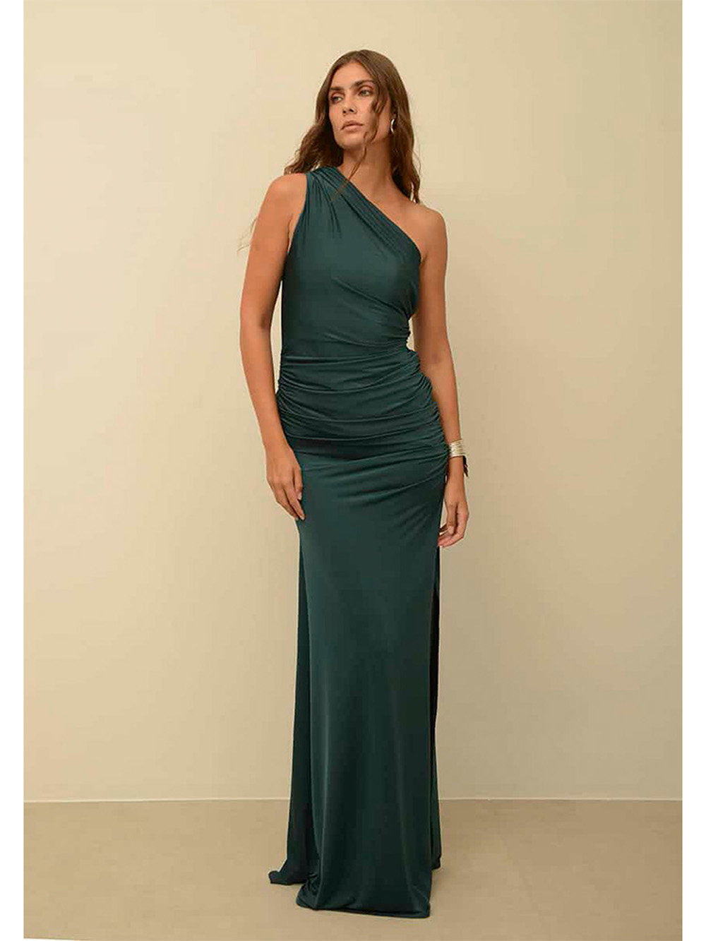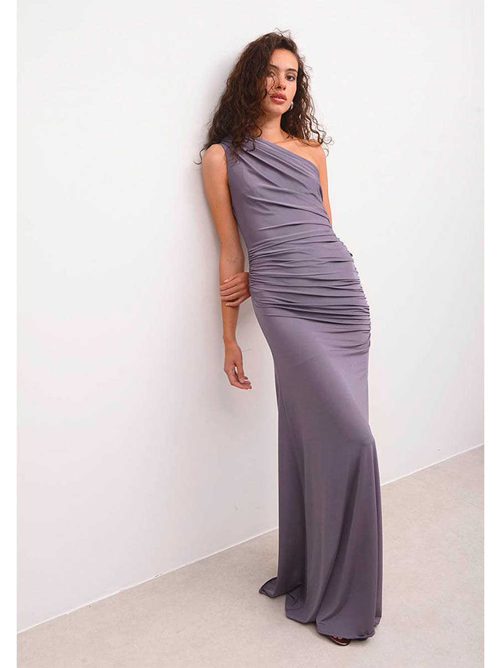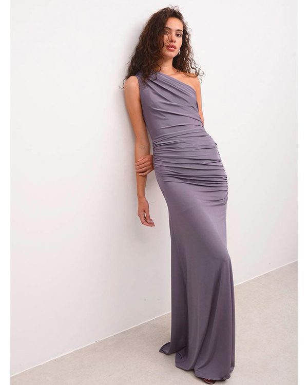 Graceful and sculpting, this Nash by NA one-shoulder floor-length gown is designed to flatter with soft ruffled details and a figure-hugging mermaid silhouette. Crafted from elastic jersey fabric, it features a side slit for ease of movement and a hint of leg. A hidden side zipper ensures a smooth fit, making it a perfect choice for formal occasions.