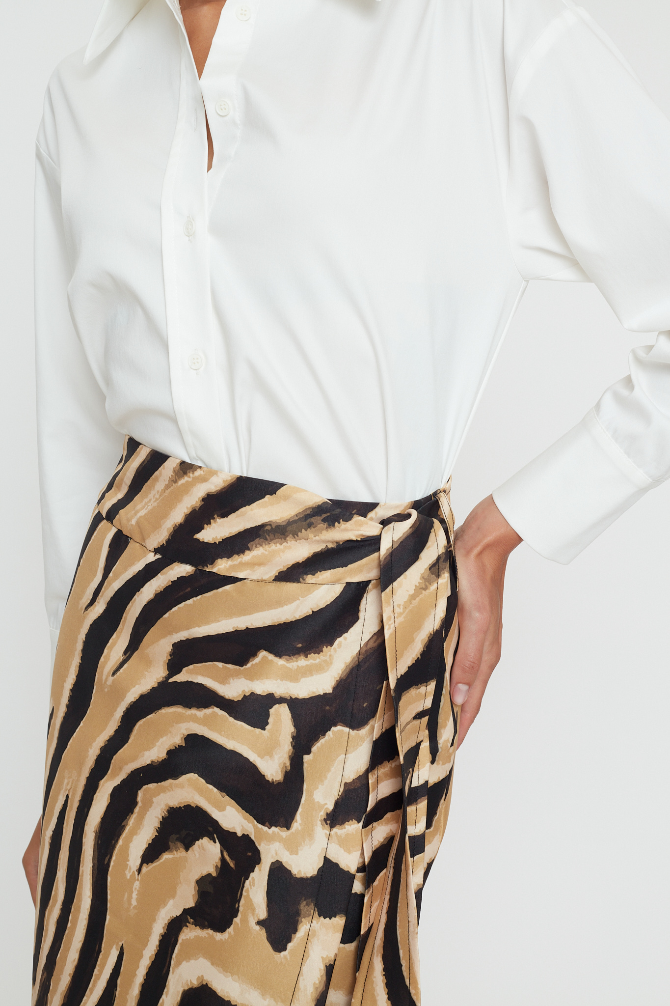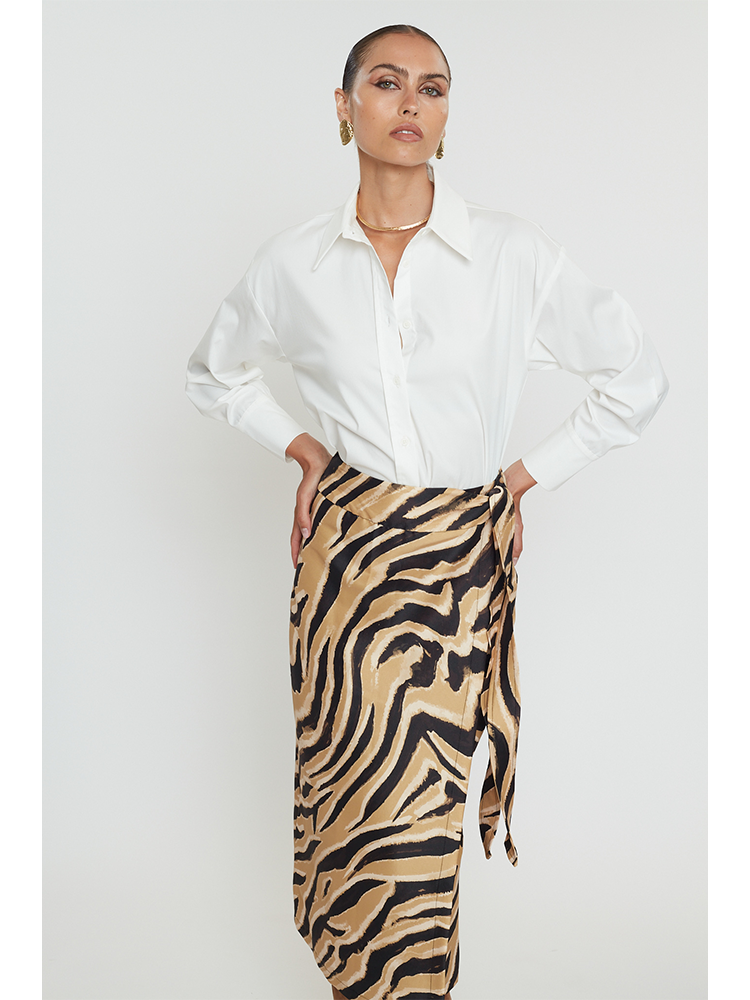 Wrap skirt designed from Mix & Match in a striking caramel and black zebra-inspired print. The wrap silhouette ties neatly at the waist, offering a flattering and adjustable fit that accentuates the figure. Falling to a chic midi length, the skirt pairs perfectly with both tailored shirts and relaxed knits.