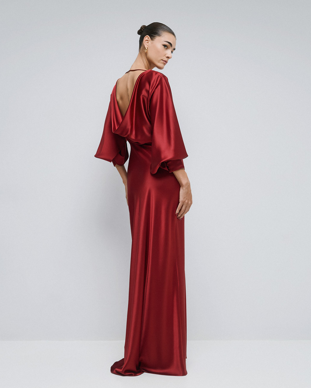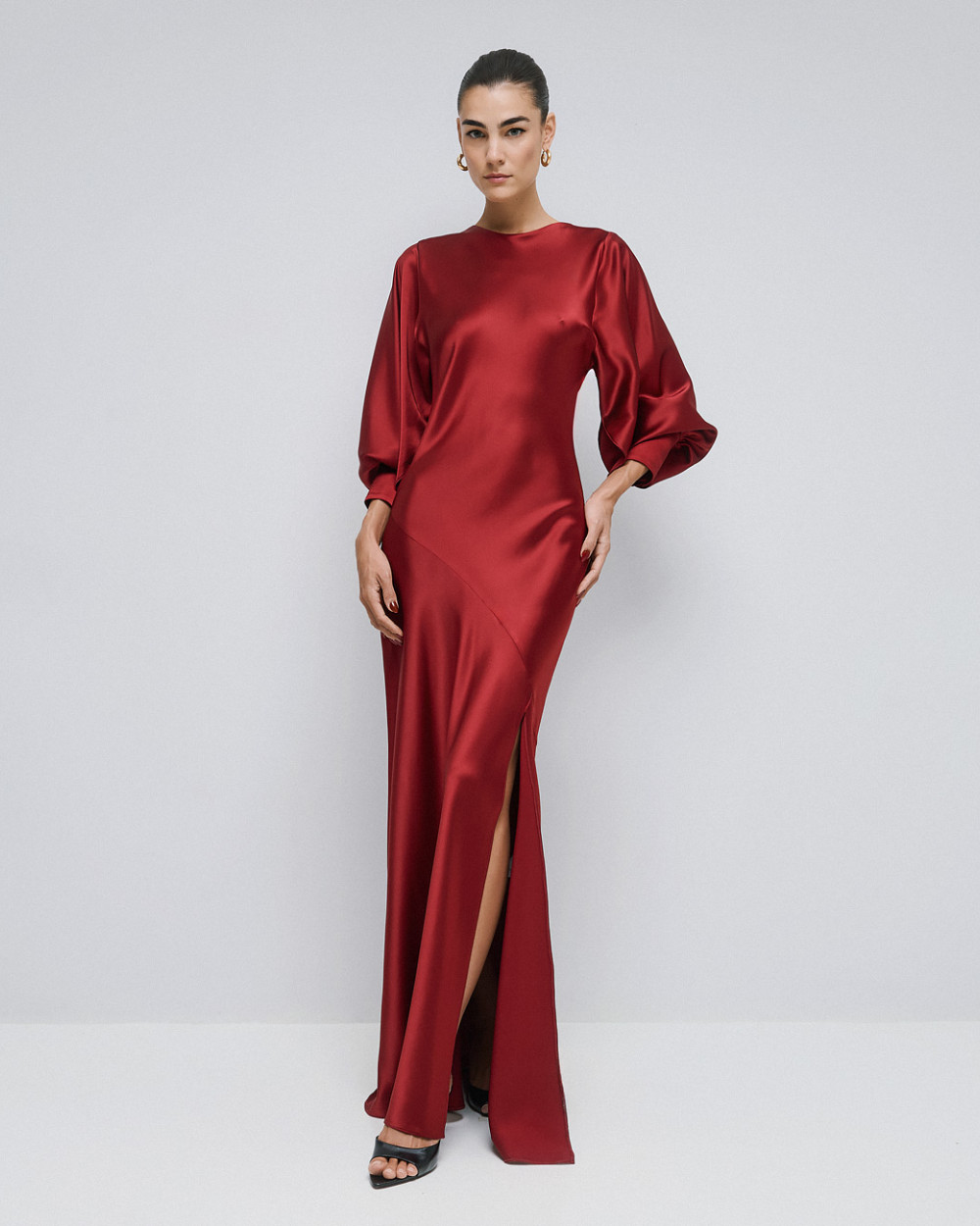 Satin maxi dress with a draped back from Access Fashion. It features long sleeves with openings and a front slit. Choose it for elegant looks.