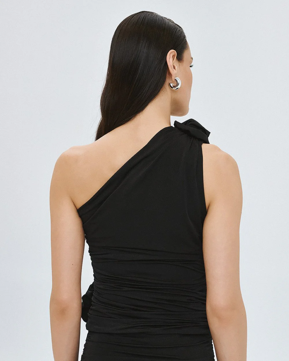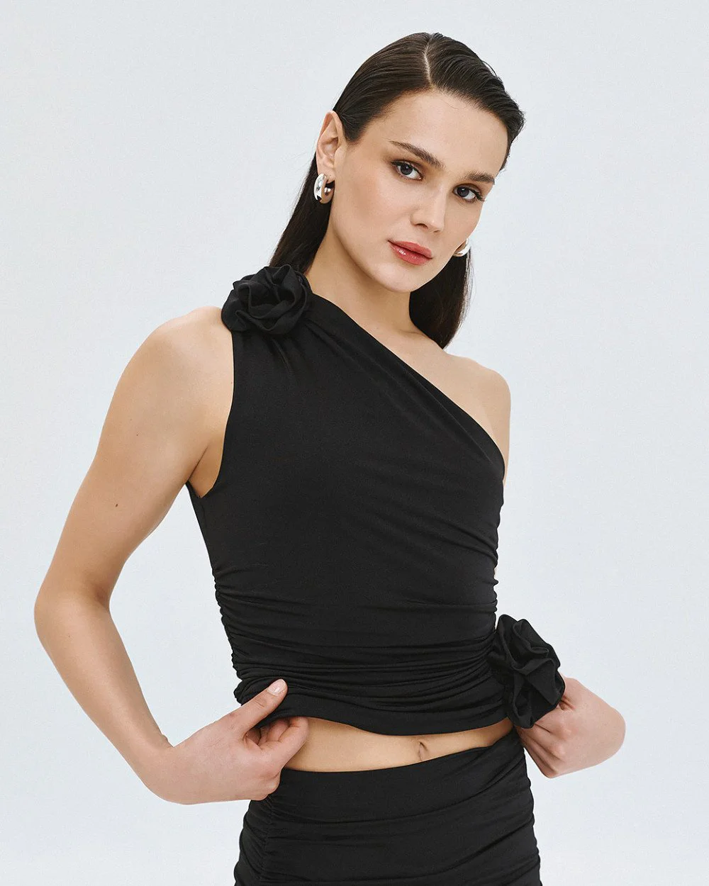 One-shoulder top with ruched detailing from Access Fashion. Features decorative floral appliques at the side and on the shoulder.