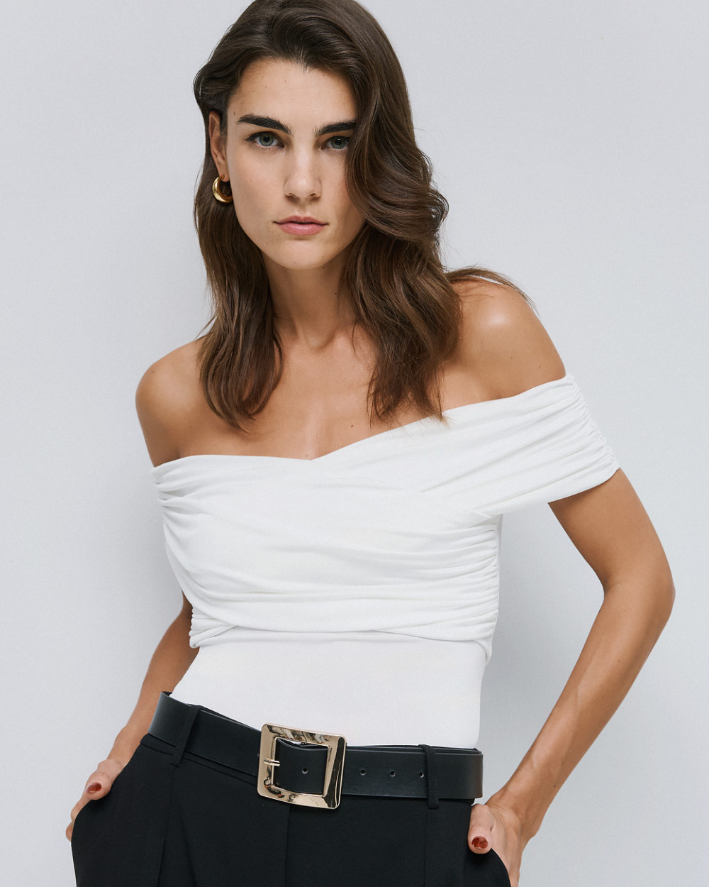 Turn up the elegance with this off-the-shoulder wrap bodysuit from Access Fashion, featuring gathered details that enhance its sophisticated silhouette. Crafted from elastic fabric for a comfortable, figure-flattering fit, it combines a wrap-front design with a sleek, fitted shape. Complete with a bottom snap closure for ease, this piece is perfect for pairing with high-waist pants or skirts for chic, statement looks.