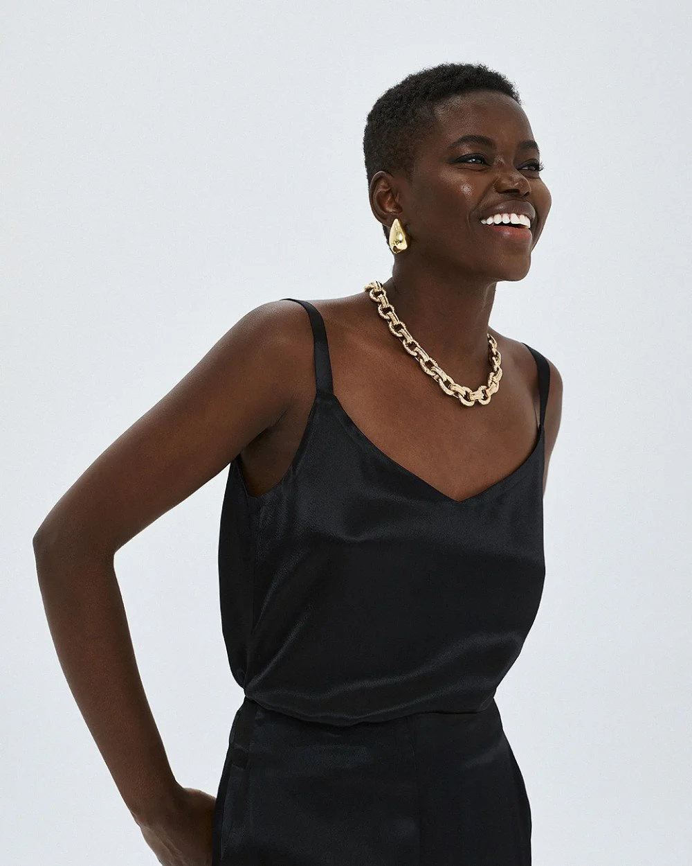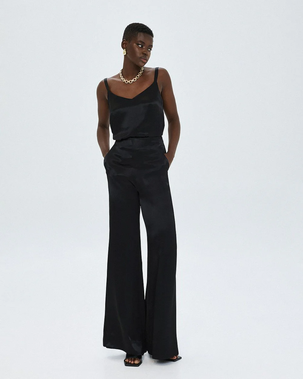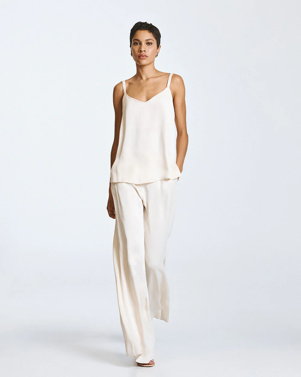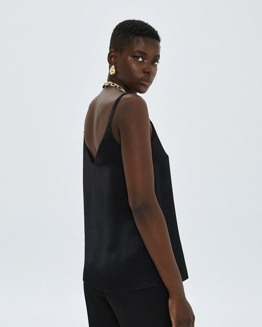 Satin top with straps, a v-neckline and back, and small side slits.