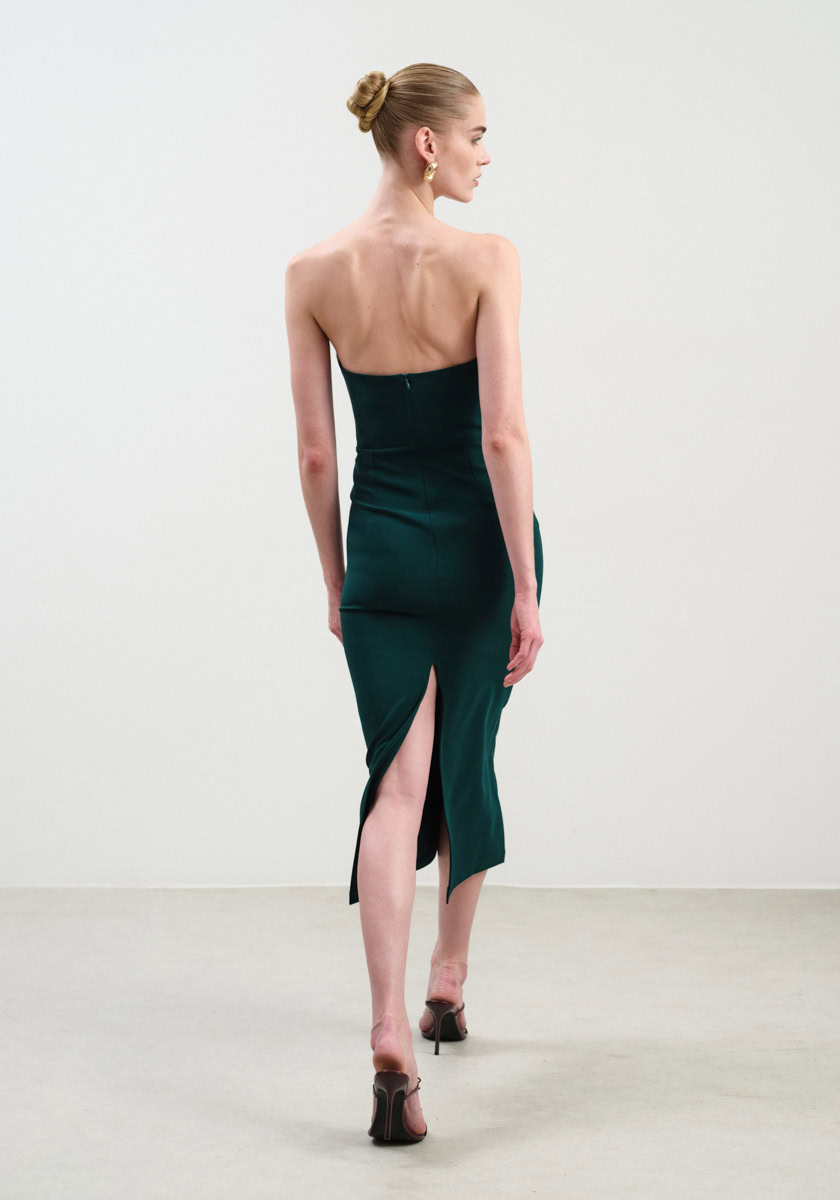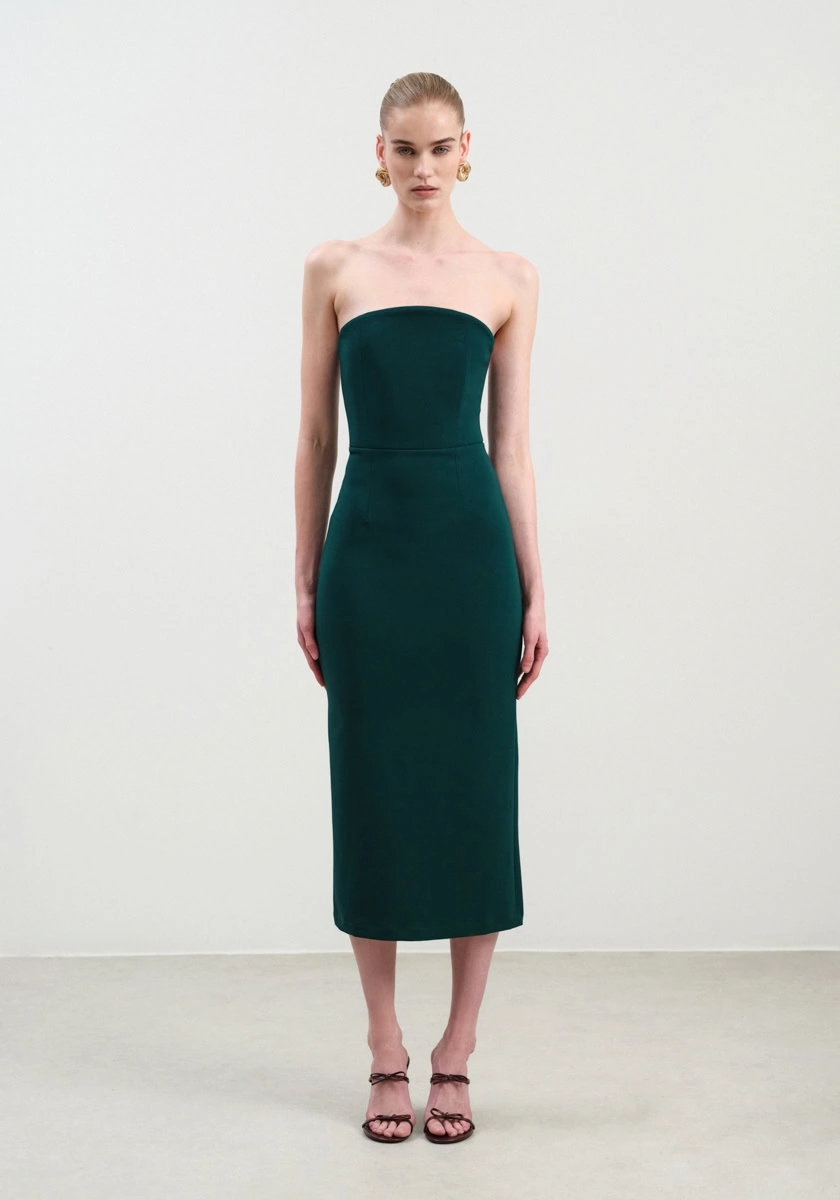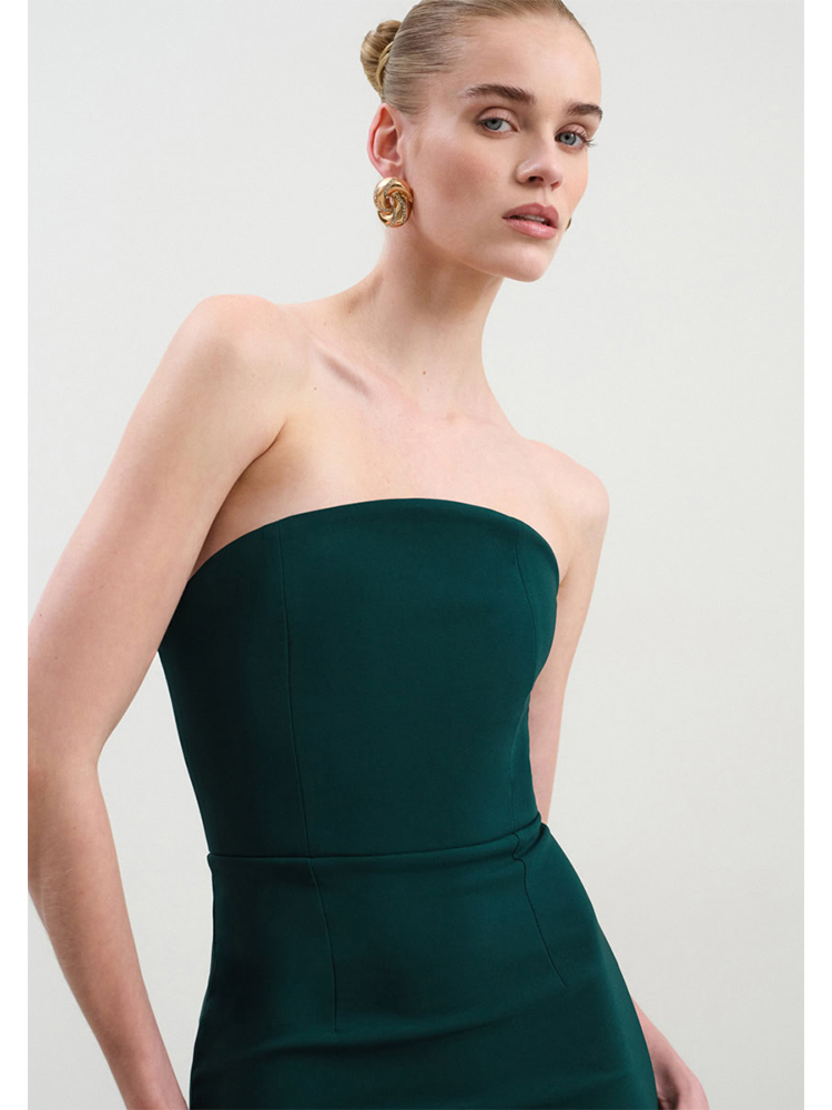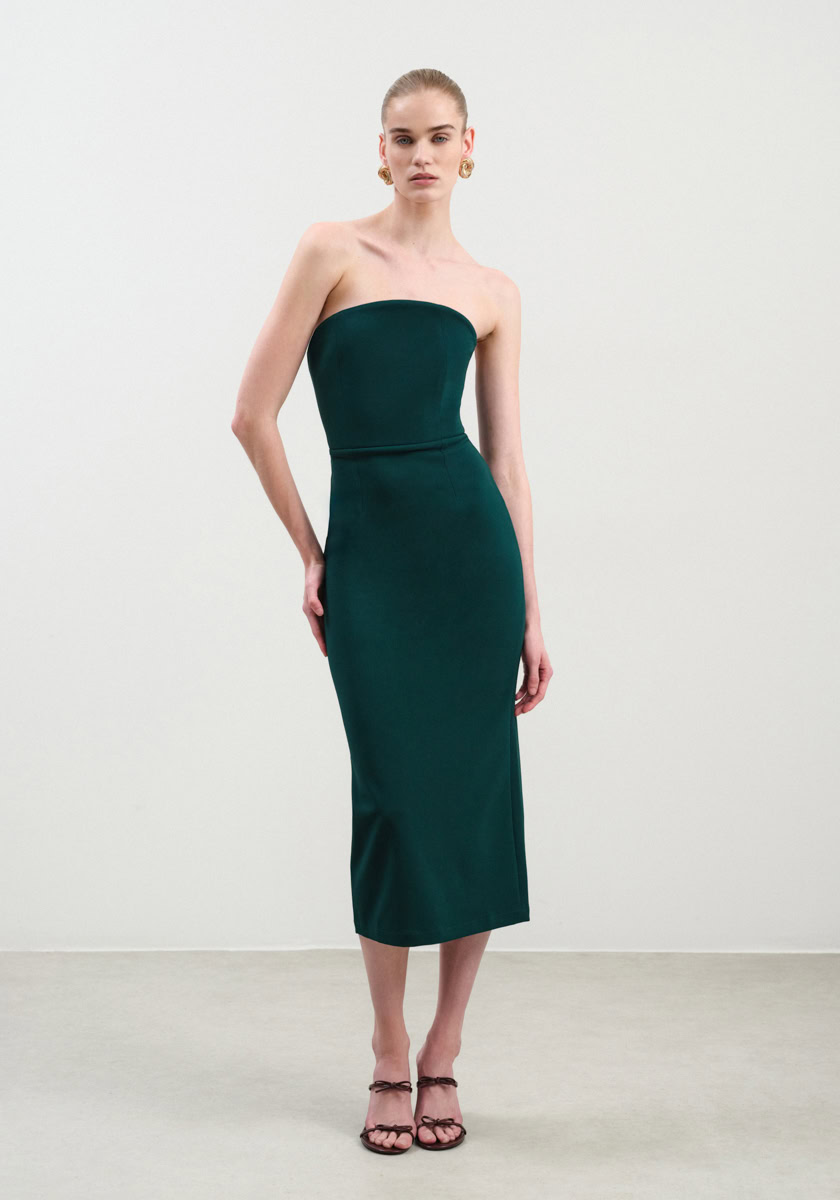Understated yet striking, this strapless crepe midi dress from Nash by NA is the definition of quiet luxury. Designed in a sleek, figure-hugging silhouette, it features a clean, minimal cut and a subtle back slit for ease of movement. A refined choice for evening events, wedding receptions, or any occasion where elegance speaks volumes.