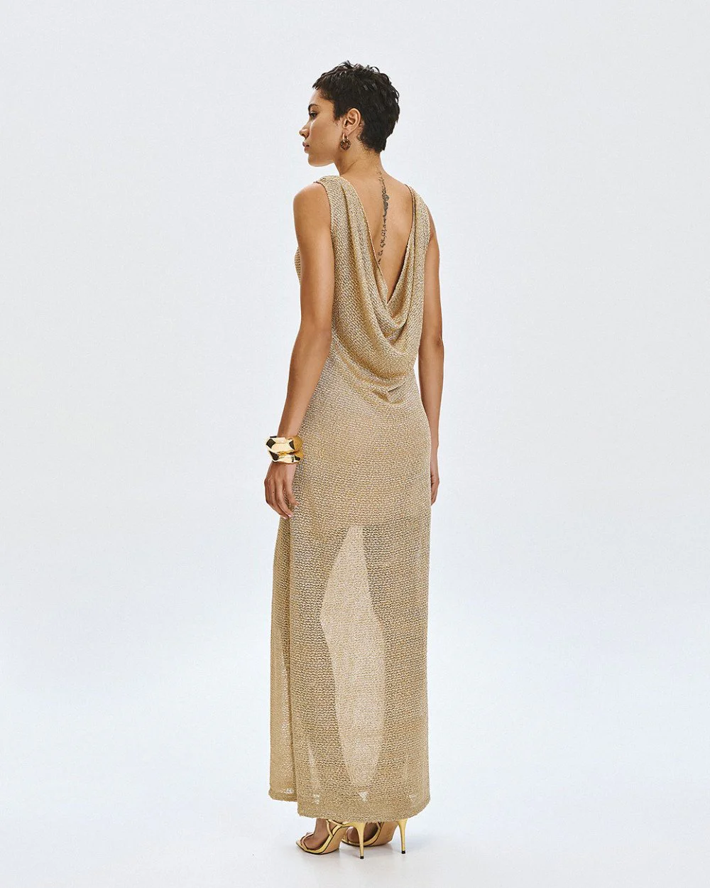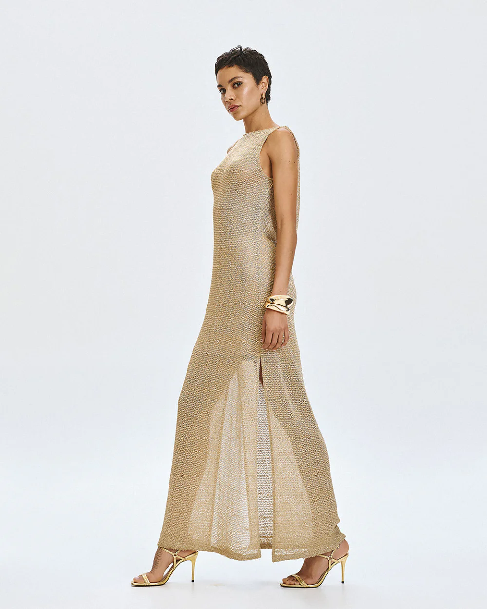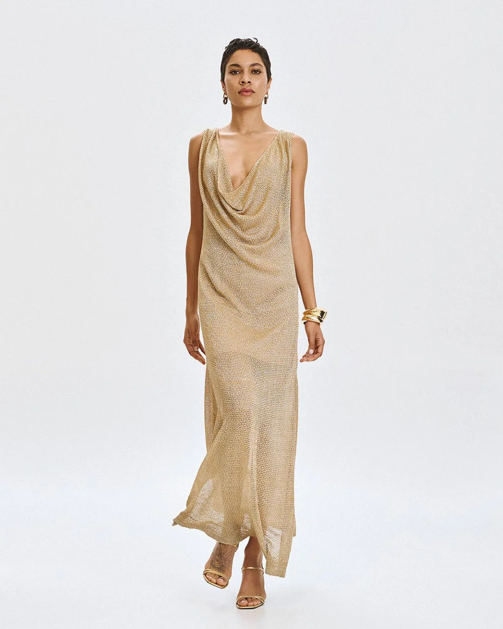 Maxi knitted sleeveless dress with lurex and sequin details. Features a draped neckline, side slits at the hem and a detachable underskirt.