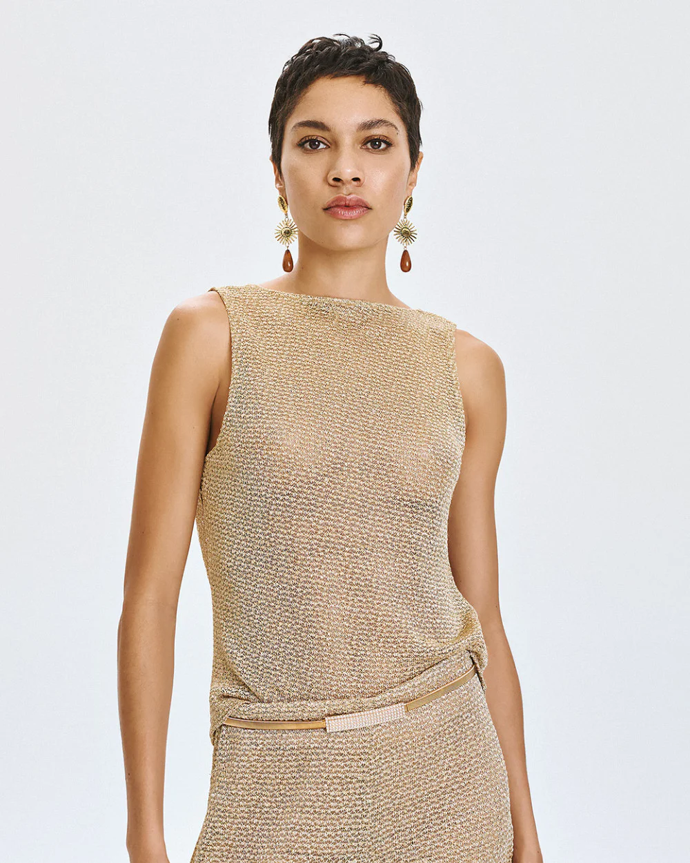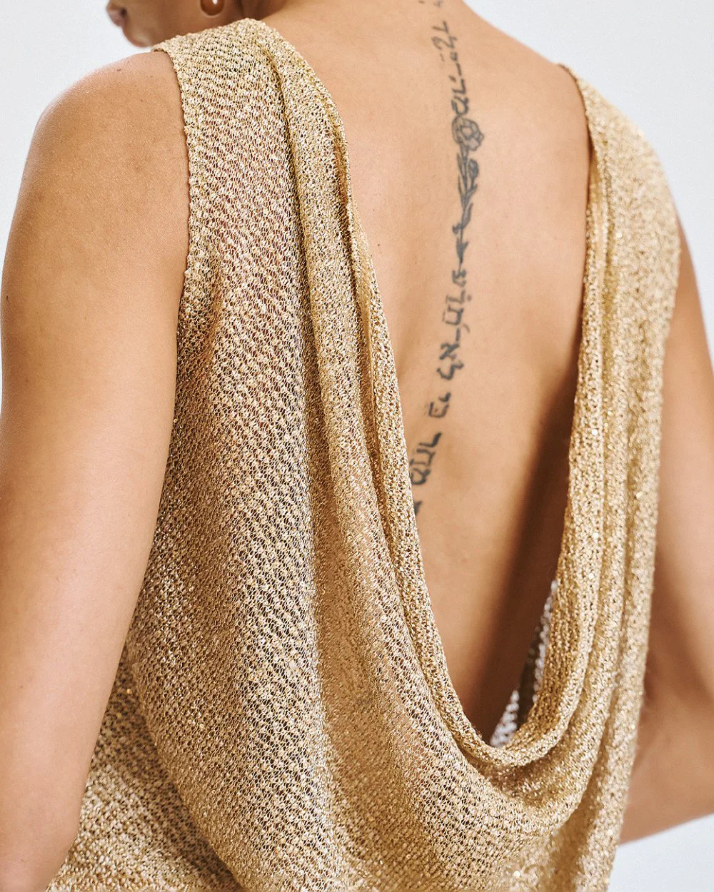 Knit top with a scoop neckline and a statement draped back. It features lurex and sequin details.