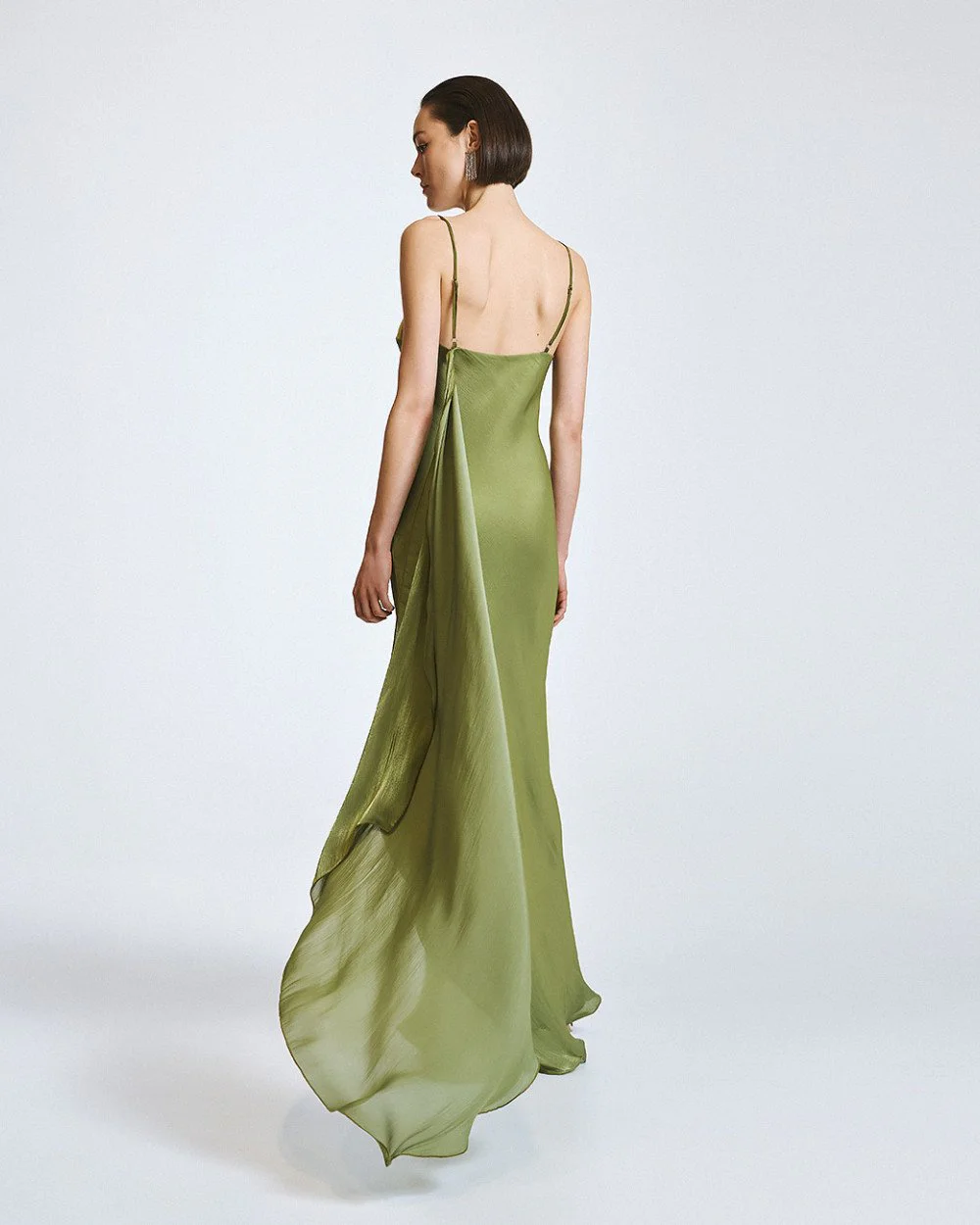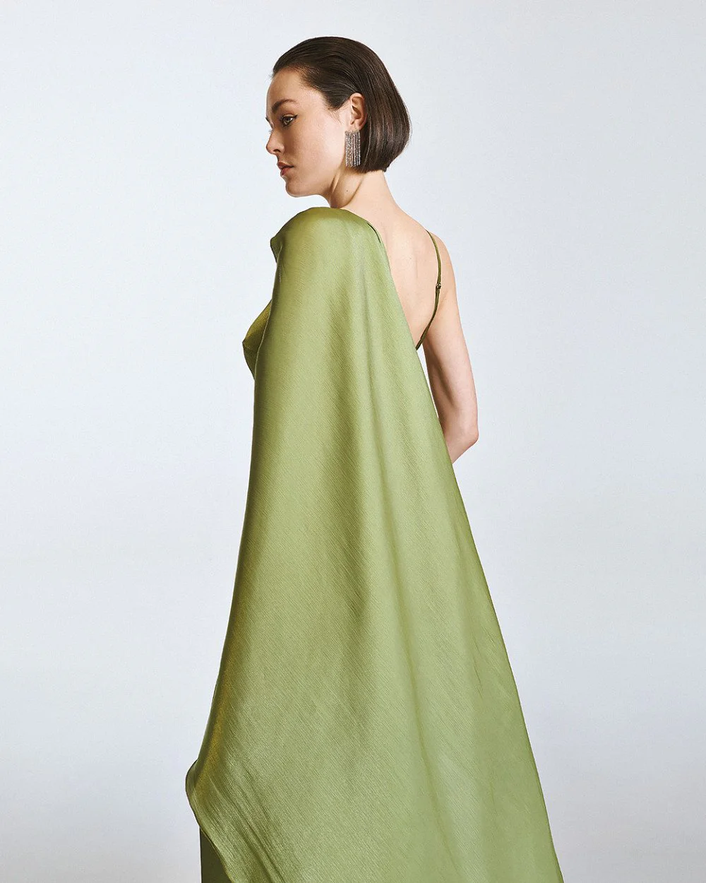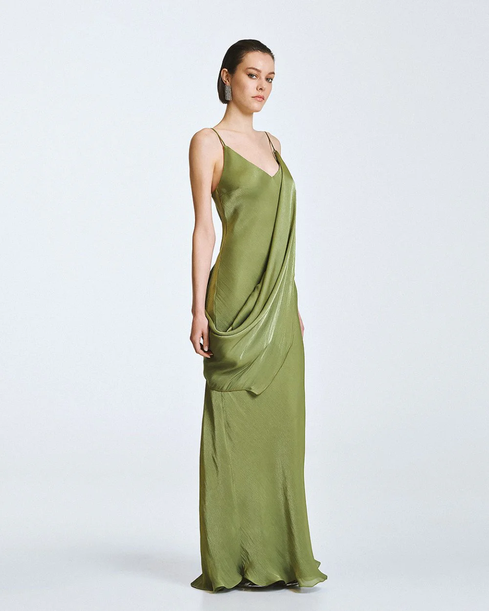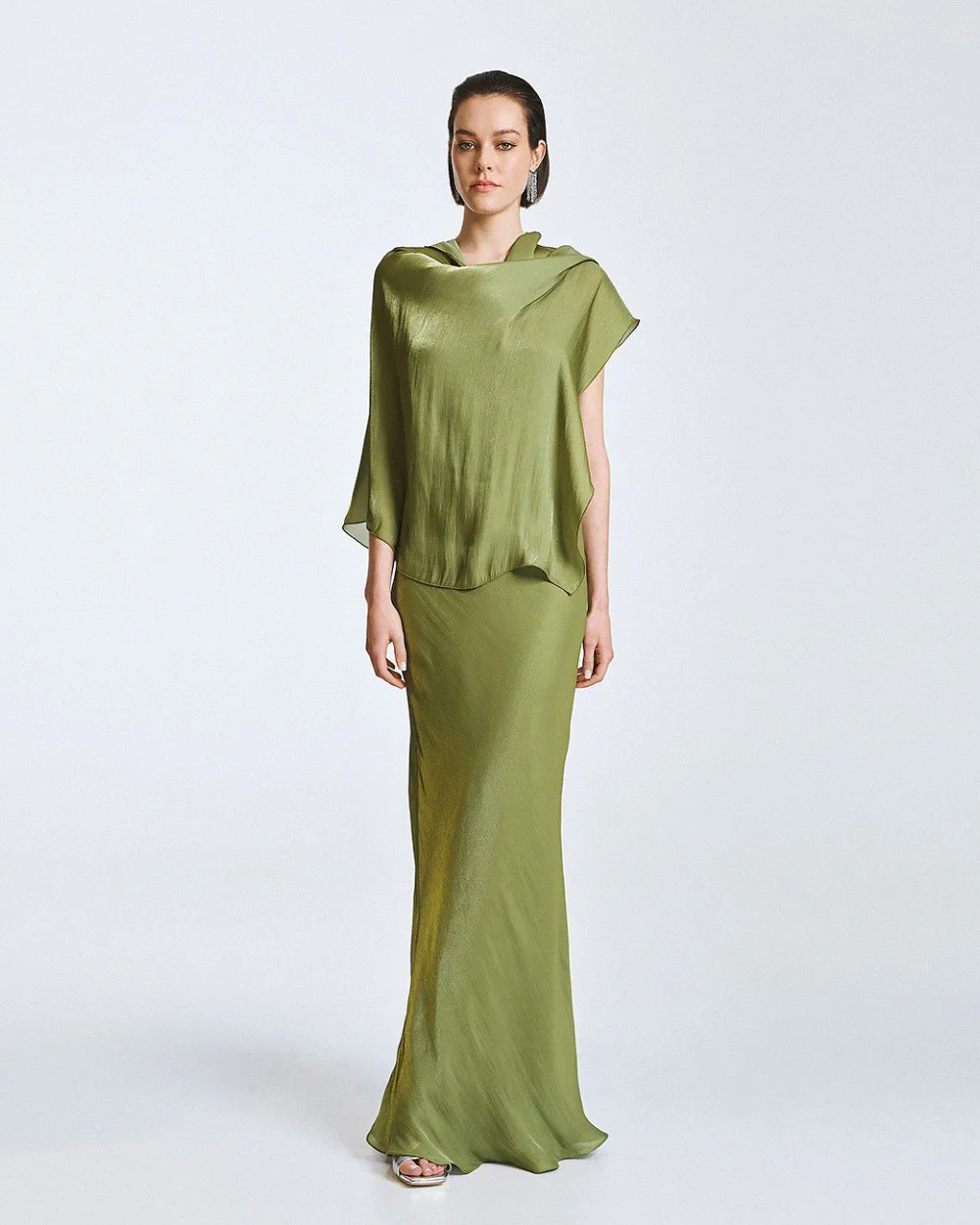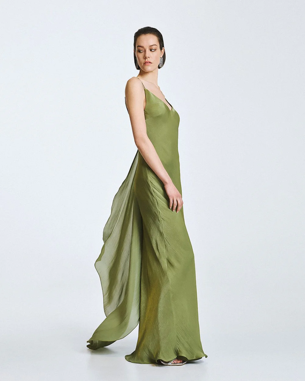 Maxi dress with a shiny finish, a v- neckline and thin adjustable straps. Features an inner lining and a detachable cape.