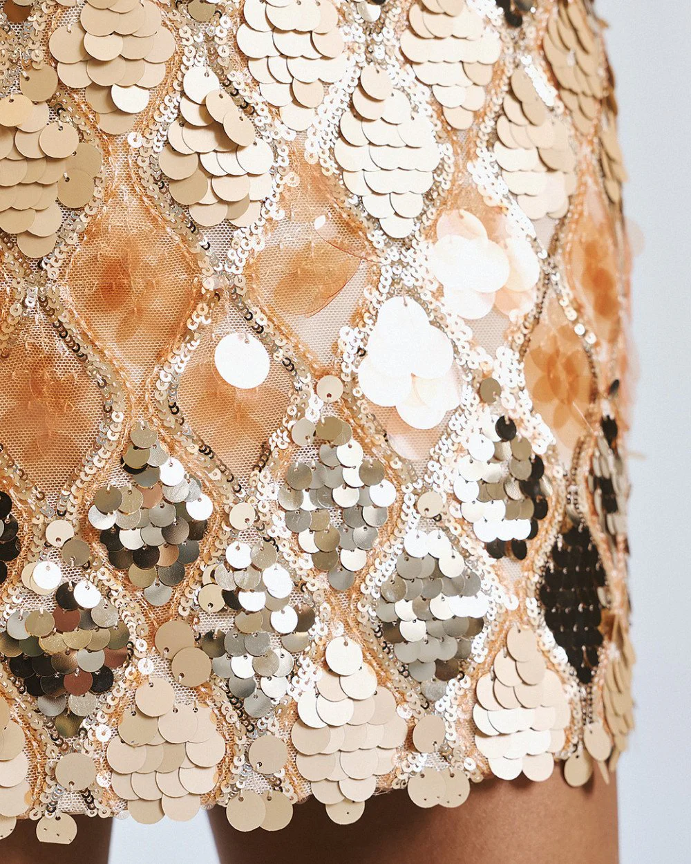 Mini skirt with sequins in a geometric pattern, featuring inner lining and back zip closure.
