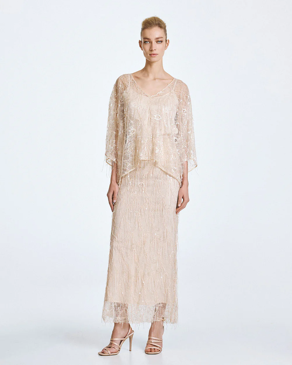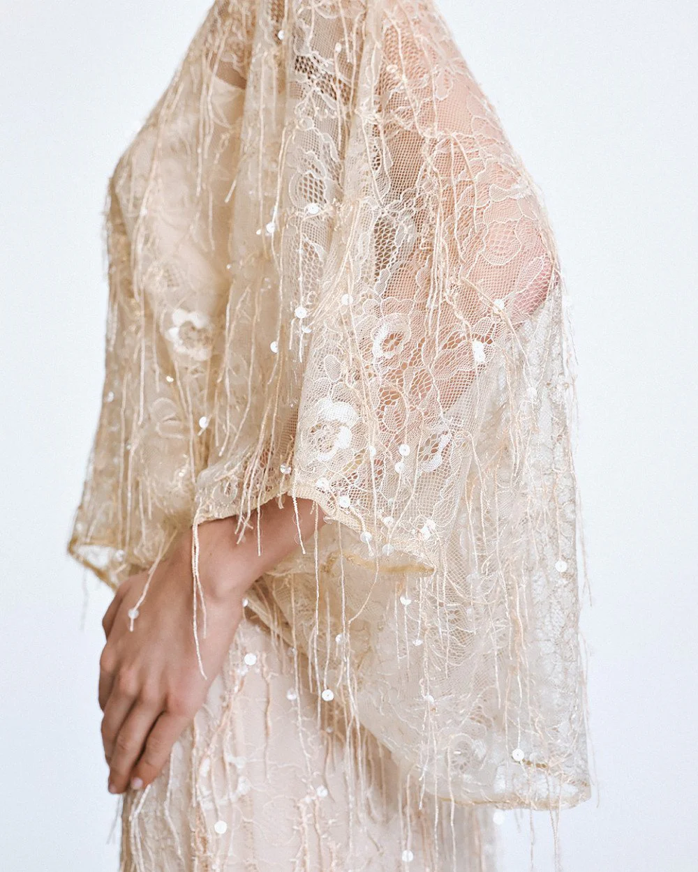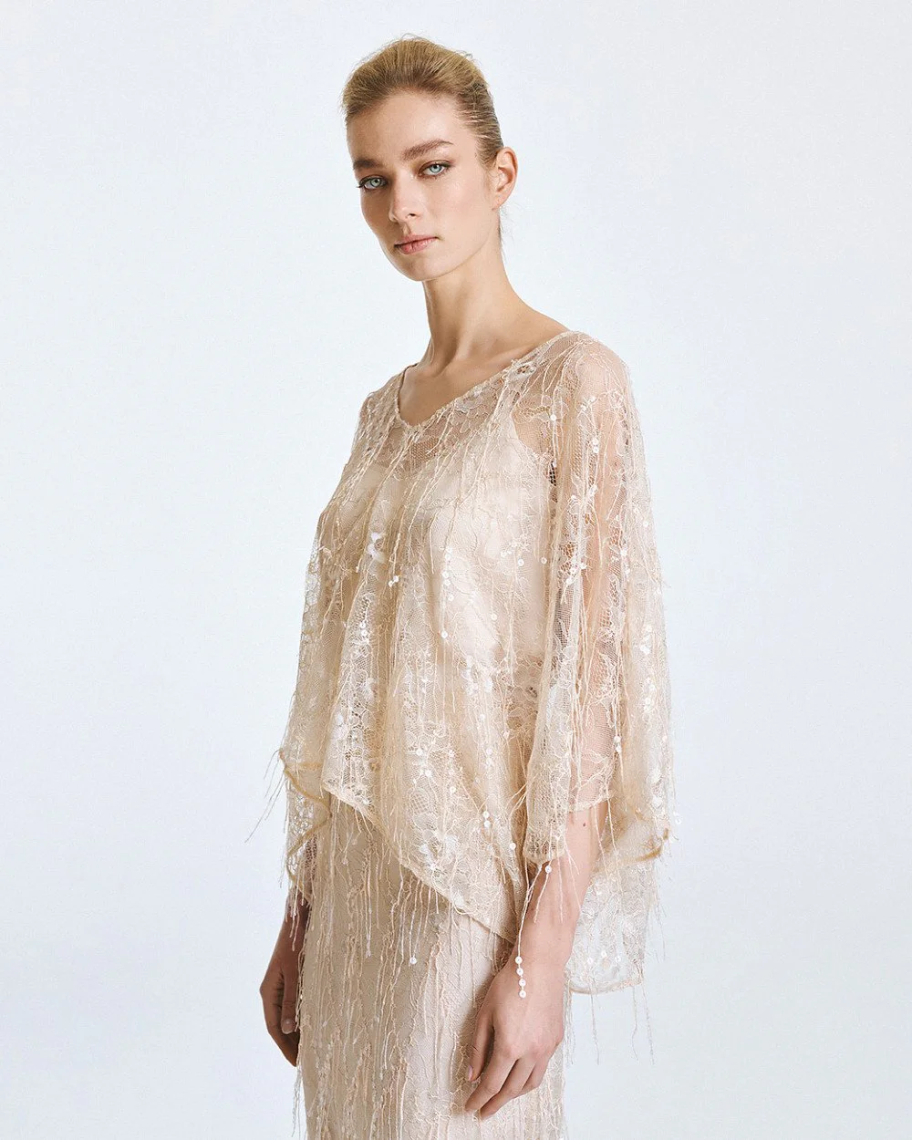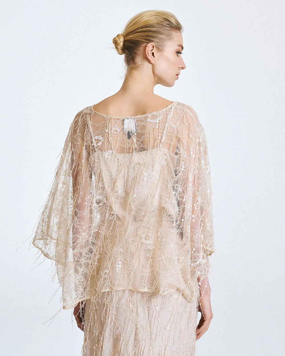 Lace blouse with 3/4 wide sleeves and fringe with sequin details. Features a boat neckline and a detachable satin top with adjustable straps.