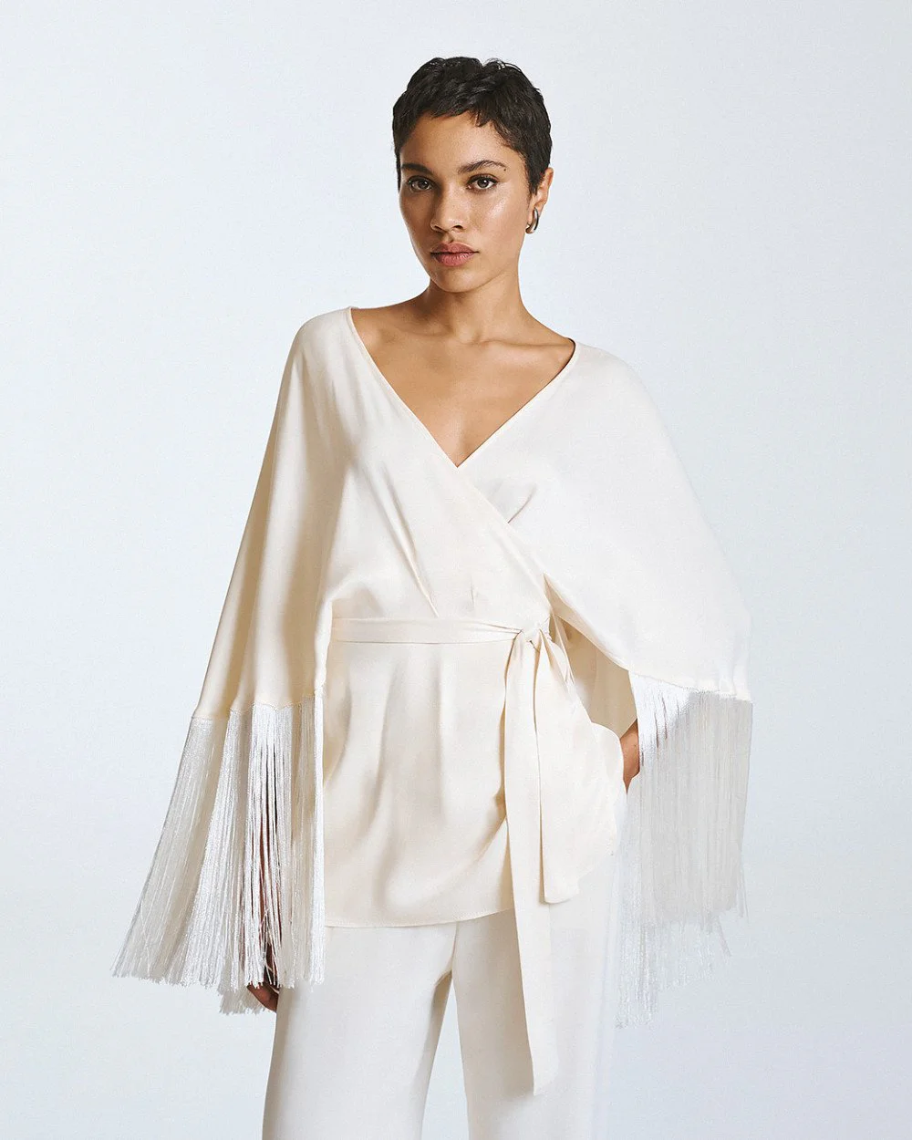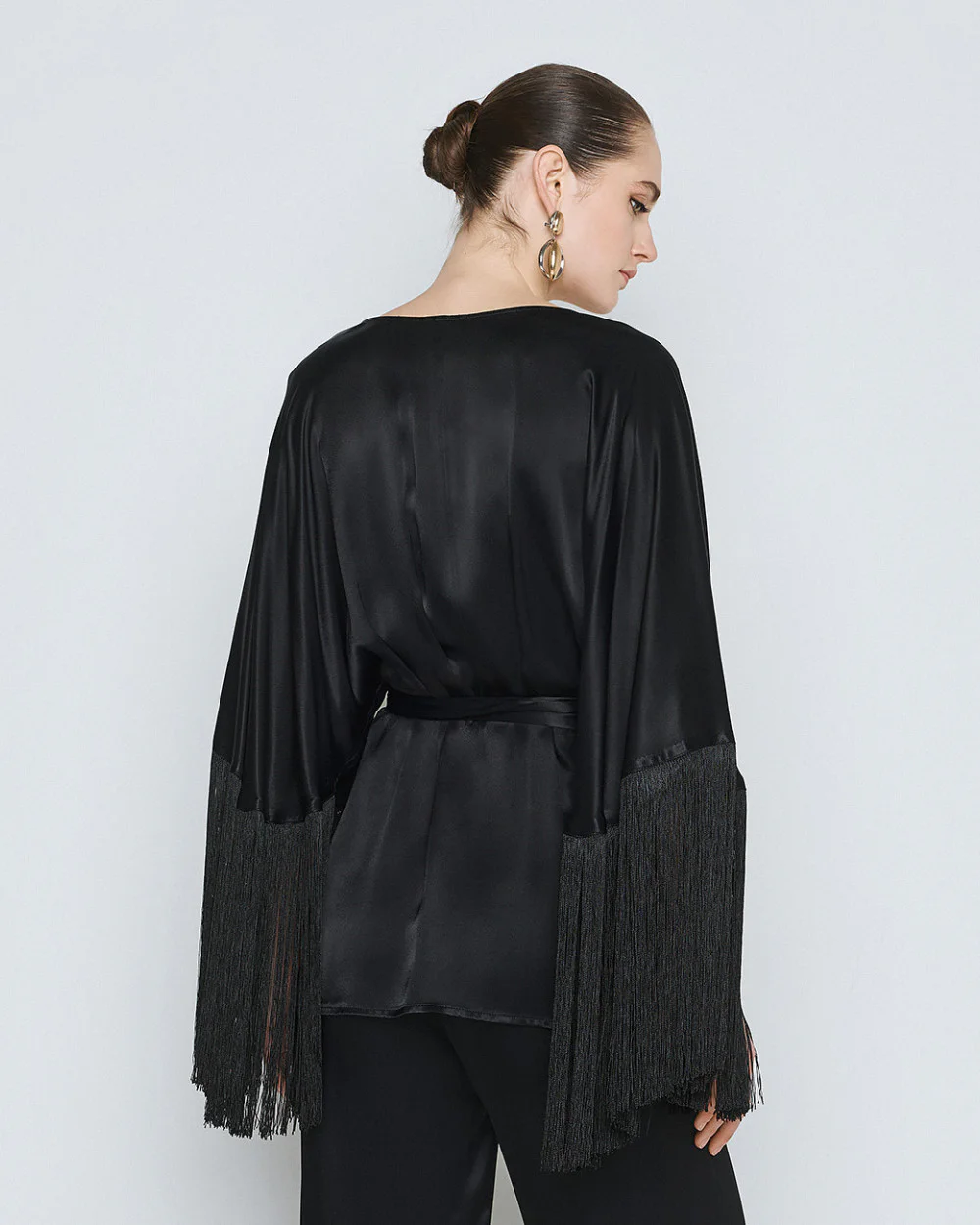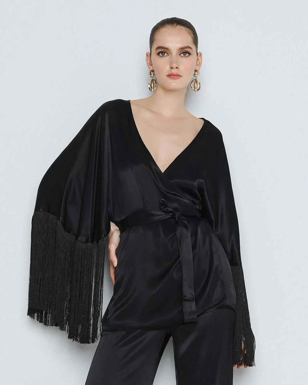 Wrap blouse with front tie fastening, a satin finish and 3/4 bell sleeves with fringe.