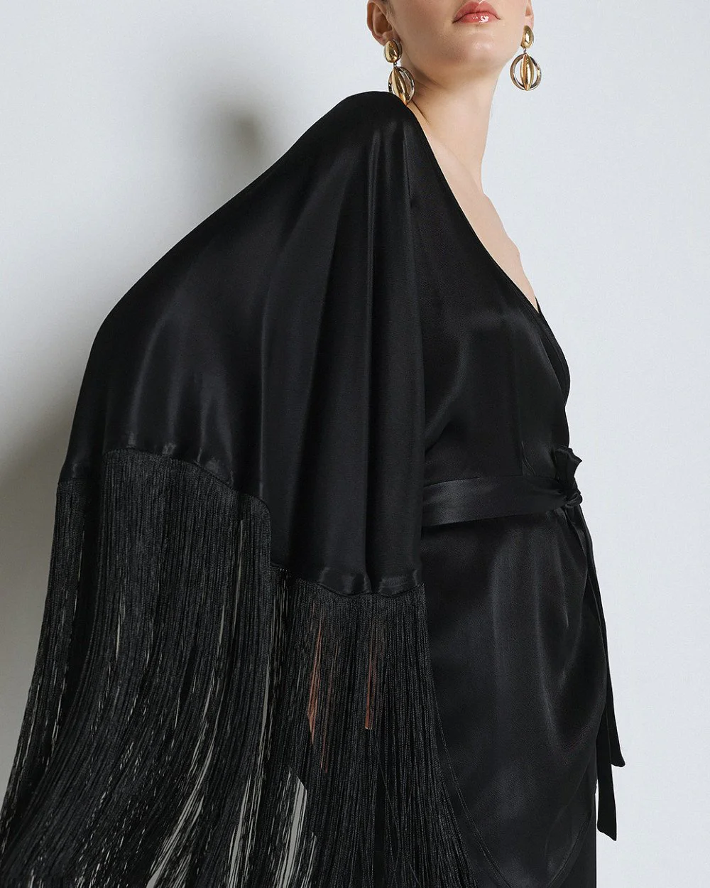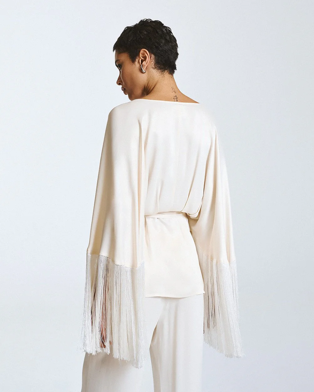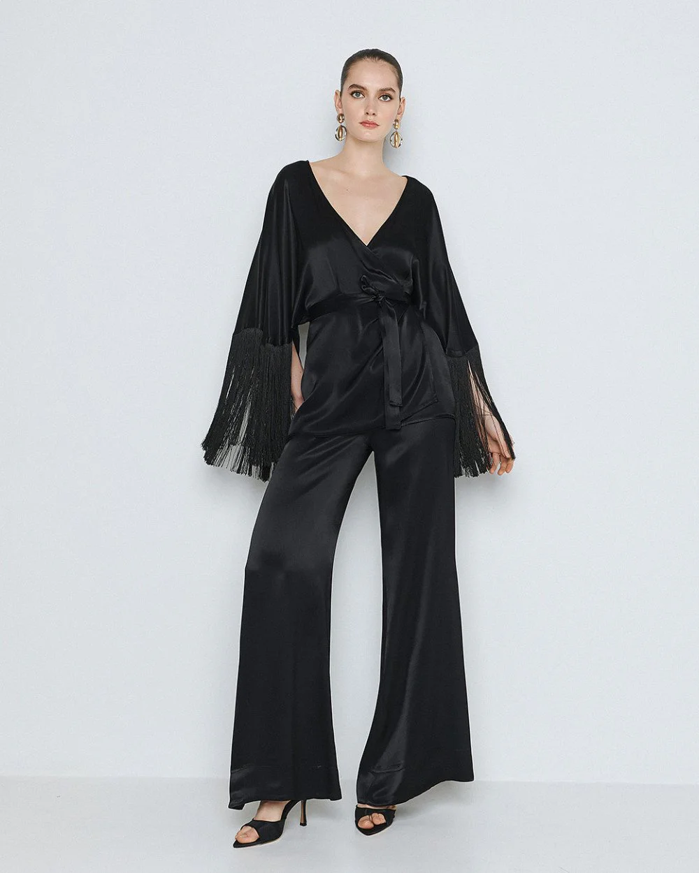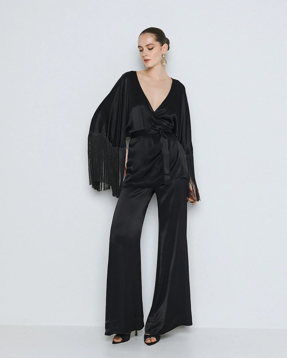 Wrap blouse with front tie fastening, a satin finish and 3/4 bell sleeves with fringe.