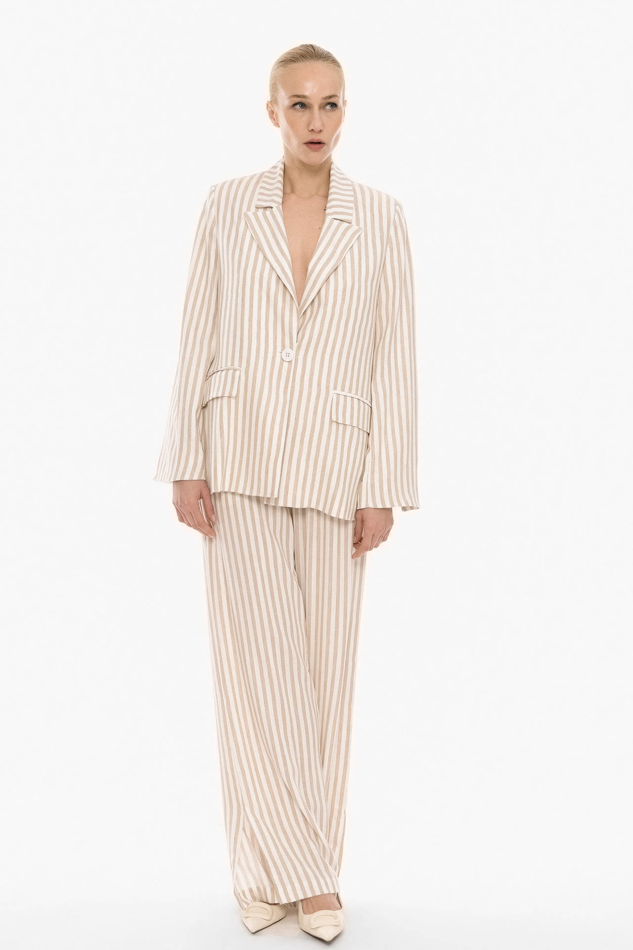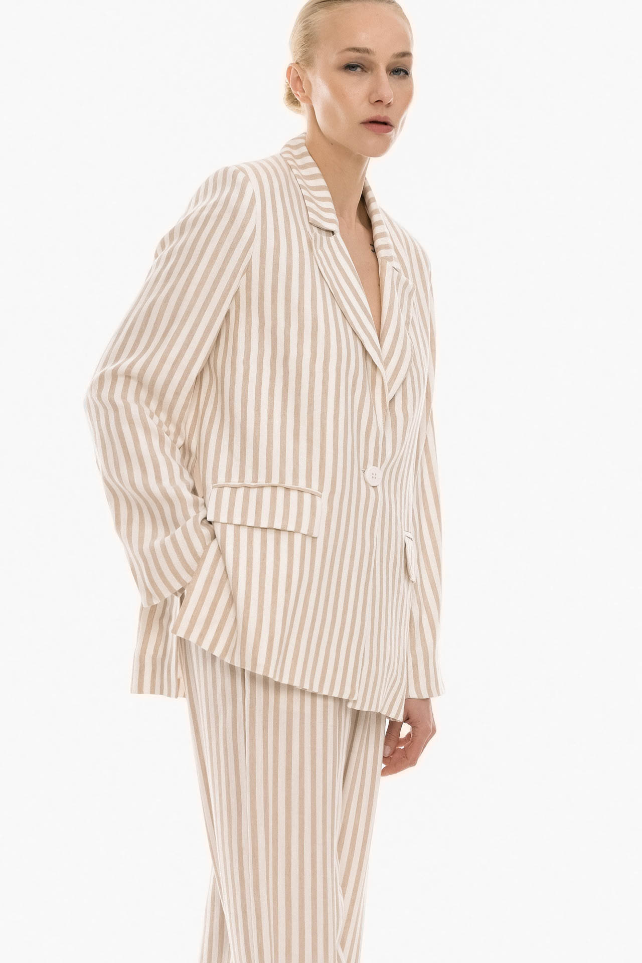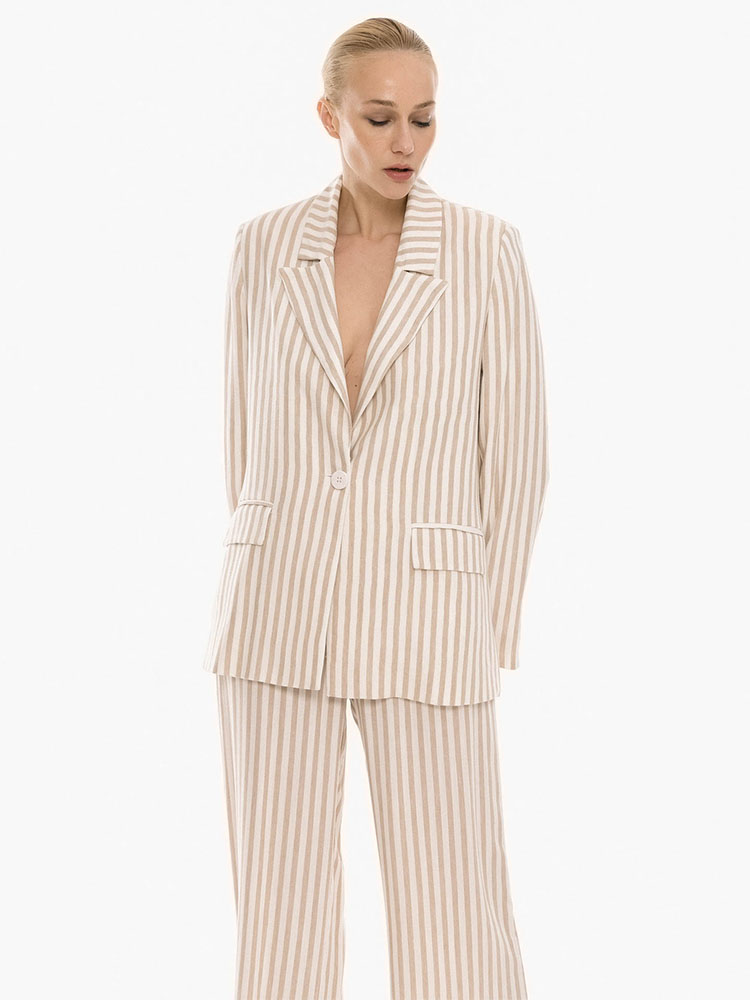 This tailored striped blazer crafted from lightweight fabric, it features a vertical stripe pattern. The structured design is enhanced by a classic notched lapel and a single-button closure.
