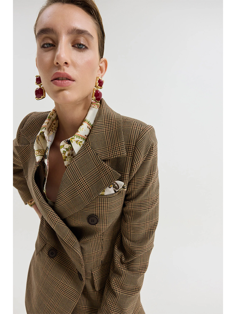 The Scotch blazer from Hemithea is a retro-inspired piece that effortlessly combines classic style with modern flair. Featuring a bold collar, structured shoulders, and a slightly tailored long fit, it adds sophistication to any outfit. The plaid pattern in brown and khaki tones, paired with a cream paisley printed lining, creates a unique and stylish look.