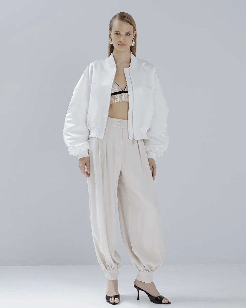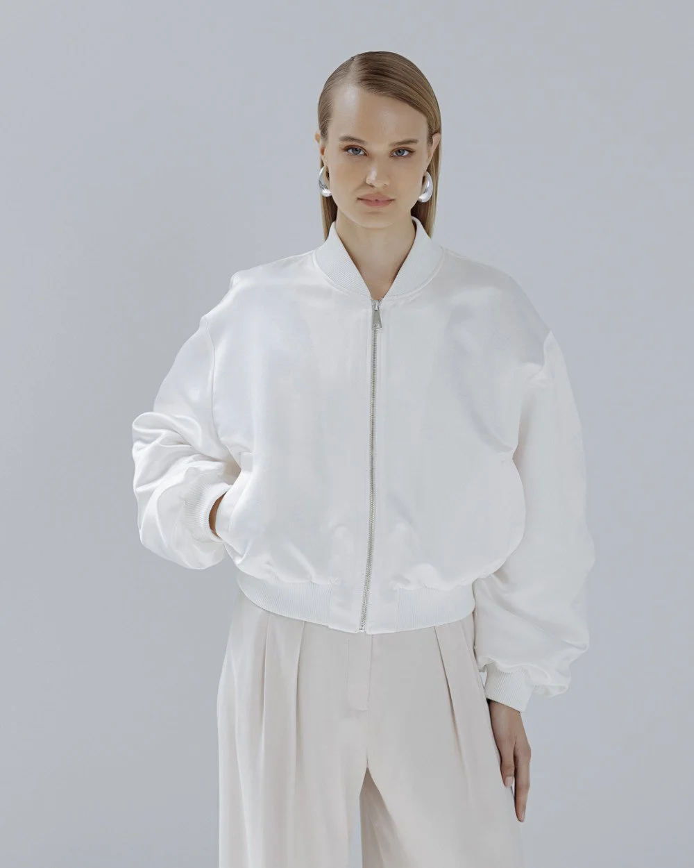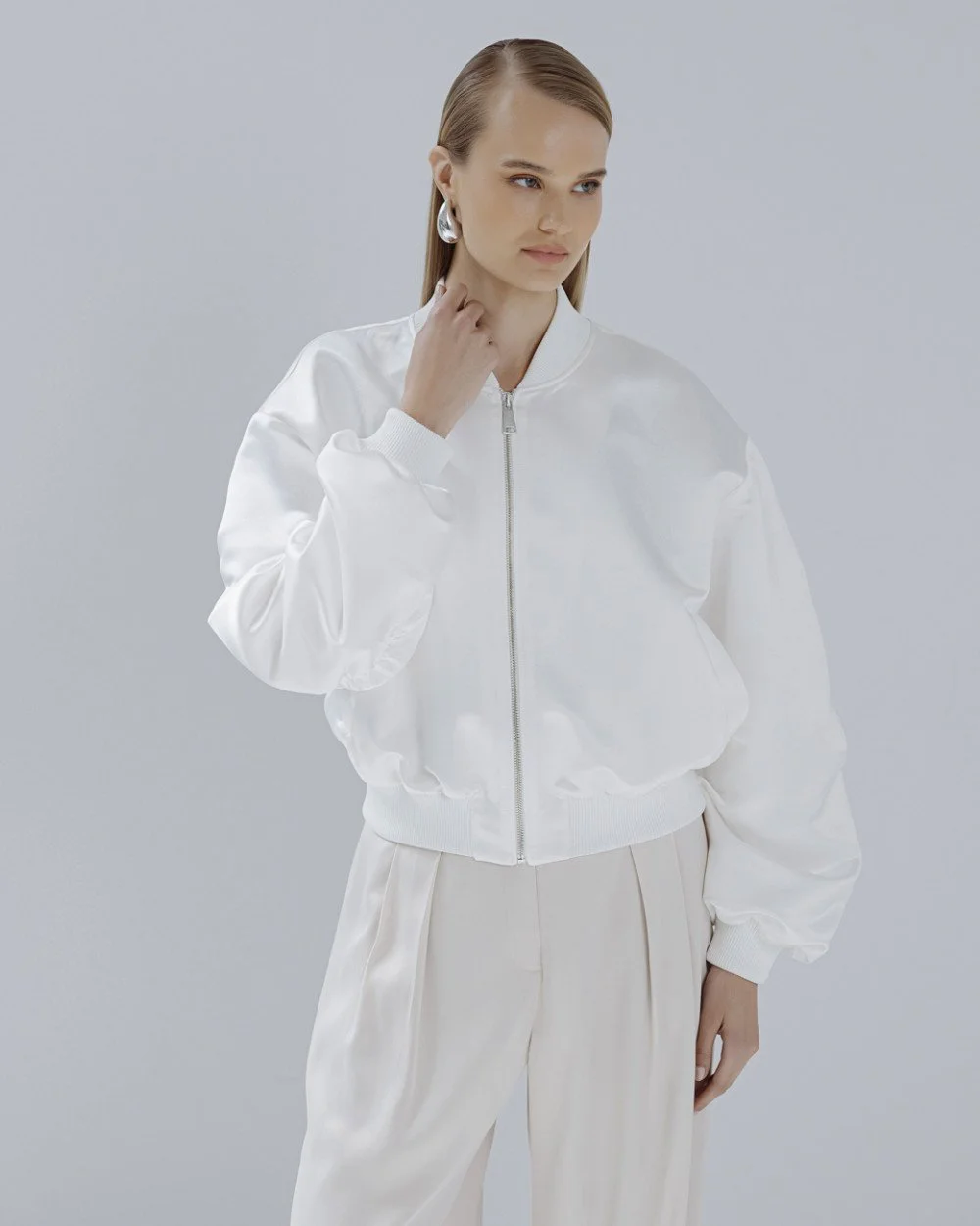 Bomber jacket with a shiny texture, ribbed neckline and long balloon sleeves with gathers. Features side pockets, elastic ribbed cuffs and front zip closure.
