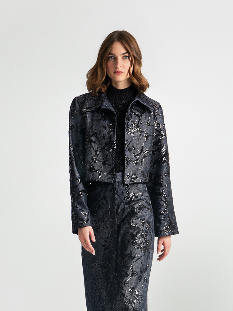 Shine with sophistication in this black cropped sequin jacket, designed to bring glamour to any outfit. Crafted from stable fabric with an elegant sequin finish, it features a sharp collar, long sleeves, and a boxy cropped silhouette for a modern twist. Perfect for layering over dresses, tops, or paired with the matching trousers this jacket is a statement piece for evening occasions and stylish events.