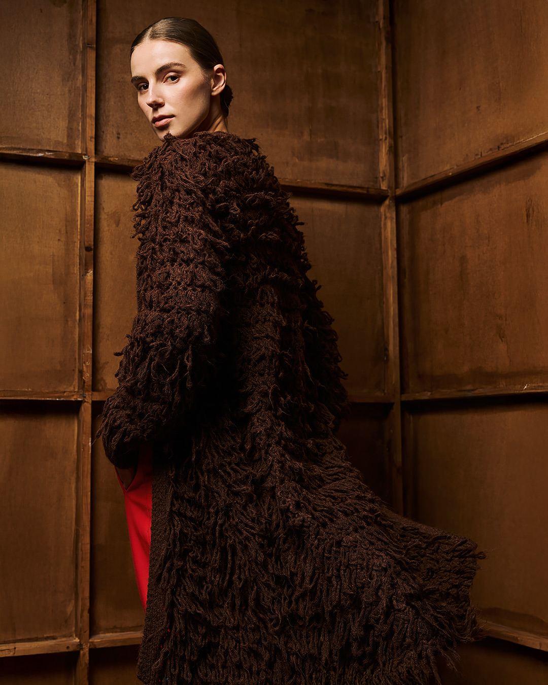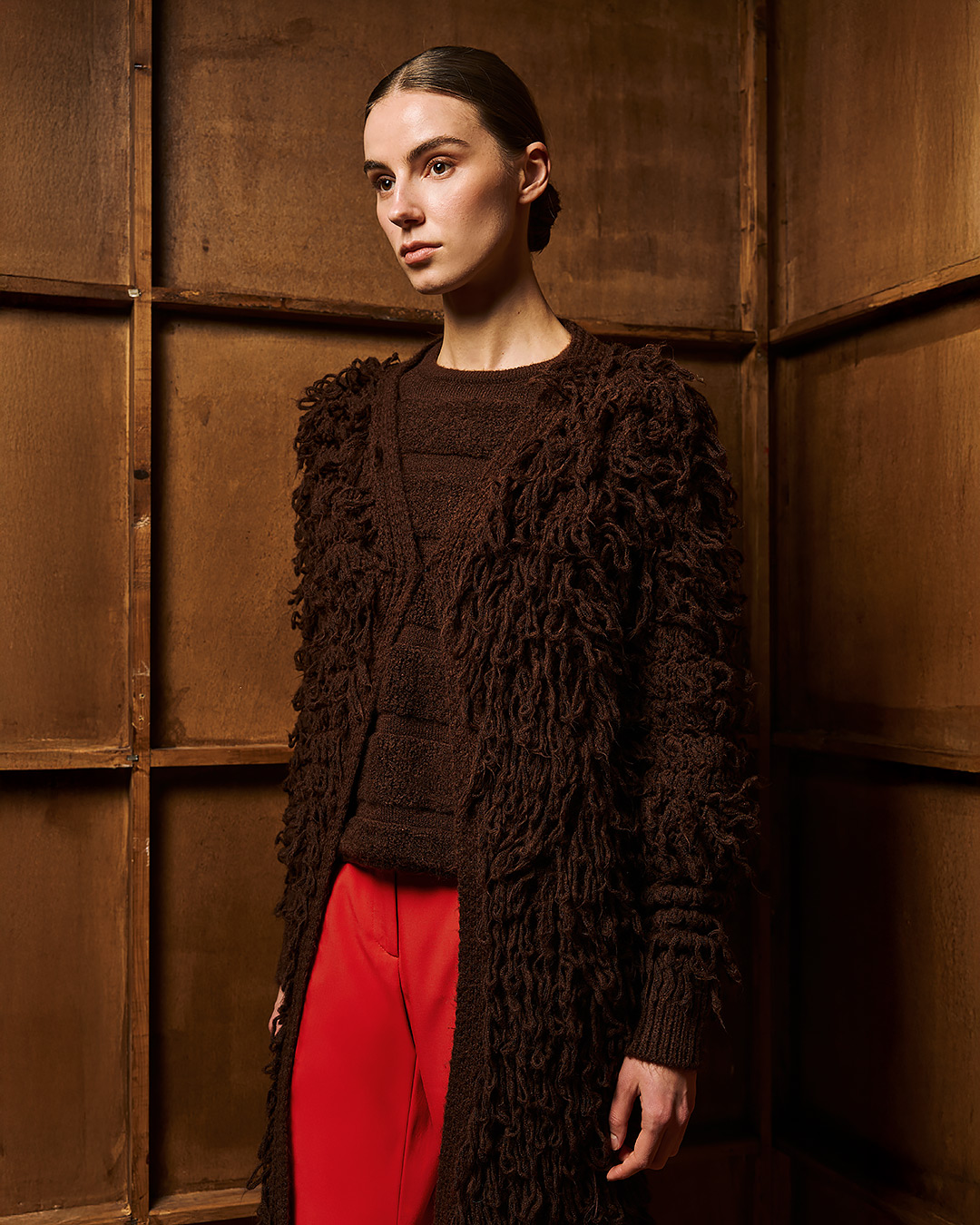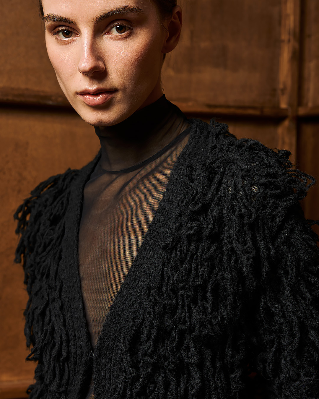 Long fringed knit cardigan, a bold layering piece that combines comfort with eye-catching texture. Crafted in soft knit fabric, it features all-over fringe detailing that creates movement.