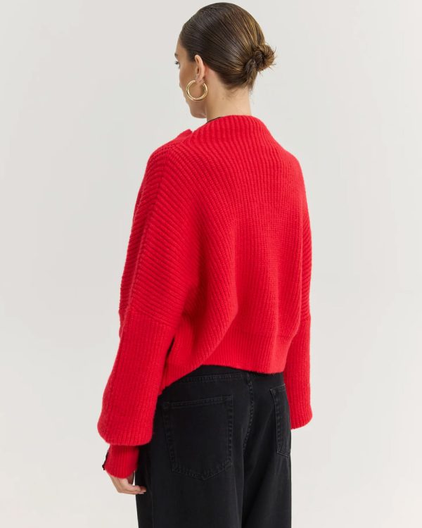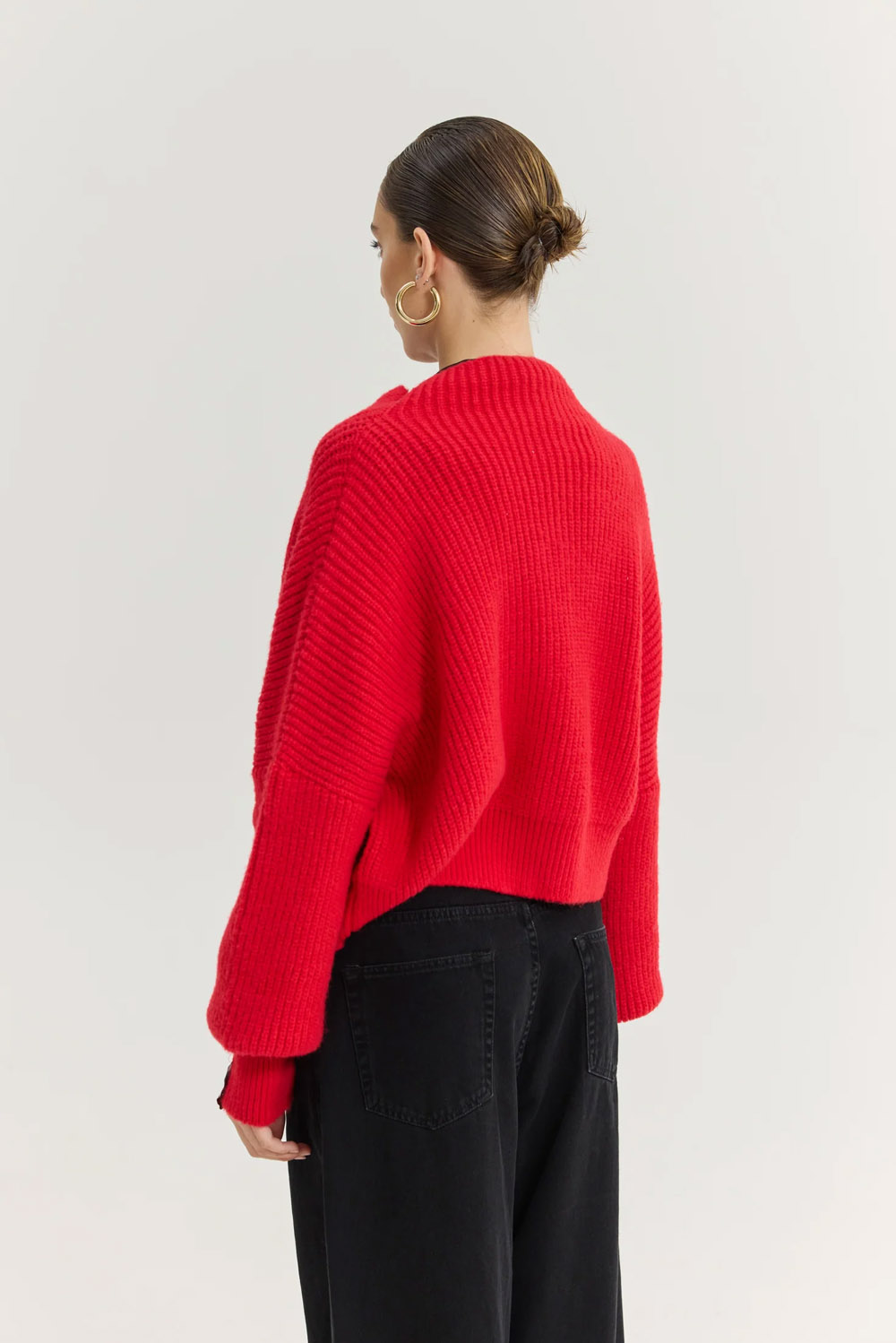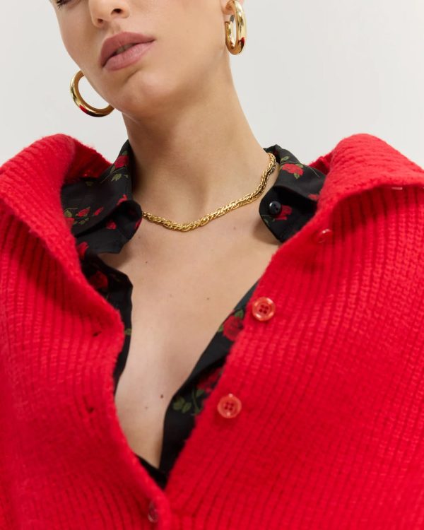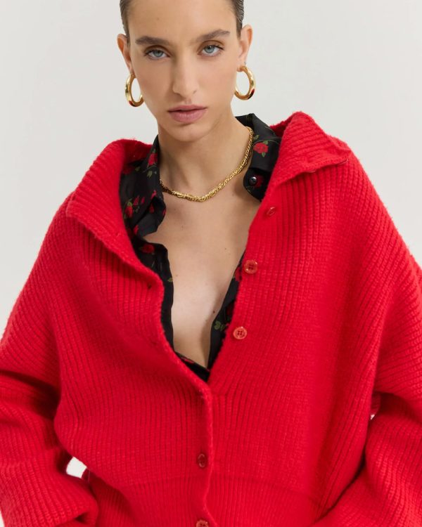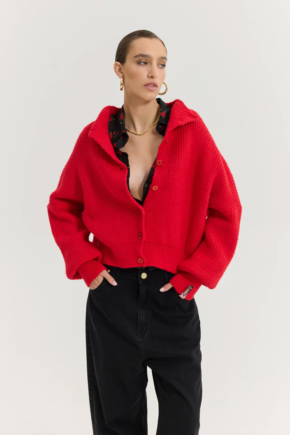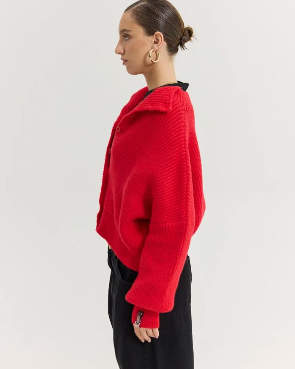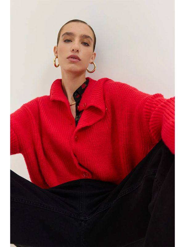 The Martinez cardigan from Hemithea is an oversized, cropped knit in a bold red hue. Featuring a high collar, button-front closure, long wide sleeves, and ribbed texture, it combines modern style with cozy comfort. A woven patch on the sleeve adds a subtle, distinctive detail.