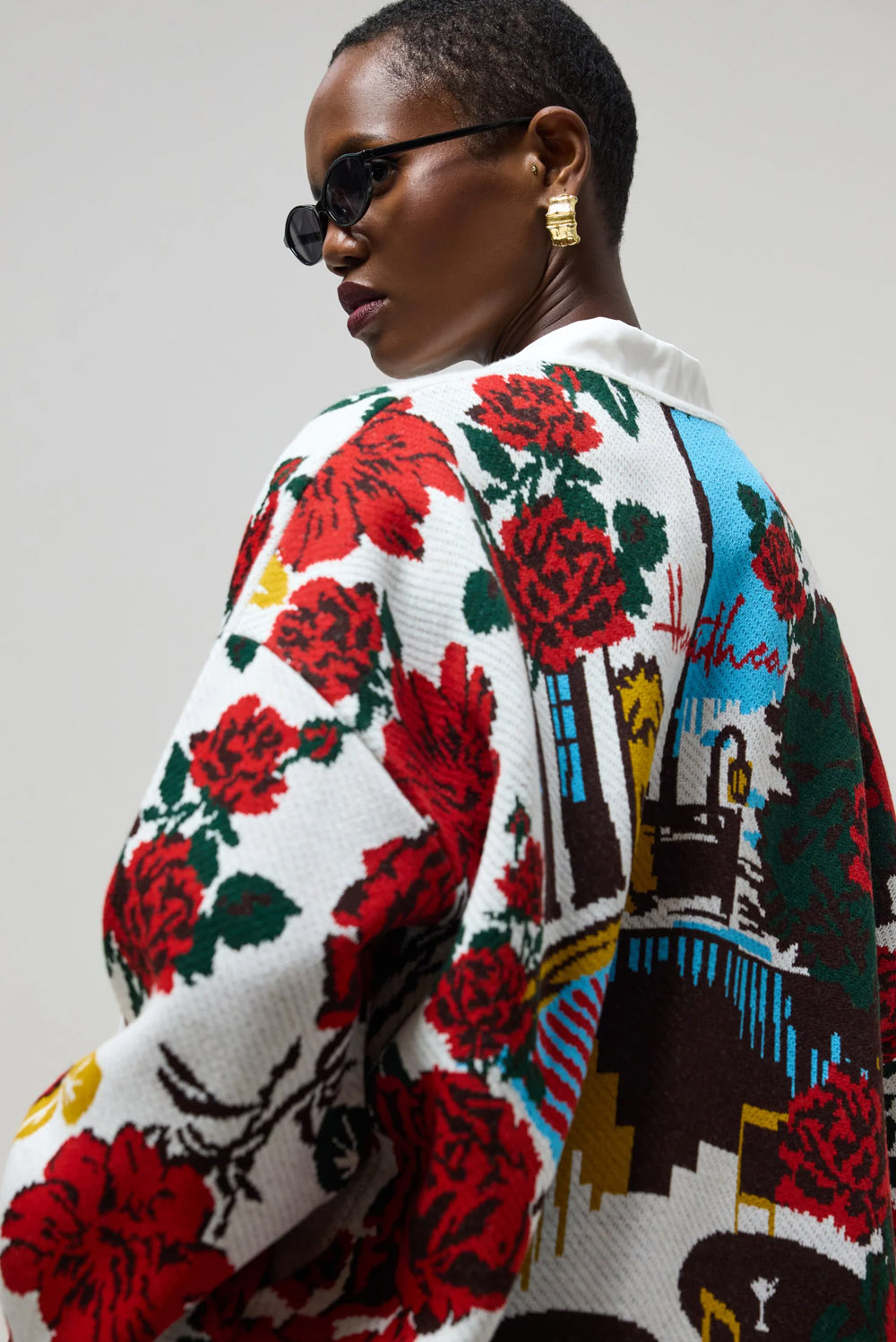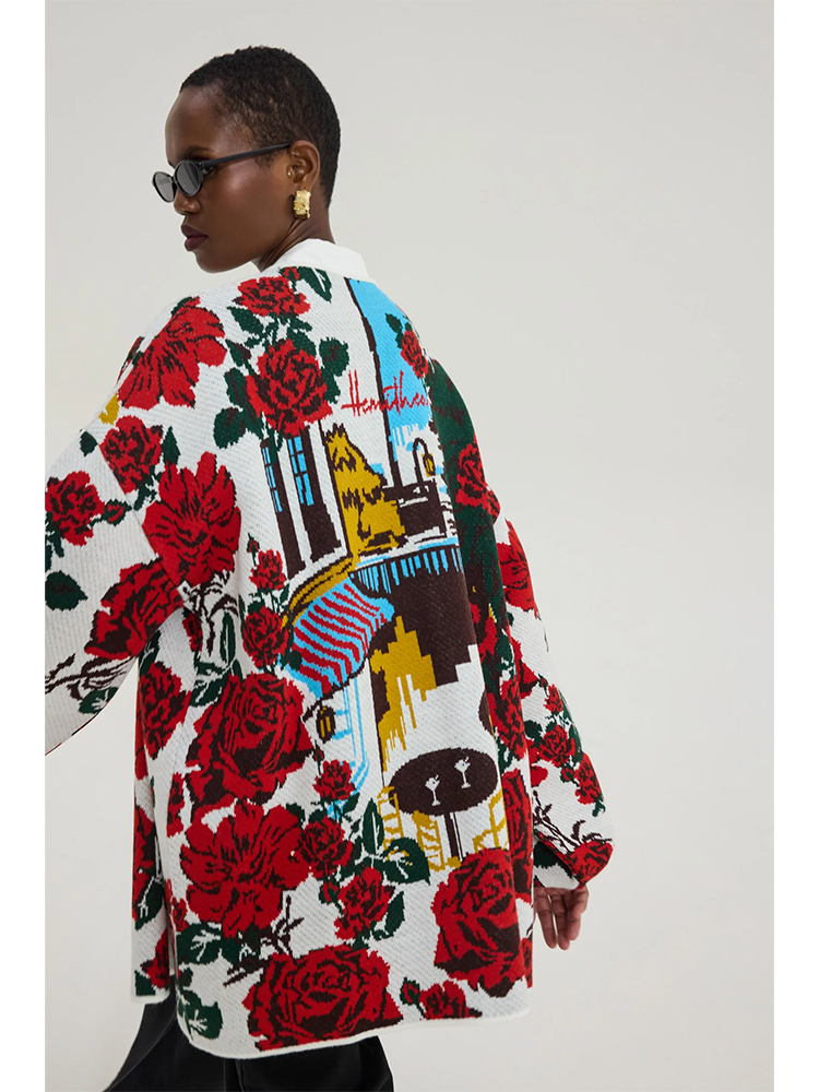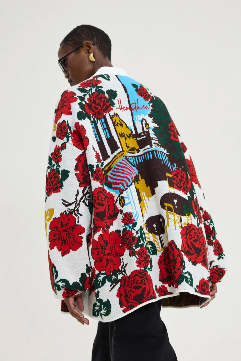 The Old Fashioned cardigan from Hemithea is a cozy, oversized knit crafted from ultra-soft Dralon. Featuring a jacquard floral pattern on an off-white background, it combines timeless charm with modern comfort, making it a versatile layering piece.