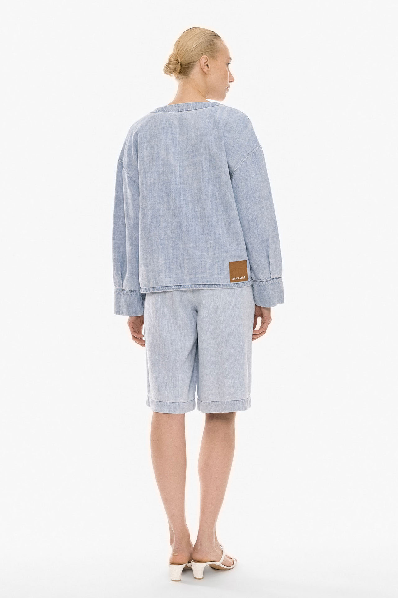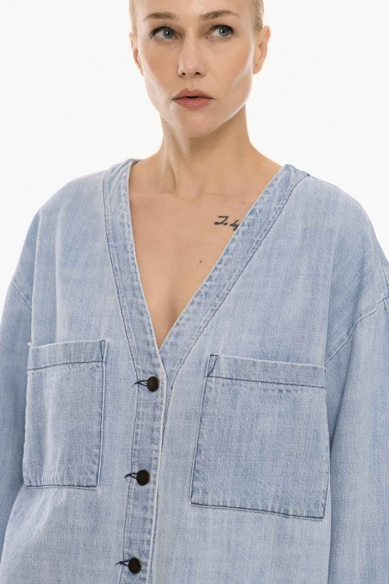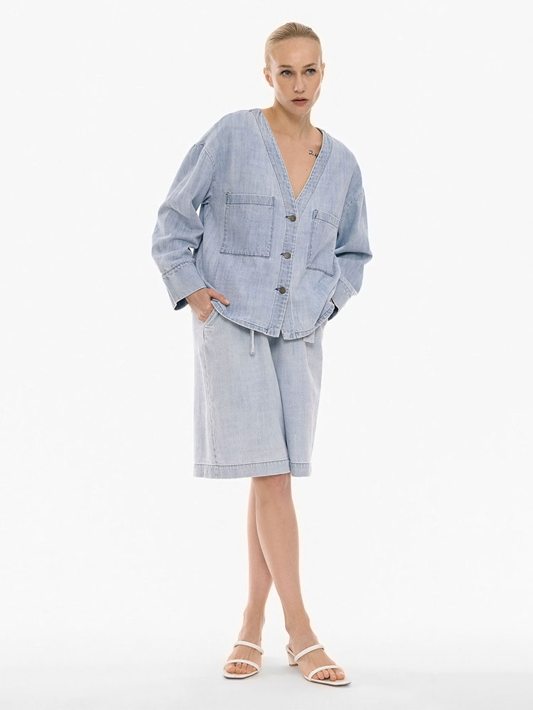 This relaxed-fit shirt jacket crafted from lightweight denim. The deep v-neckline and button-down front create a laid-back style, complemented by oversized front patch pockets. With its slightly boxy silhouette and dropped shoulders.