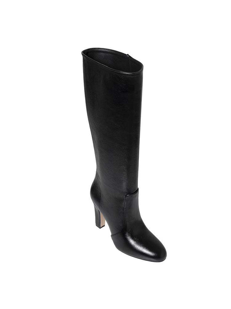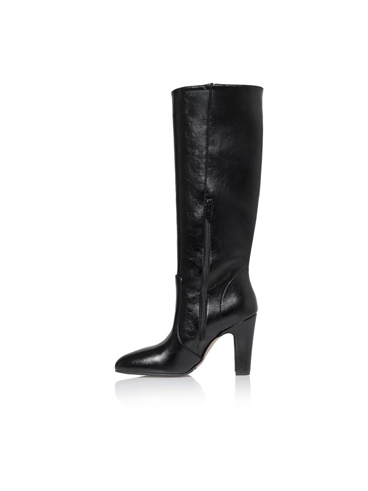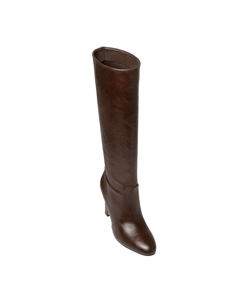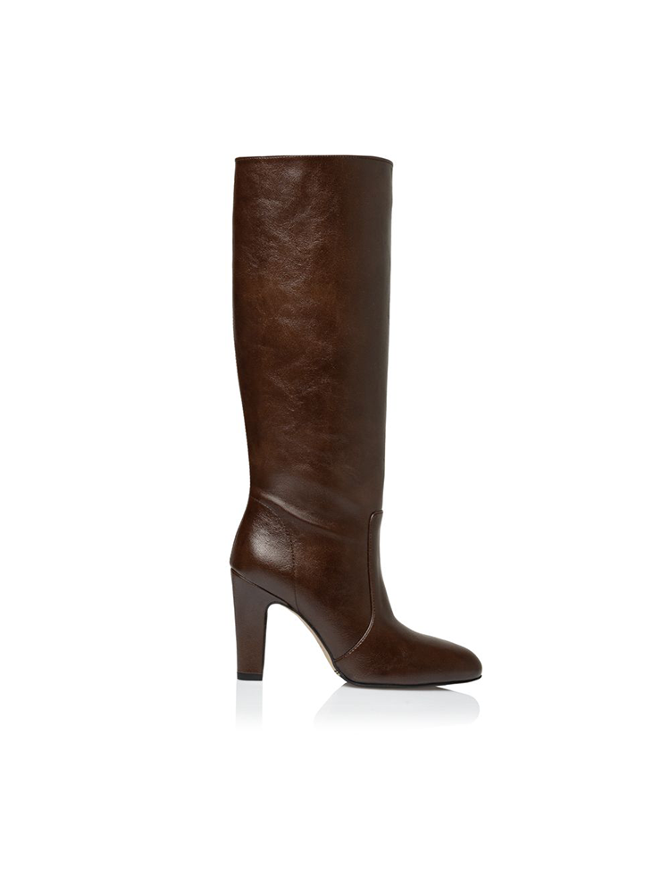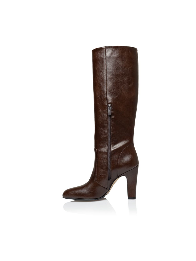 These knee-high boots are made from smooth leather with a subtle sheen, they feature a clean silhouette that hugs the leg beautifully. The rounded toe and structured shaft create a refined balance between classic elegance. A sturdy high block heel adds height while maintaining comfort and stability.