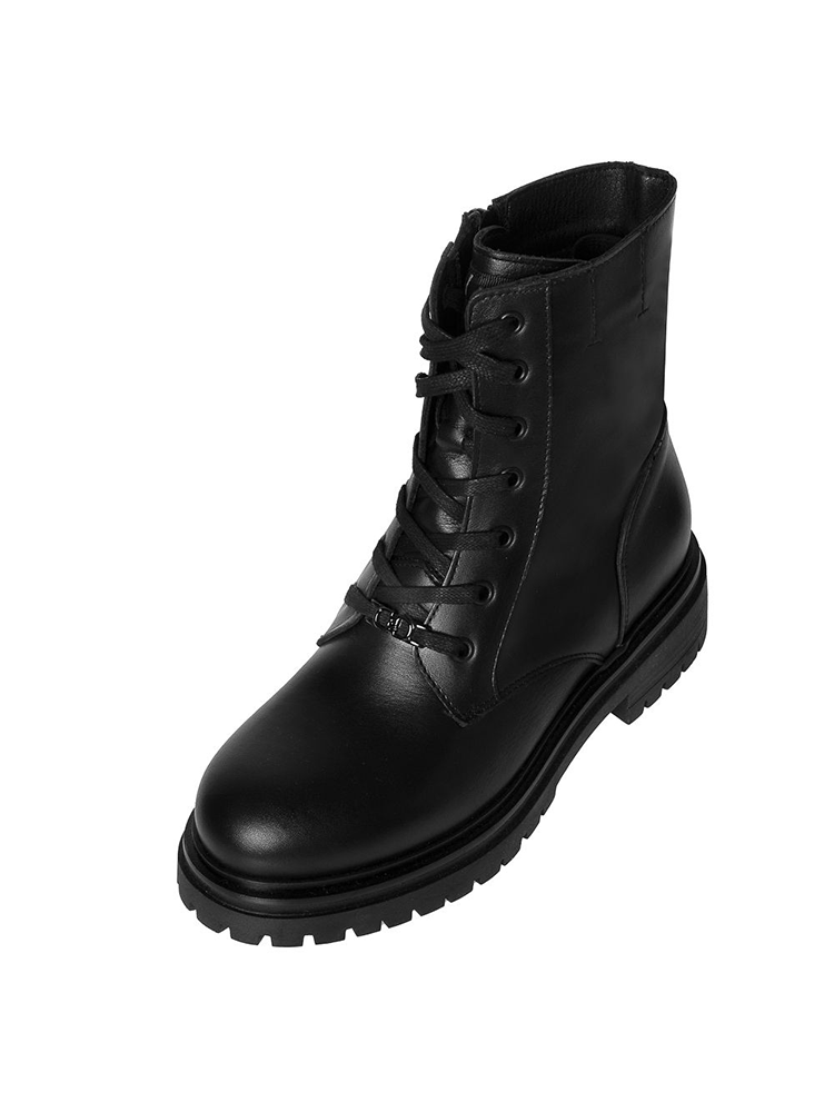 Black lace-up boots are a versatile choice for everyday wear. Featuring a rugged sole and sleek leather upper, they combine practicality with a modern edge.