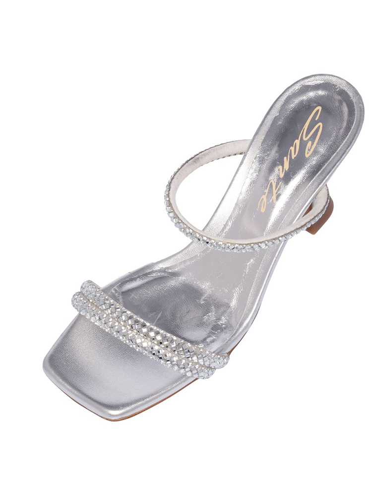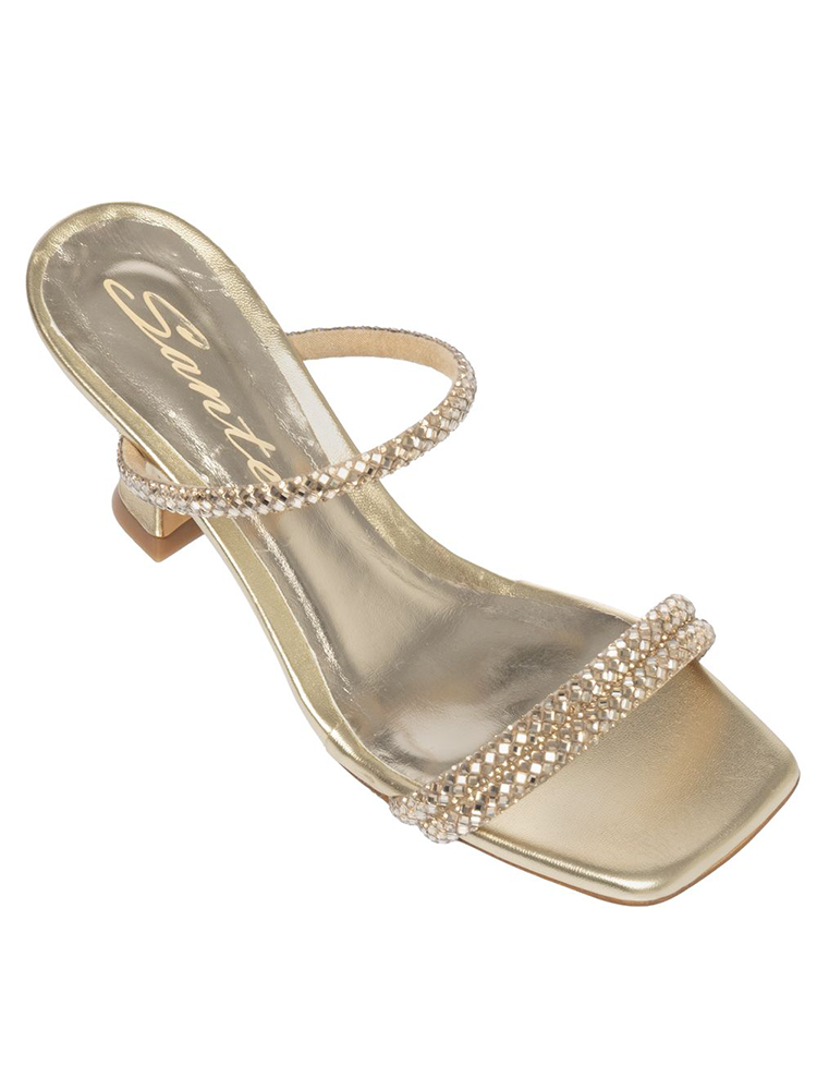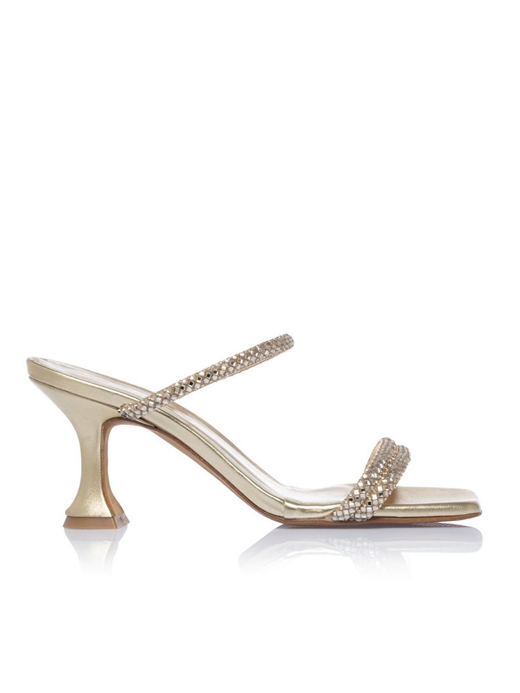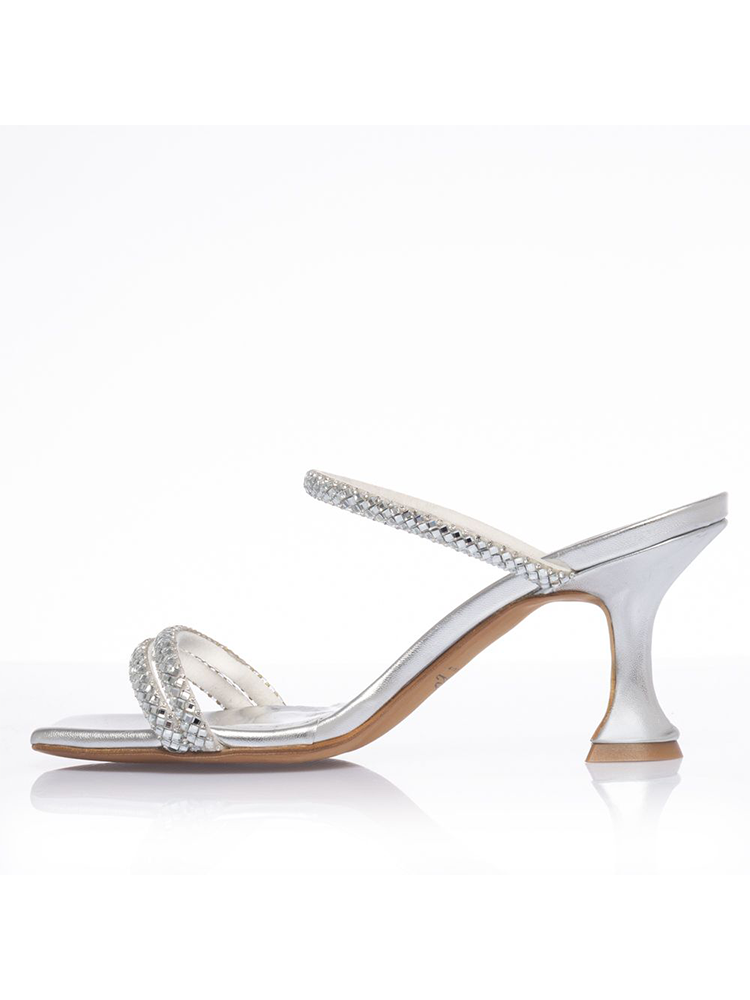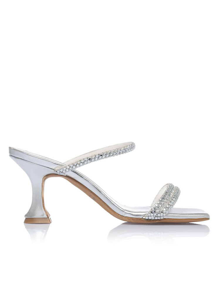 Mule heels featuring a sleek metallic finish with open-back design, complemented by beautifully embellished straps. The square toe adds a modern edge, while the sculpted mid-height heel offers style.