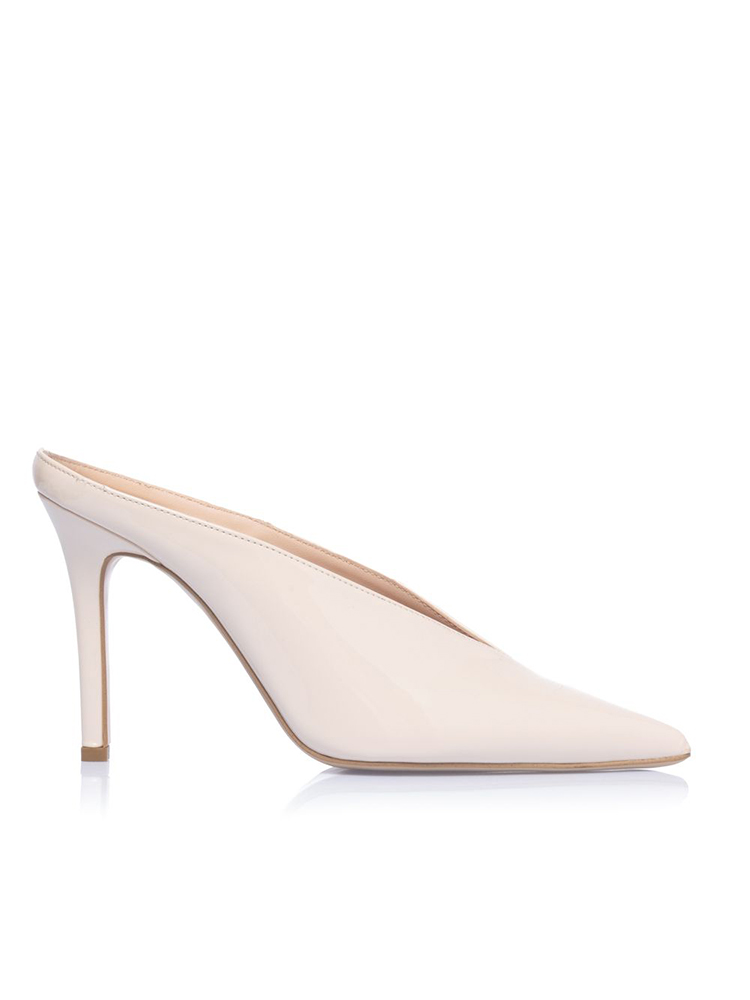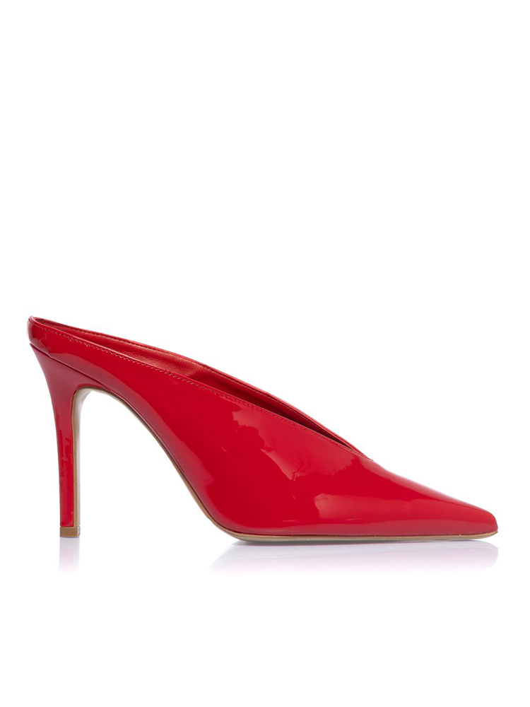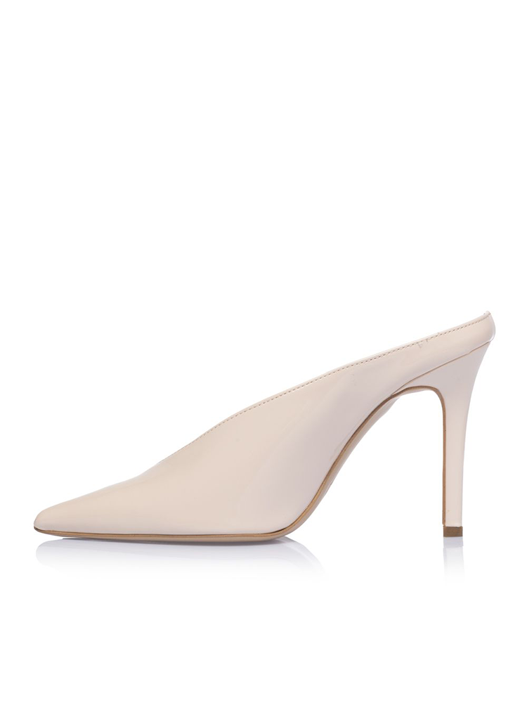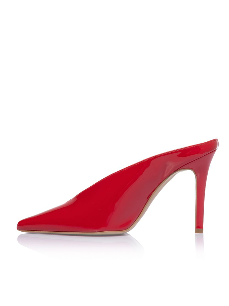 Patent mule heels, designed with a glossy finish, this shoe features a sharp pointed toe. The slip-on mule style offers effortless wear, while the high stiletto heel adds height.