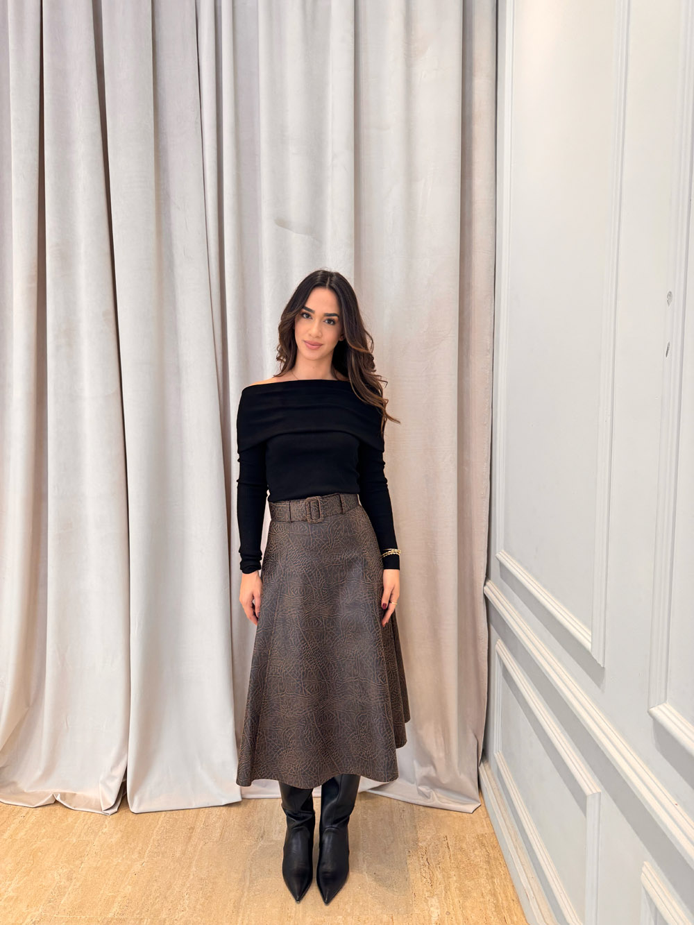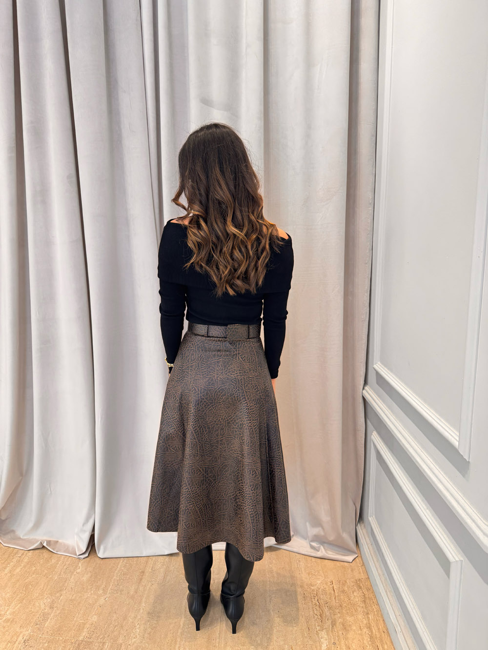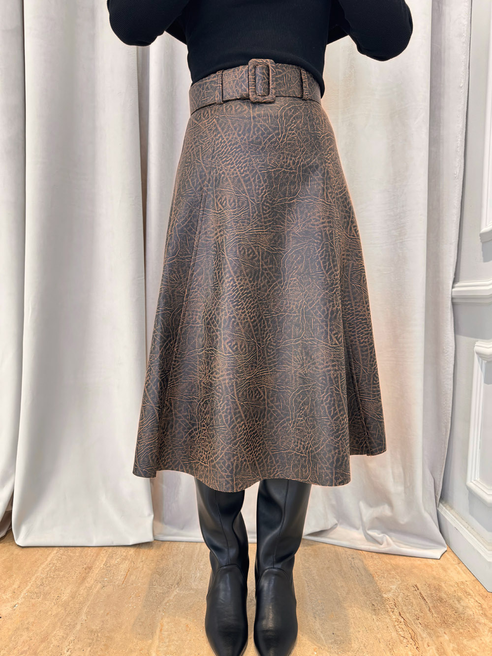 A-line midi skirt crafted from textured fabric, the flattering a-line silhouette cinches at the waist with a matching belt. Its midi length makes it versatile for both office and evening wear, while the neutral brown tone ensures easy pairing with a variety of tops.