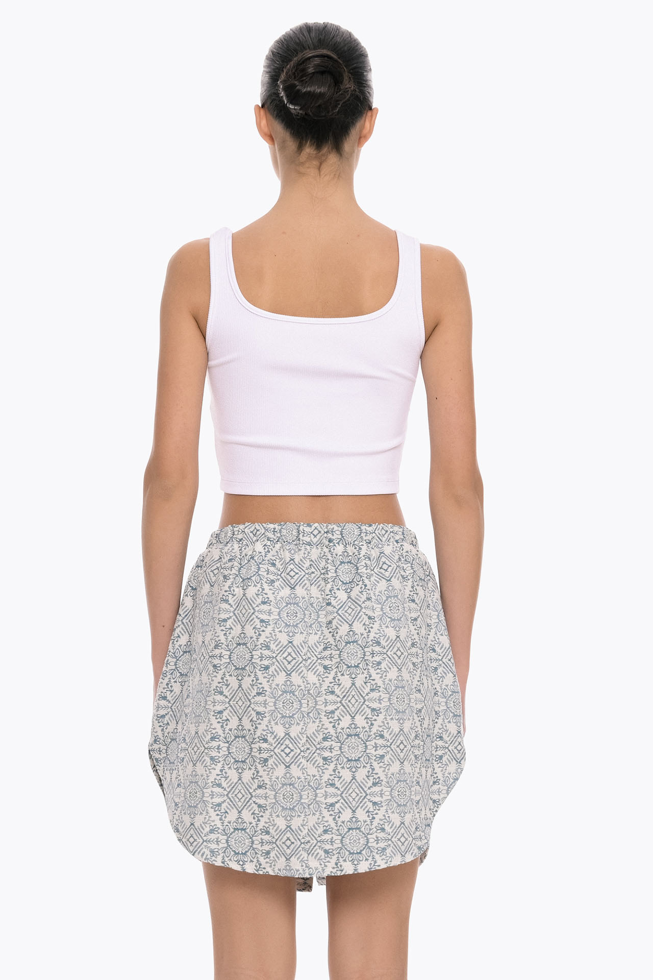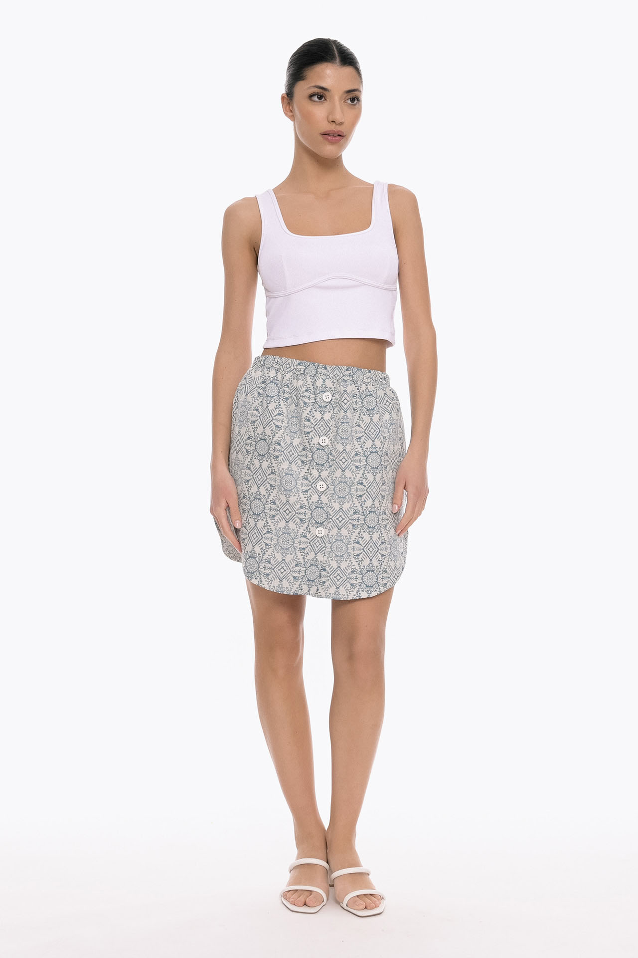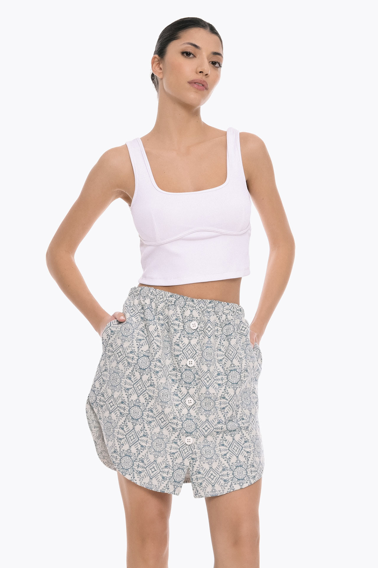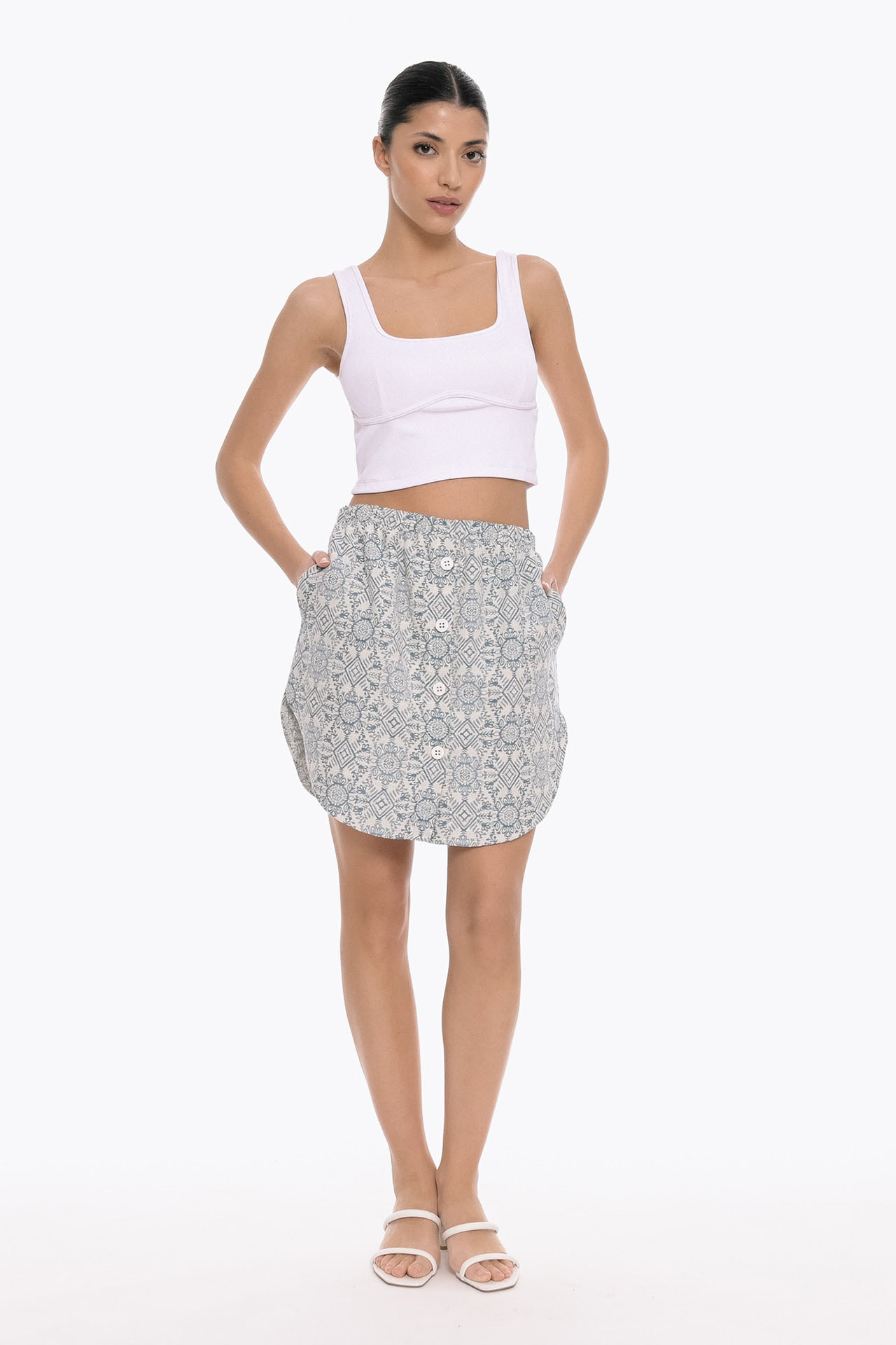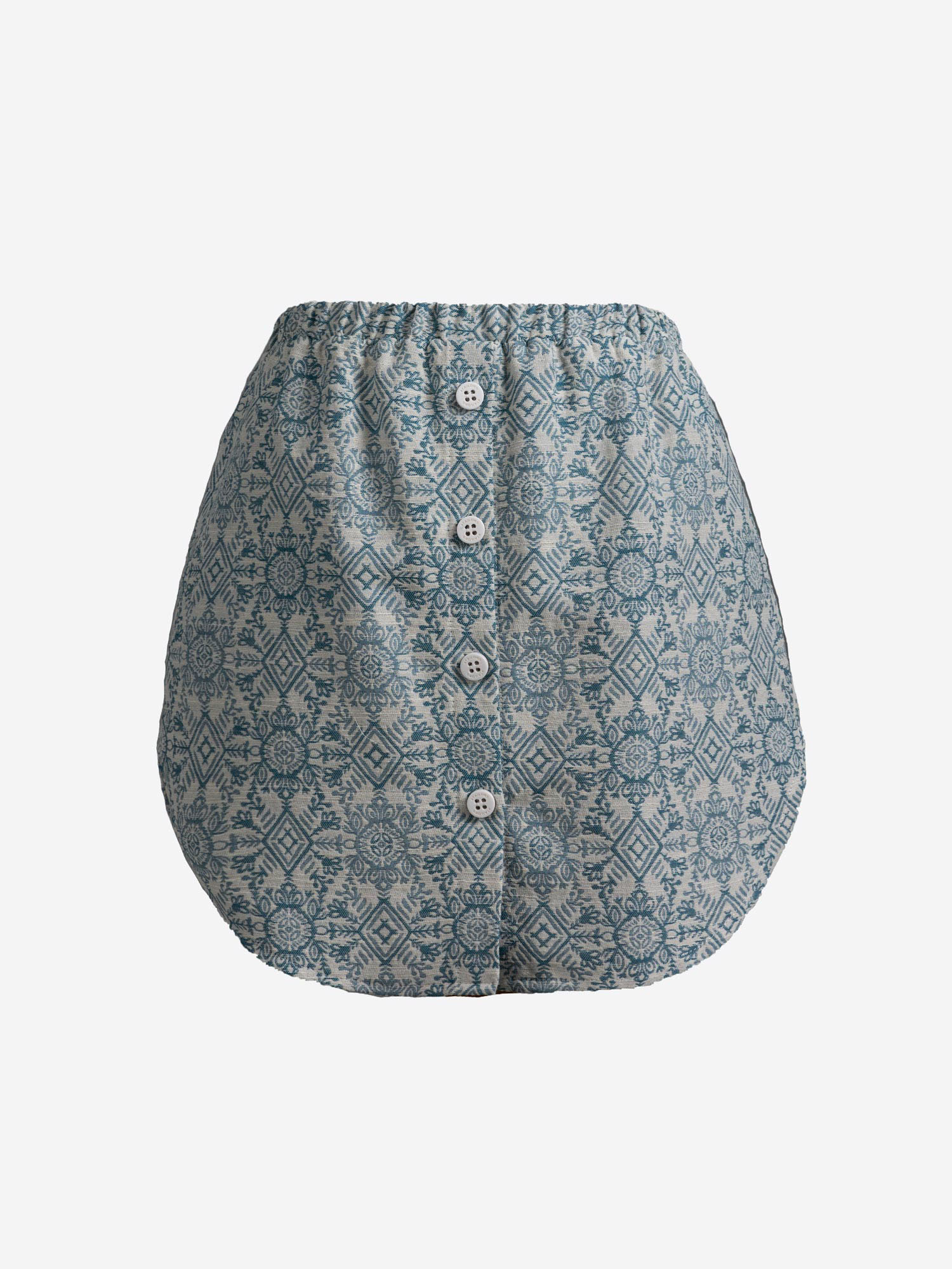 This mini skirt crafted from lightweight fabric, it features an all-over subtle geometric print. The skirt sits comfortably at the waist with a soft, elasticated band. The front button detailing enhances its casual charm, while the slightly flared silhouette creates a flattering shape.