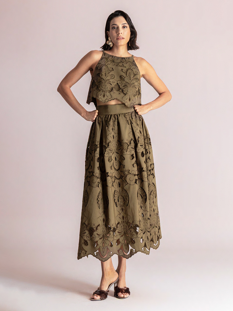 This midi skirt is crafted from a structured breathable fabric and features intricate tonal floral embroidery. Designed with a high-waisted fit, it falls into a softly silhouette. The scalloped hem with delicate cut-out detailing adds a feminine finish.