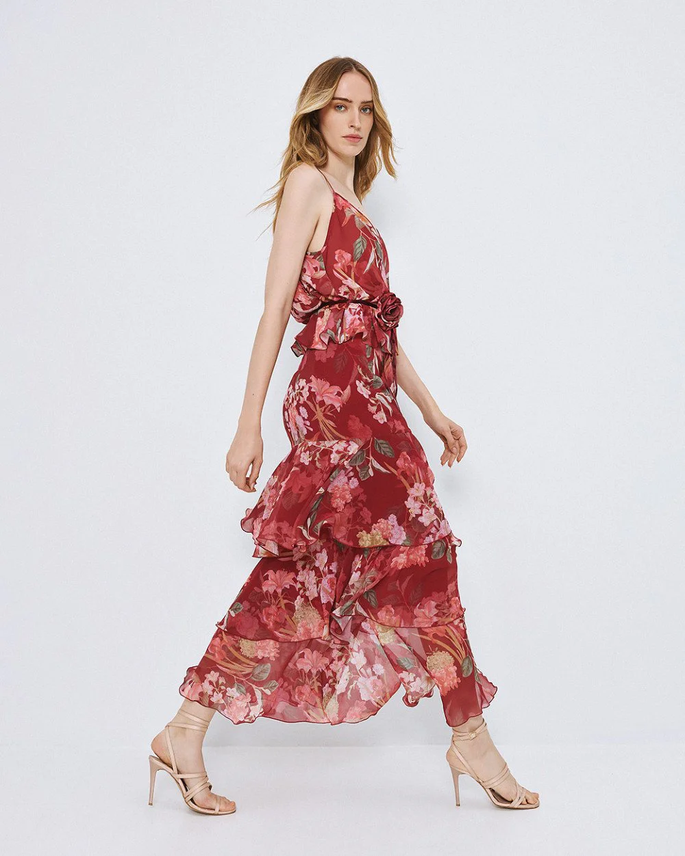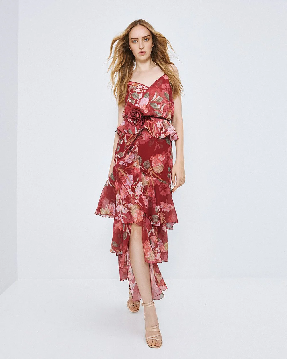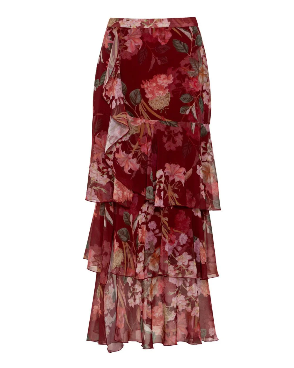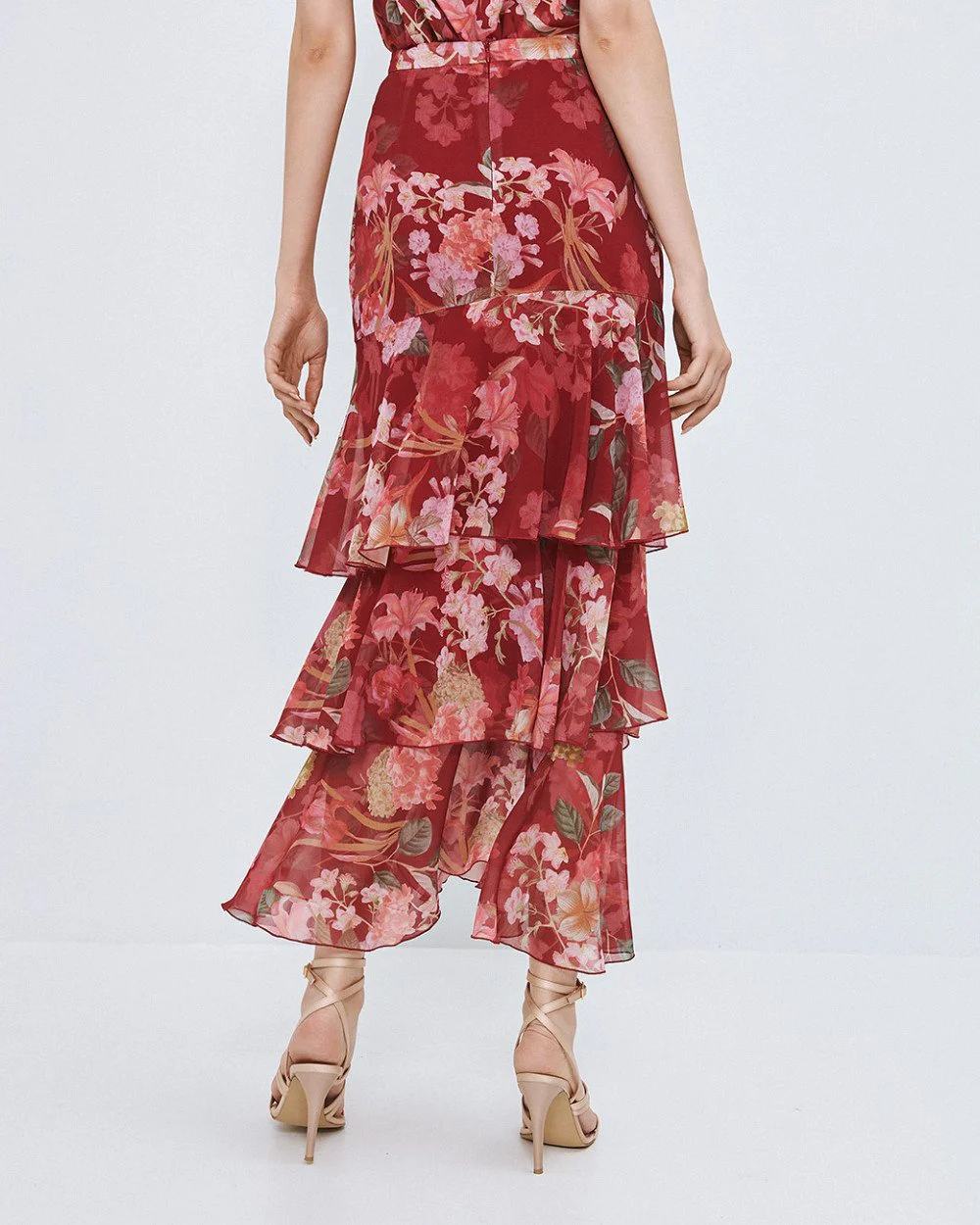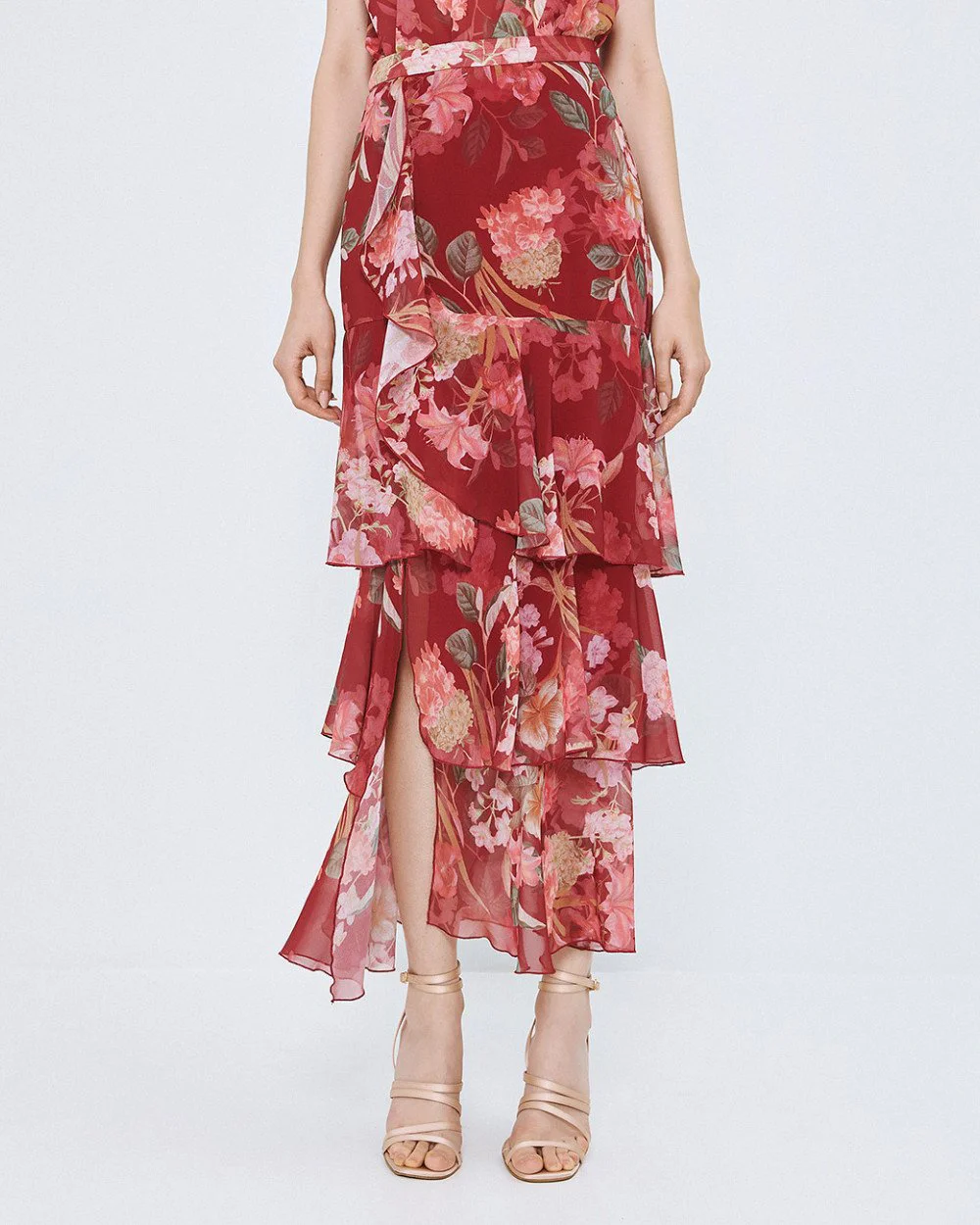 This floral skirt features a flowing, asymmetrical silhouette crafted from lightweight, semi-sheer fabric. Designed in delicate floral prints, it showcases tiered ruffle layers. The high-waisted fit enhances the figure, while the cascading hemline creates a dynamic look.