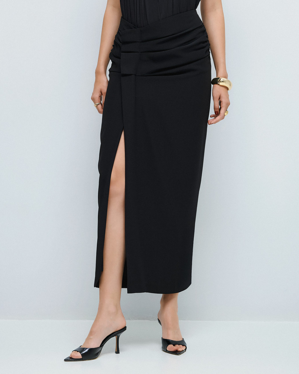 Maxi skirt with gathered details and a front slit. Perfect for stylish looks.